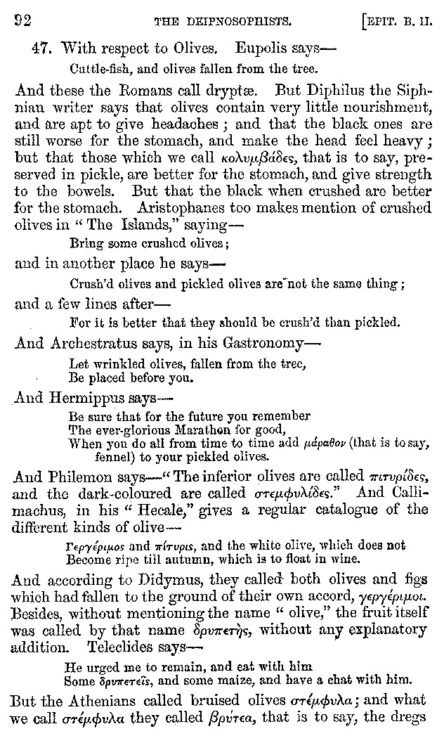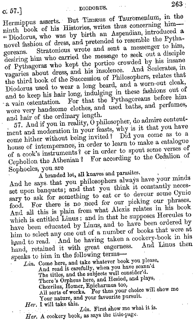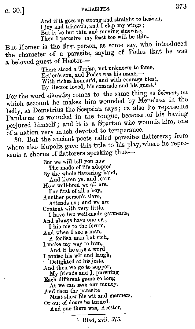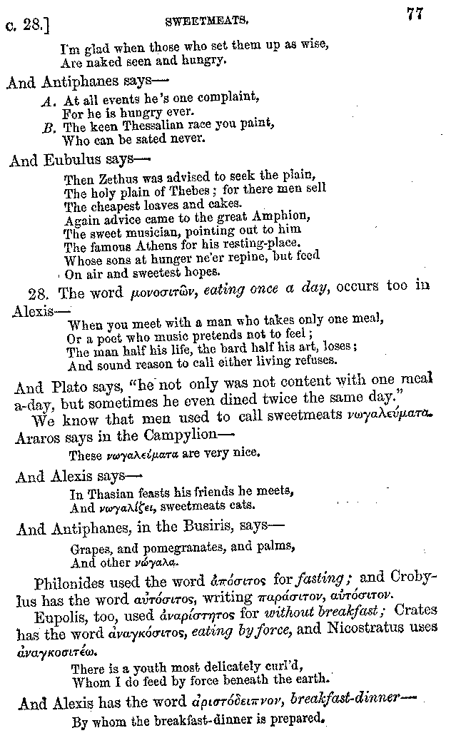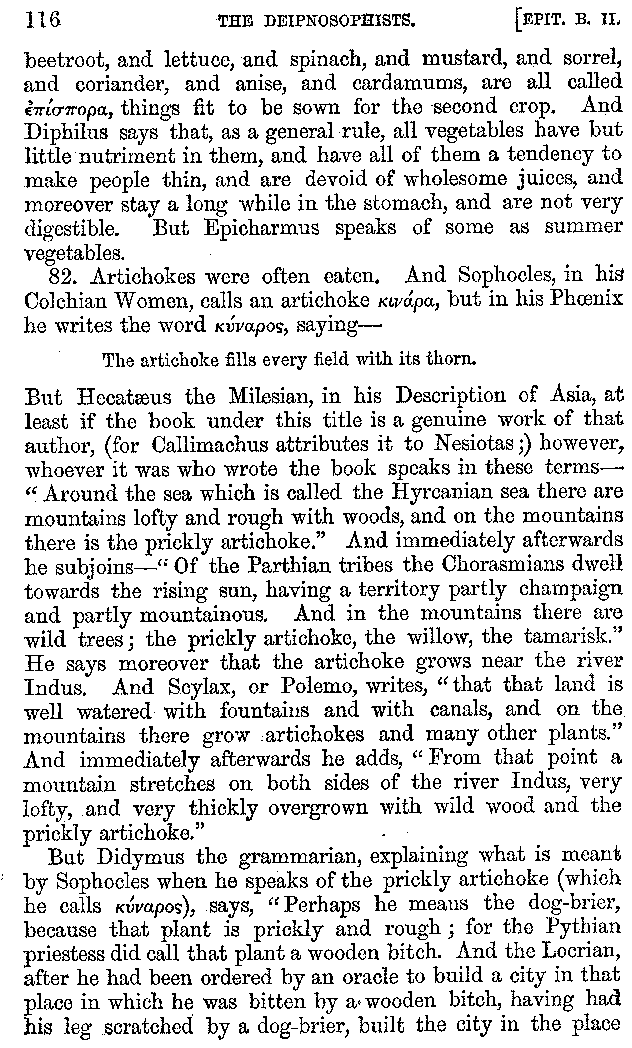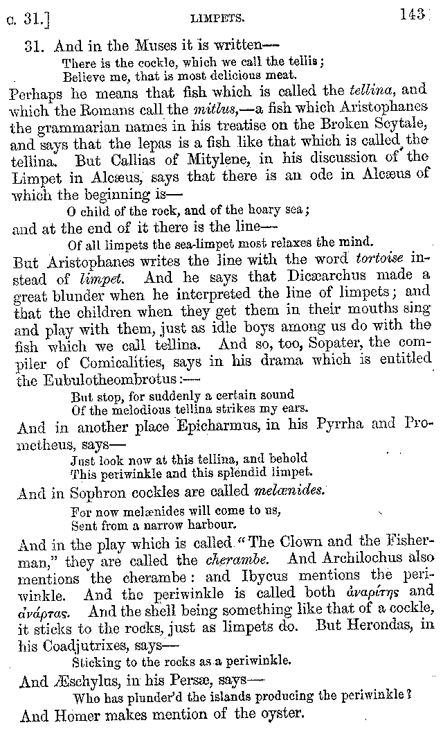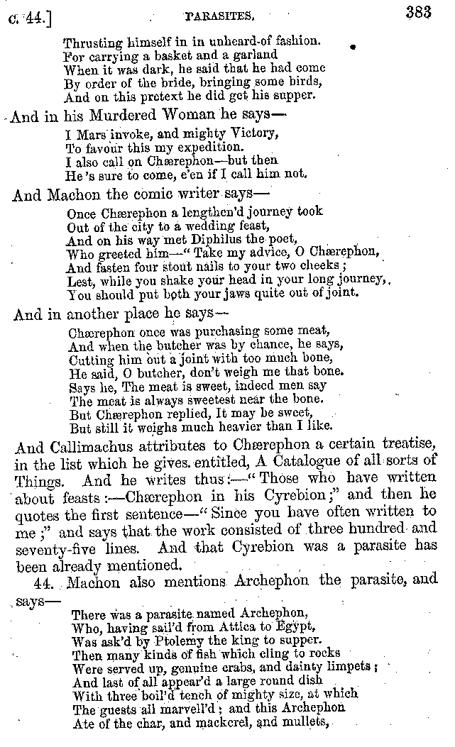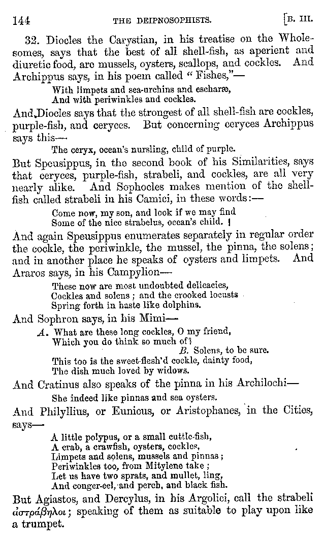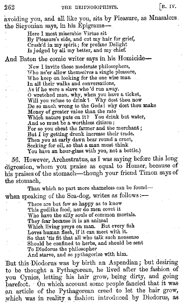 Many such men then as these, he says, were present at Laurentius's supper; bringing books out of their bags, as their contribution to the picnic. And he says also that Charmus, having something ready for everything that was served up, as has been already said, appeared to the Massenians to be a most accomplished man; as also did Calliphanes, who was called the son of Parabrycon, who having copied out the beginnings of many poems and other writings, recollected three or four stanzas of each, aiming at a reputation for extensive learning. And many other men had in their mouths turbots caught in the Sicilian sea, and swimming eels, and the trail of the tunny-fish of Pachynum, and kids from Melos, and mullets from Symæthus. And, of dishes of less repute, there were cockles from Pelorum, anchovies from Lipara, turnips from Mantinea, rape from Thebes, and beet-root from the Ascræans. And Cleanthes the Tarentine, as Clearchus says, said everything while the drinking lasted, in metres. And so did Pamphilus the Sicilian, in this way:—