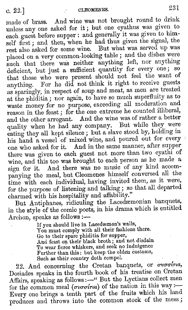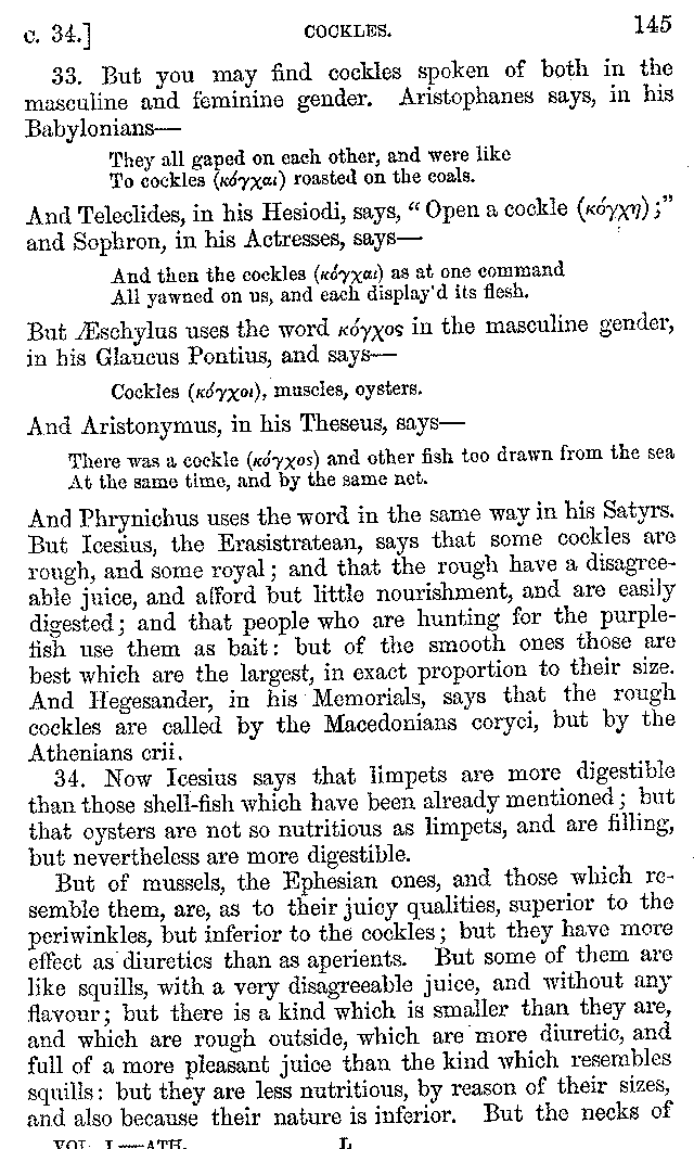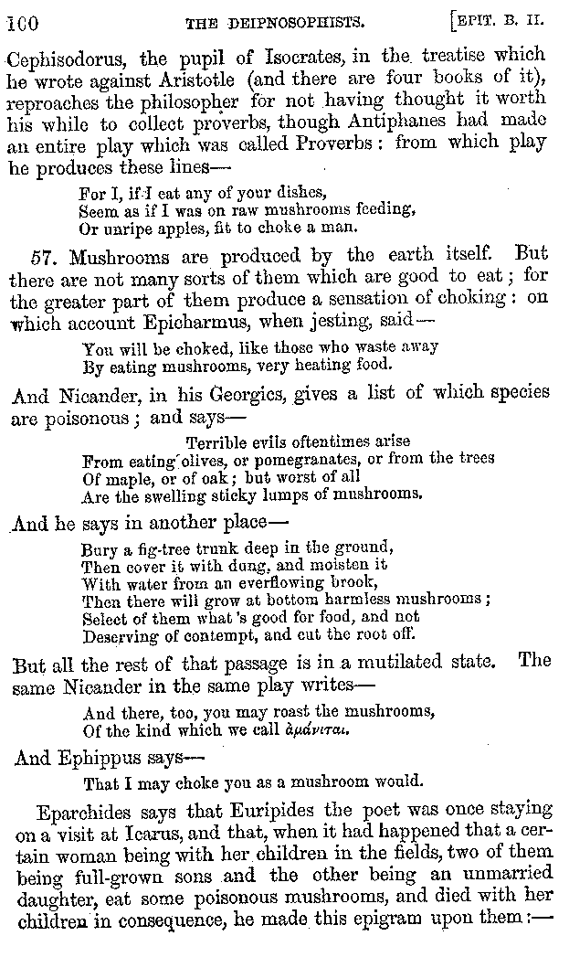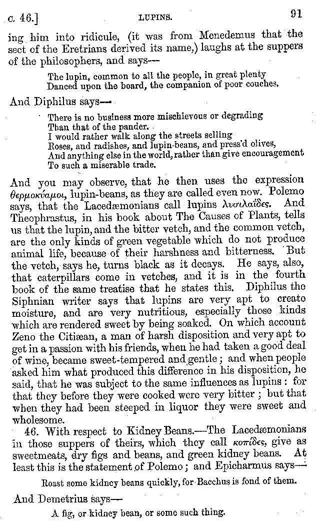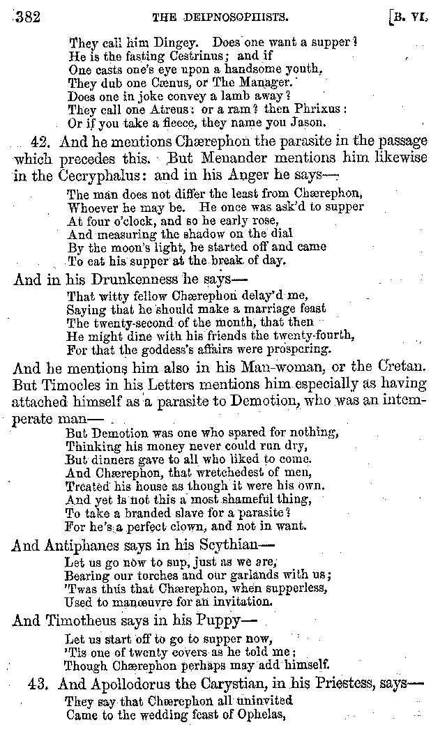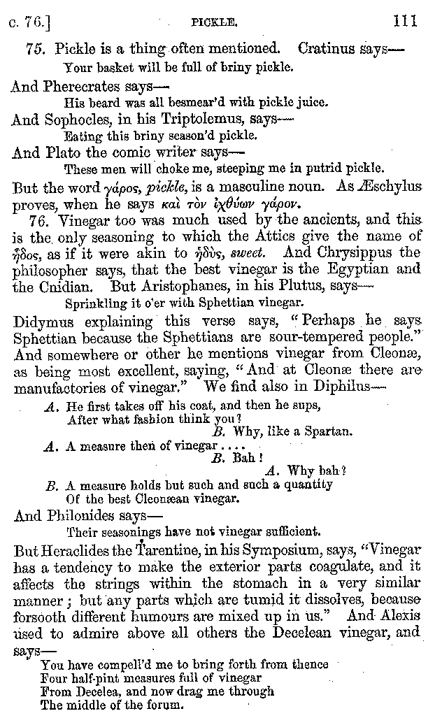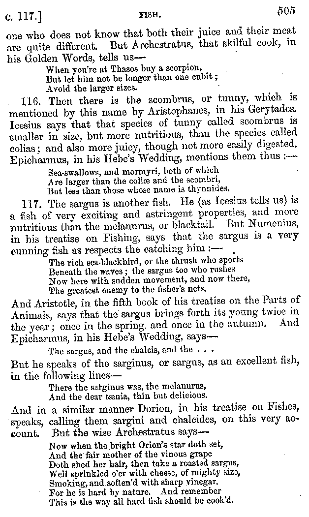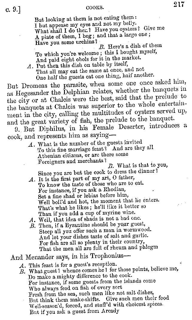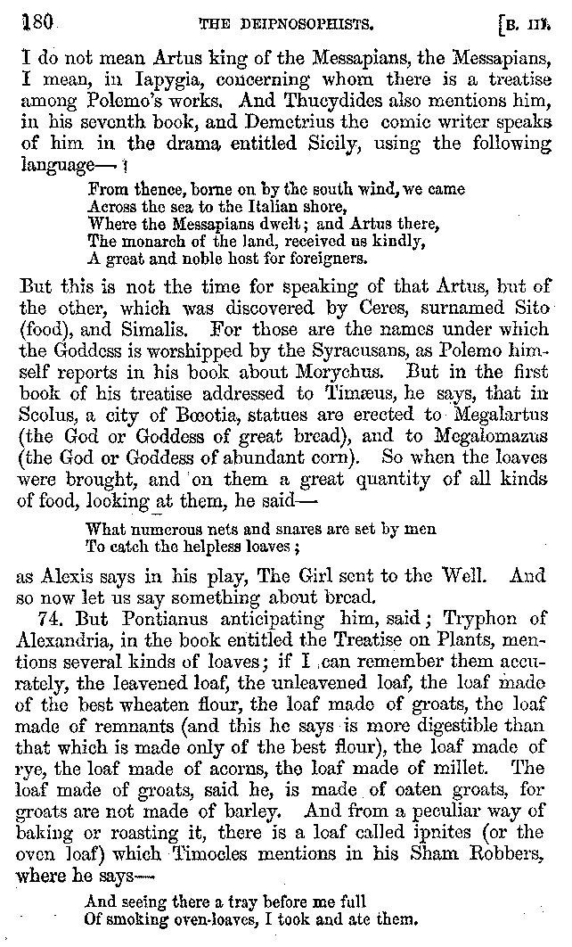 Many such men then as these, he says, were present at Laurentius's supper; bringing books out of their bags, as their contribution to the picnic. And he says also that Charmus, having something ready for everything that was served up, as has been already said, appeared to the Massenians to be a most accomplished man; as also did Calliphanes, who was called the son of Parabrycon, who having copied out the beginnings of many poems and other writings, recollected three or four stanzas of each, aiming at a reputation for extensive learning. And many other men had in their mouths turbots caught in the Sicilian sea, and swimming eels, and the trail of the tunny-fish of Pachynum, and kids from Melos, and mullets from Symæthus. And, of dishes of less repute, there were cockles from Pelorum, anchovies from Lipara, turnips from Mantinea, rape from Thebes, and beet-root from the Ascræans. And Cleanthes the Tarentine, as Clearchus says, said everything while the drinking lasted, in metres. And so did Pamphilus the Sicilian, in this way:—