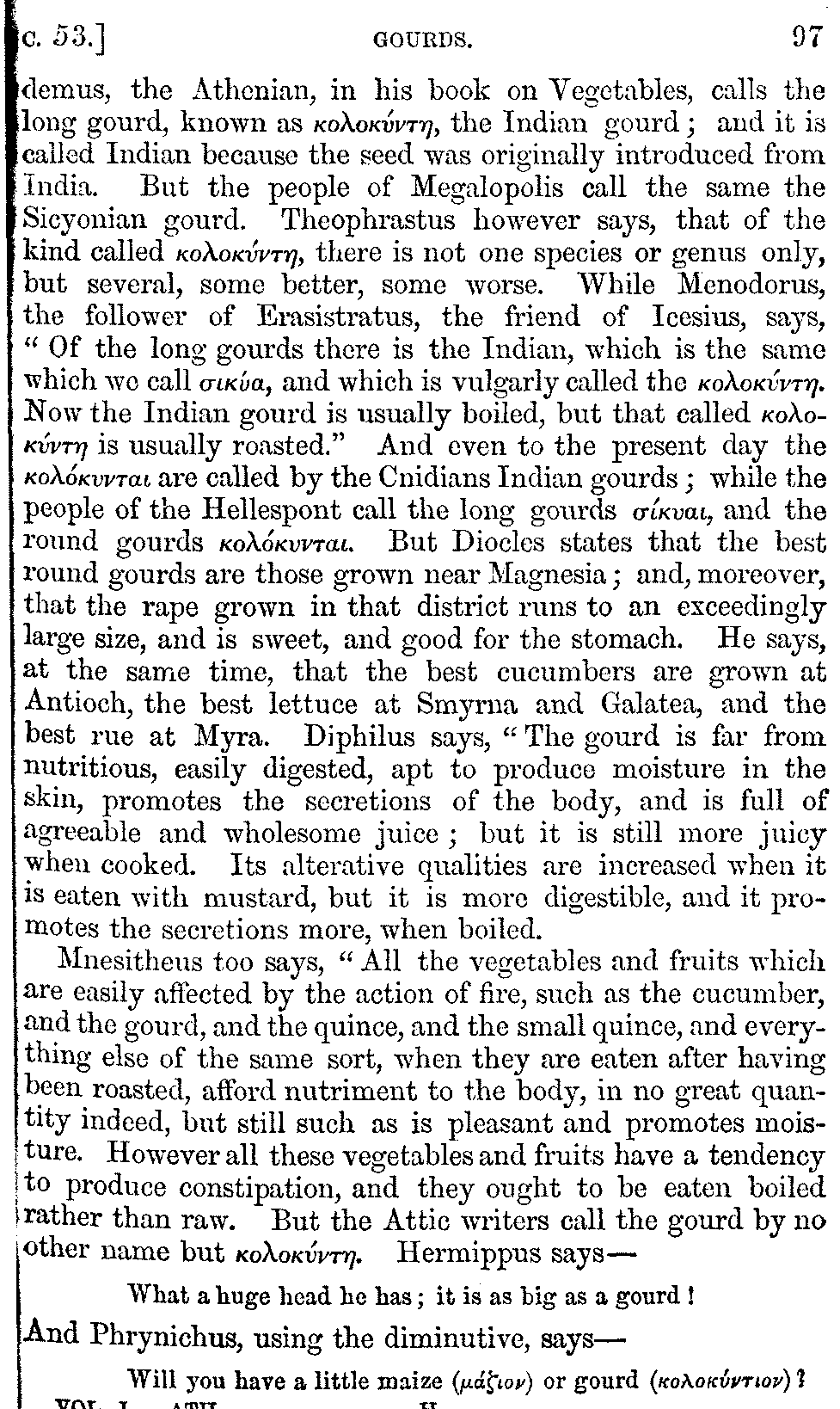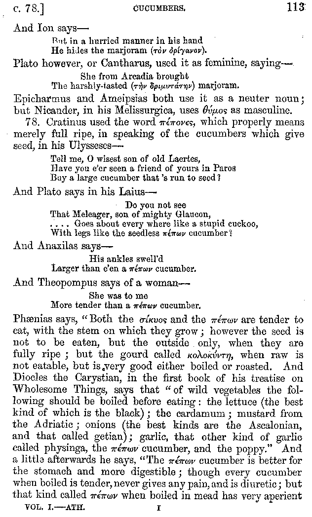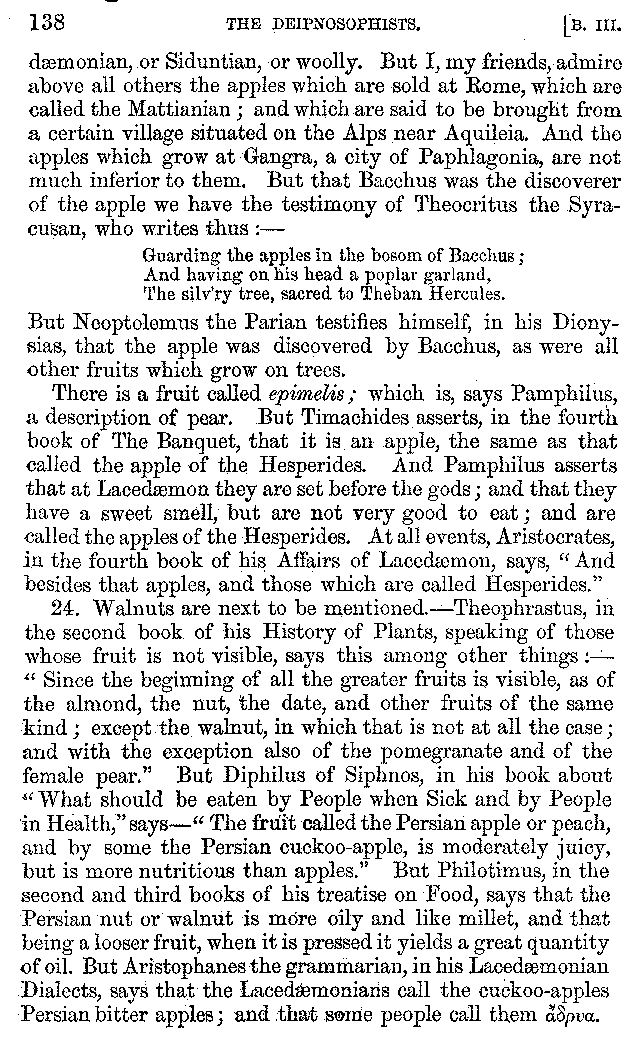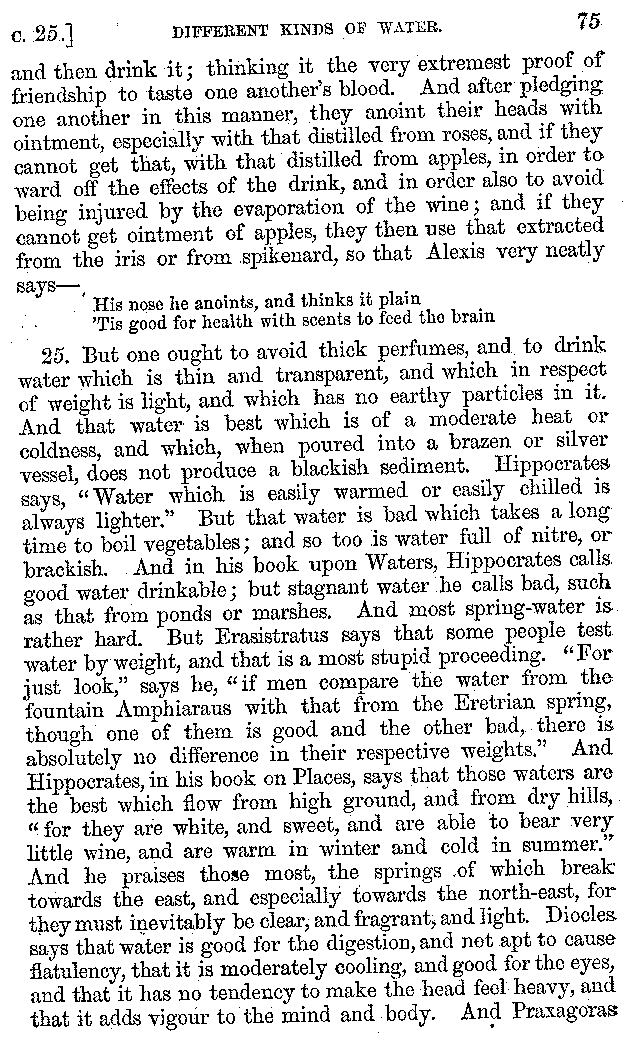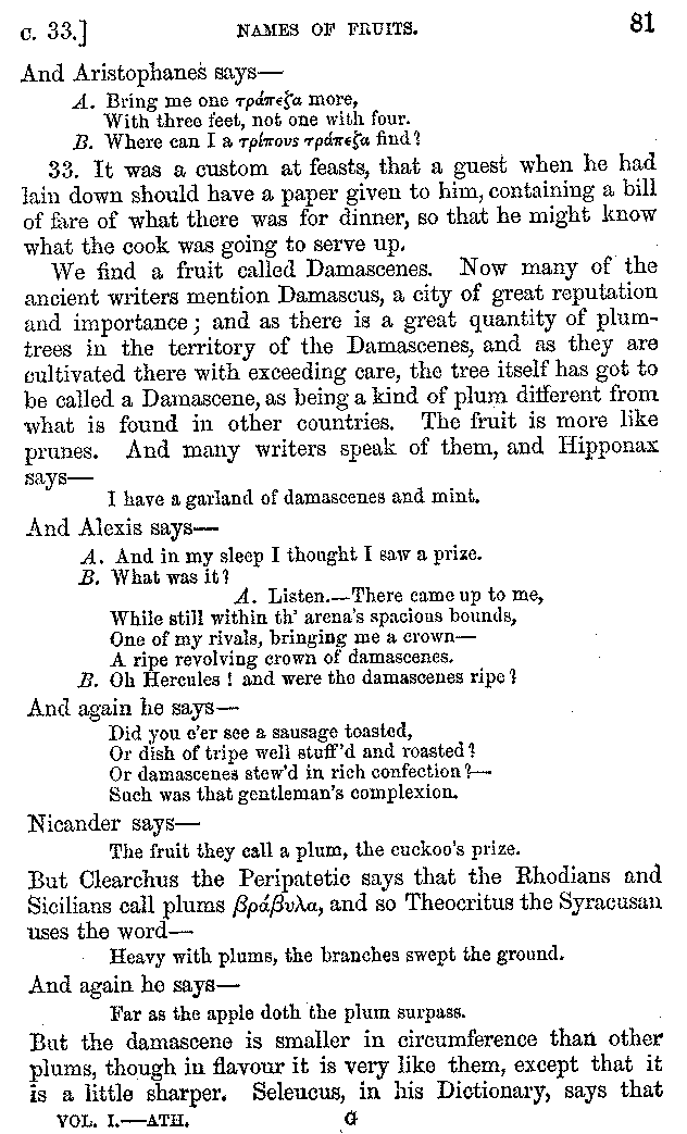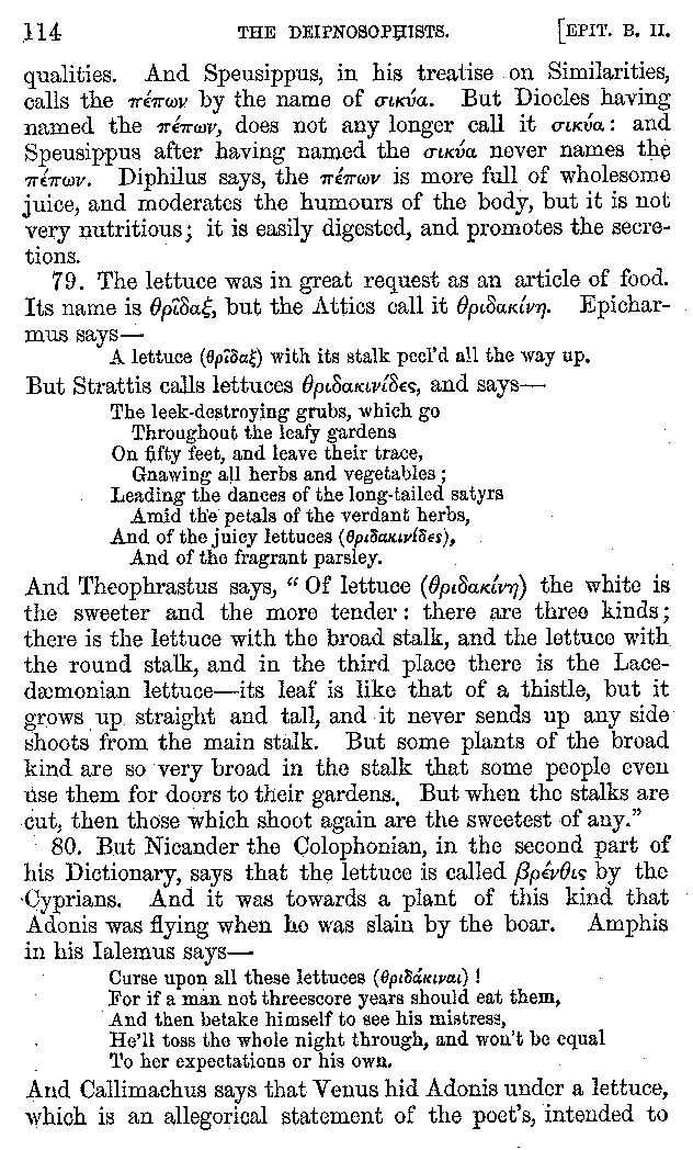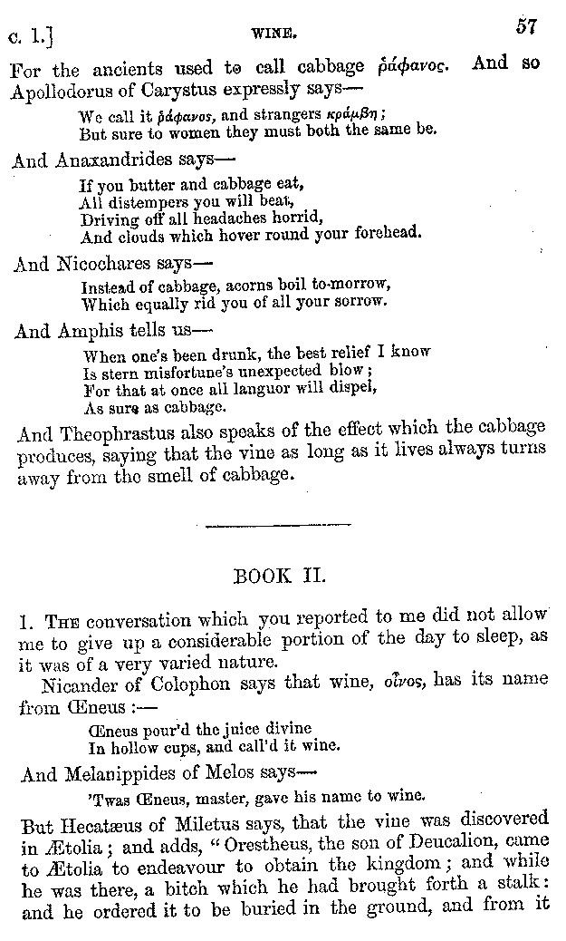 | Wine—Drinking—The evils of Drunkenness—Praises of Wine—Water—Different kinds of Water—Sweetmeats—Couches and Coverlets—Names of Fruits—Fruit and Herbs—Lupins—Names of—Plants—Eggs—Gourds—Mushrooms—Asparagus—Onions—Thrushes—Brains—The Head—Pickle—Cucumbers—Lettuce—The Cactus—The Nile | 57-121 |
