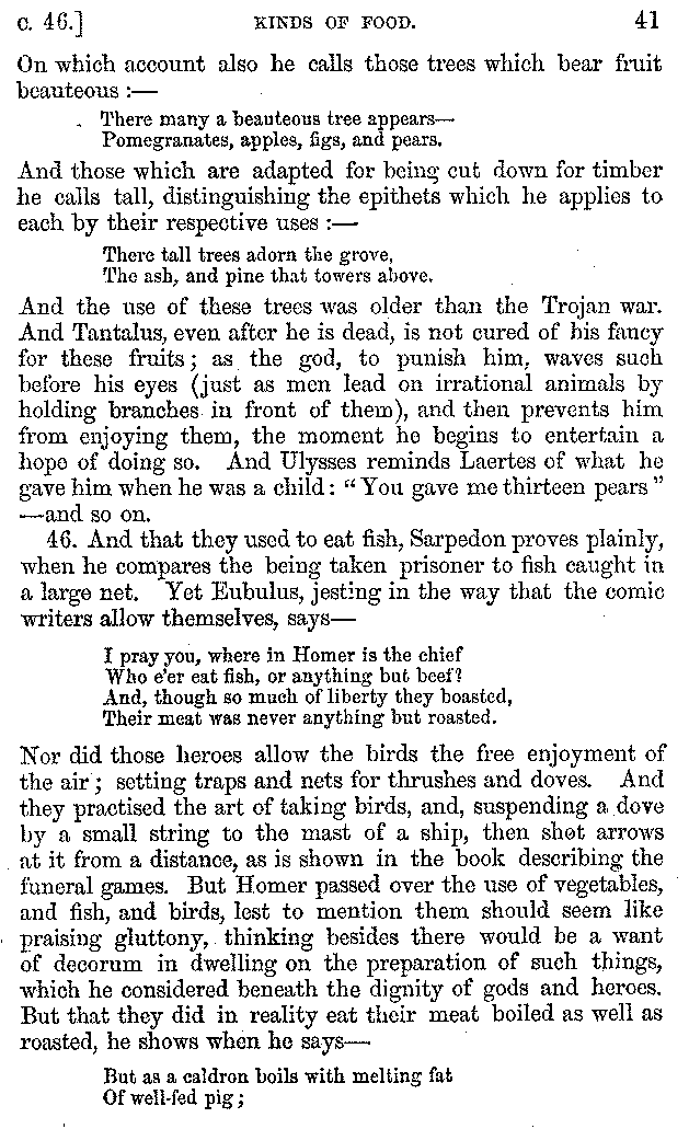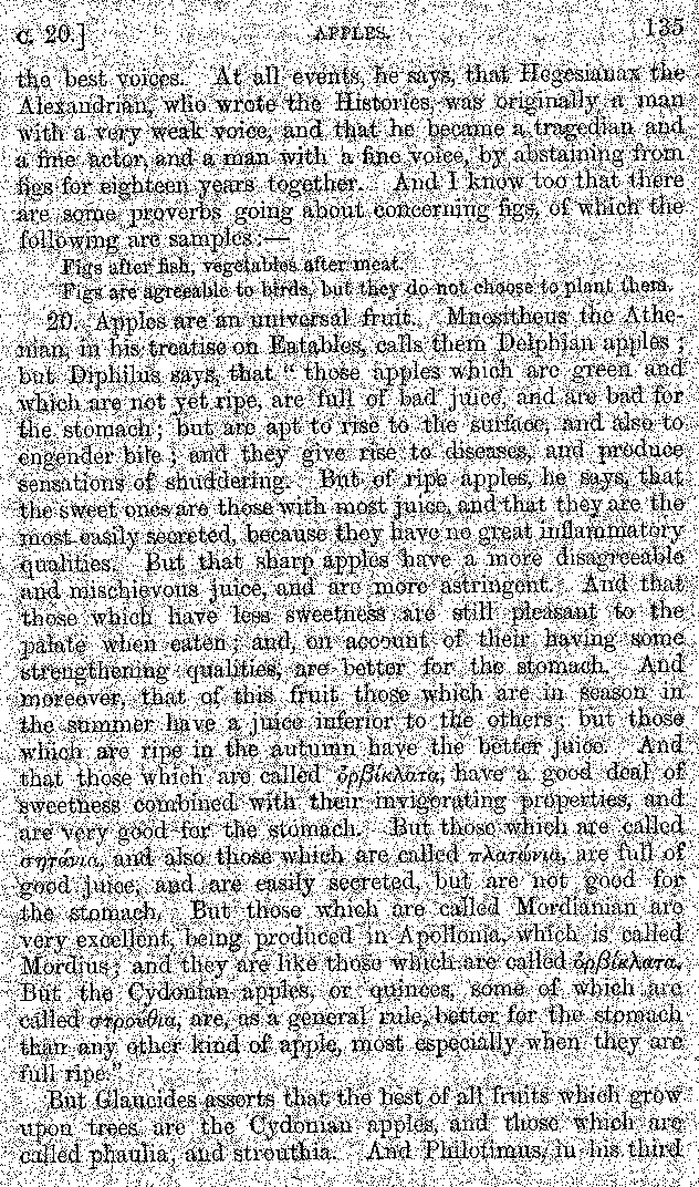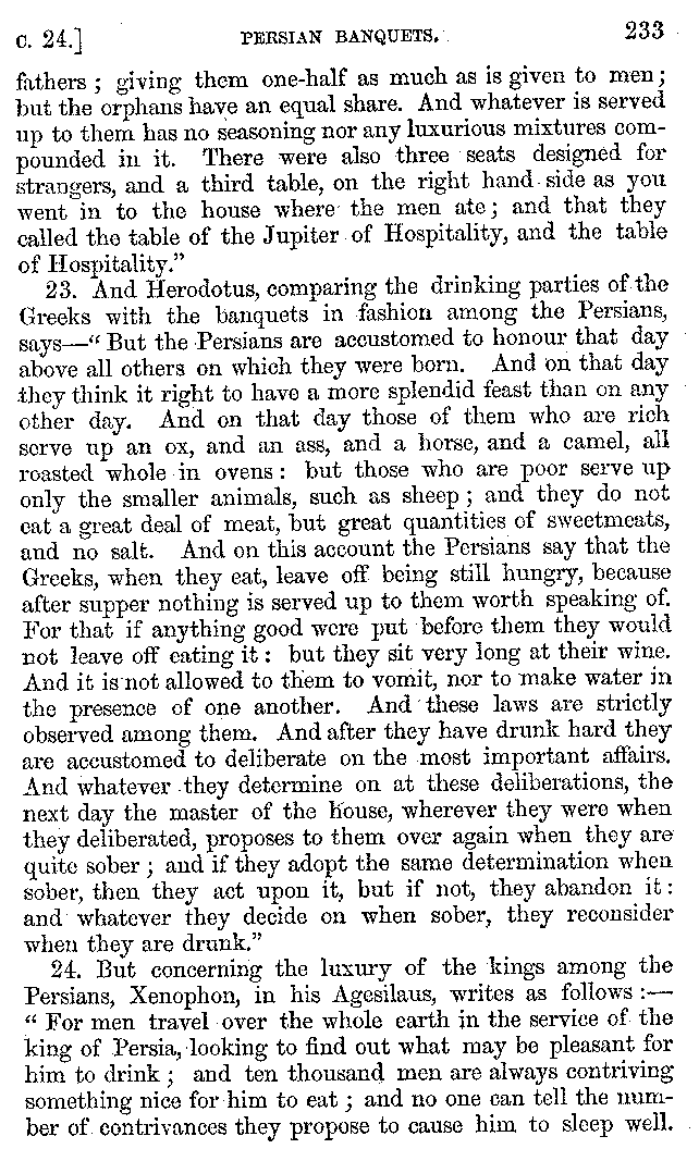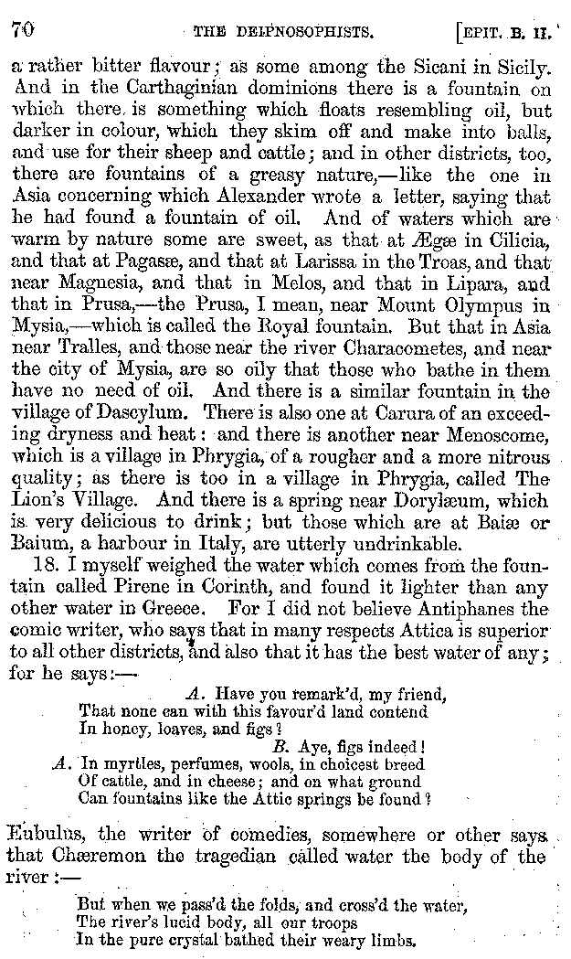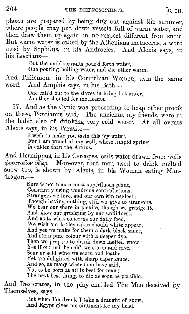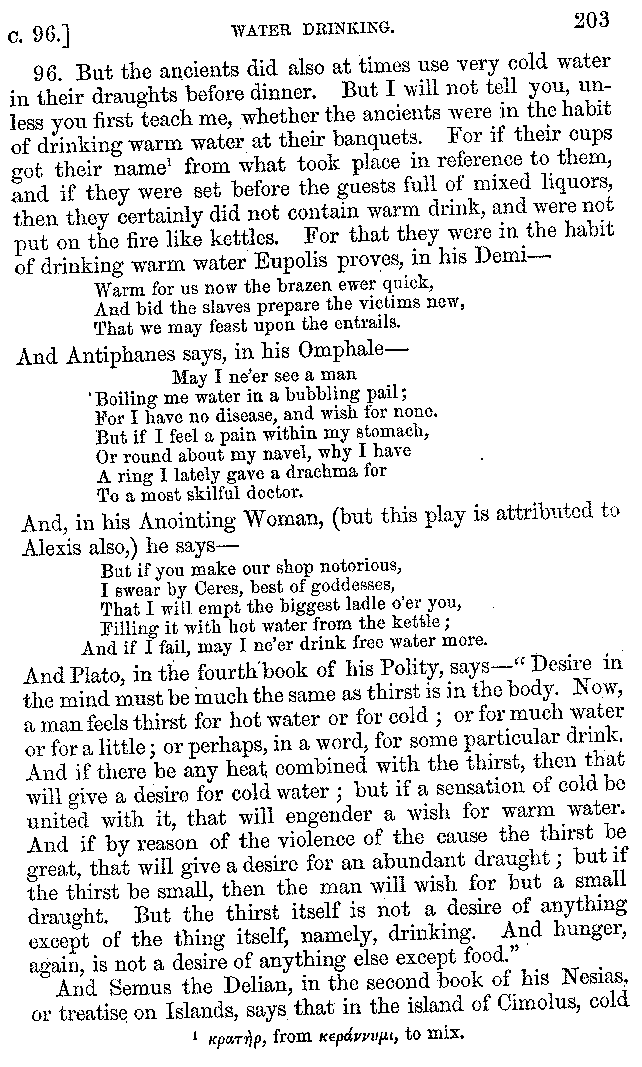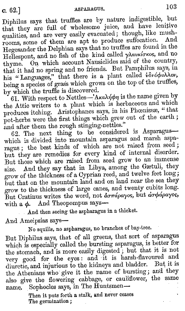| Wine—Drinking—The evils of Drunkenness—Praises of Wine—Water—Different kinds of Water—Sweetmeats—Couches and Coverlets—Names of Fruits—Fruit and Herbs—Lupins—Names of—Plants—Eggs—Gourds—Mushrooms—Asparagus—Onions—Thrushes—Brains—The Head—Pickle—Cucumbers—Lettuce—The Cactus—The Nile | 57-121 |