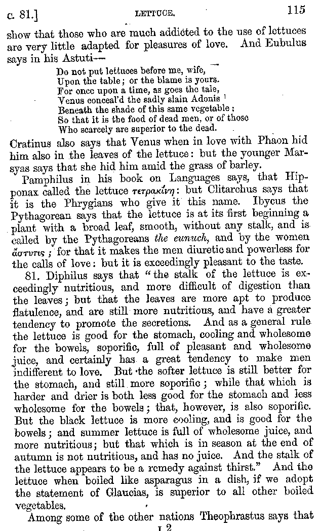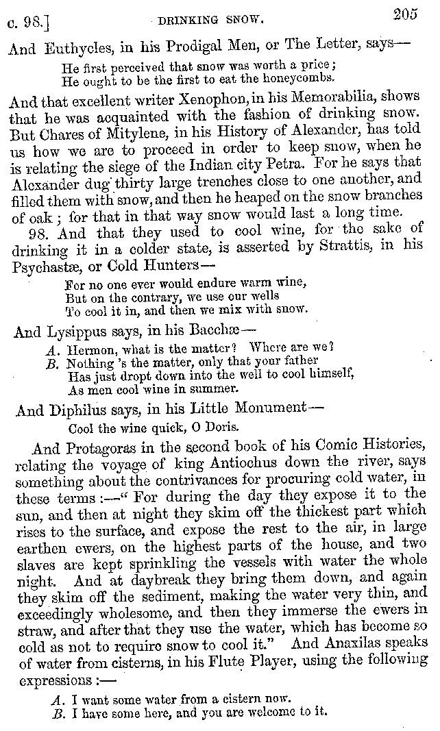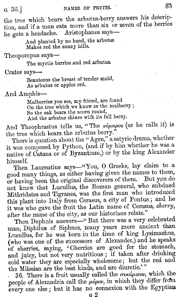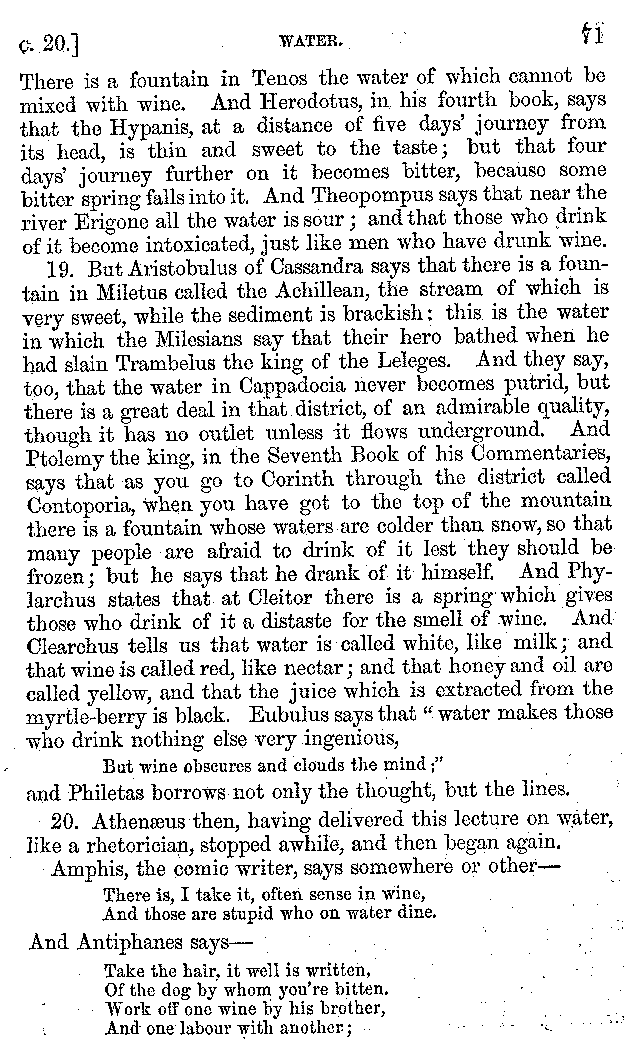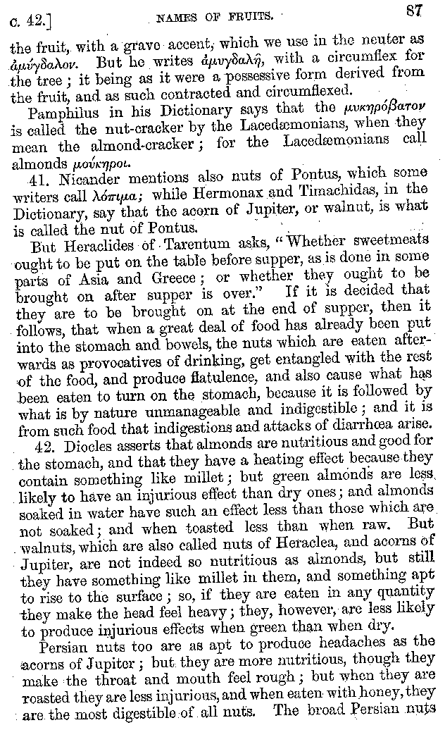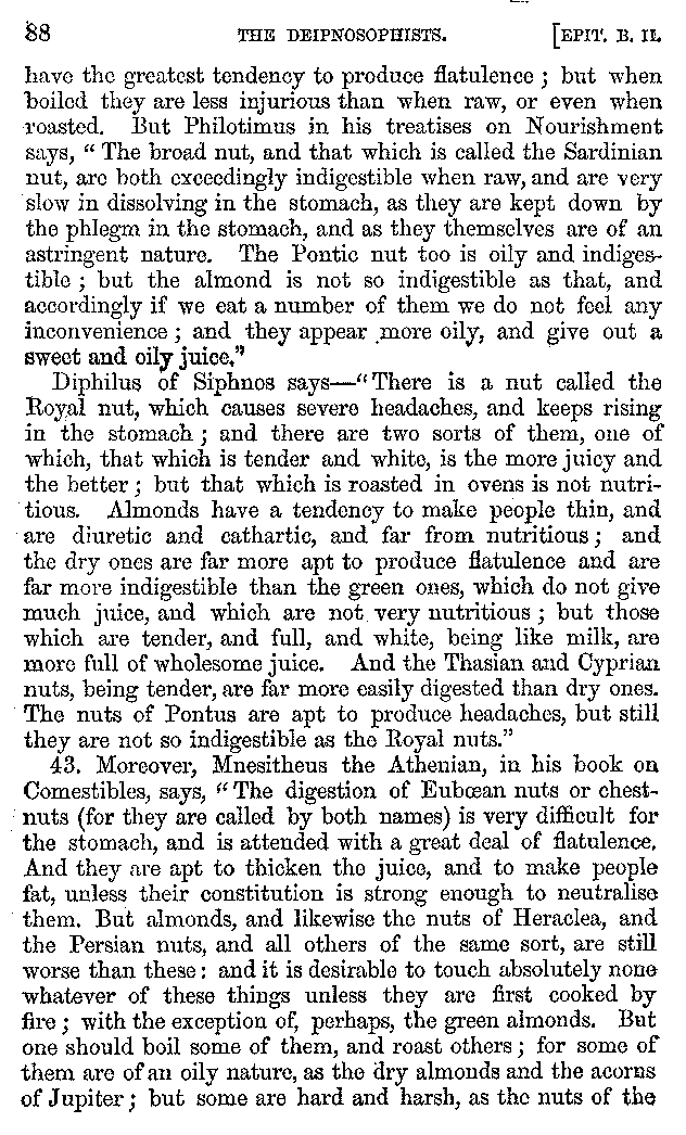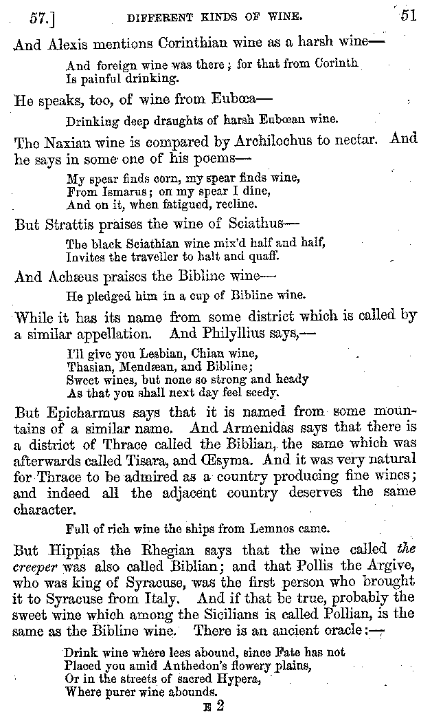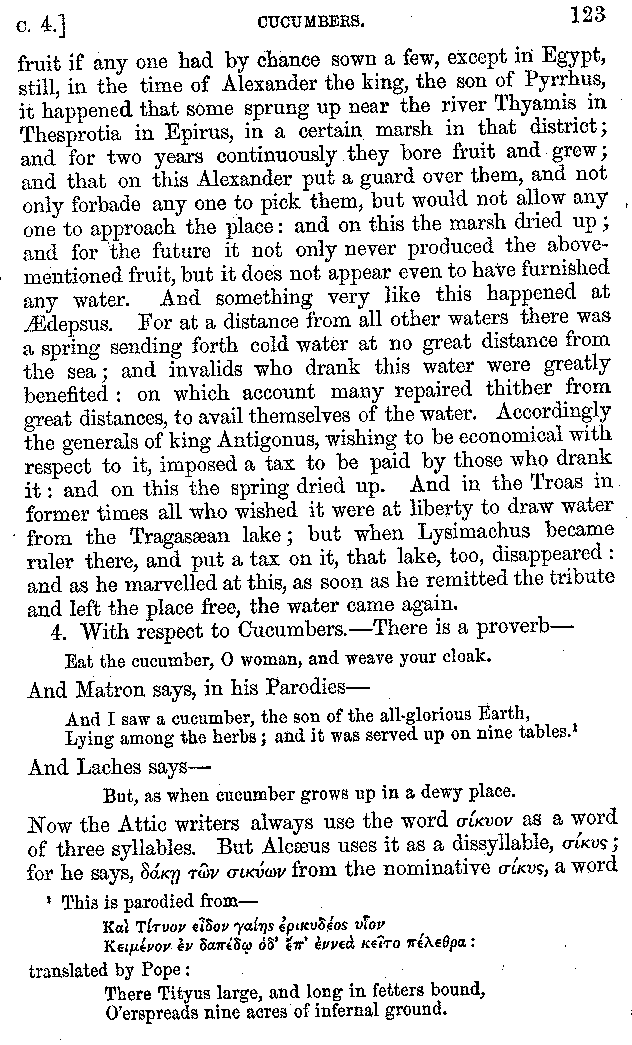 | Wine—Drinking—The evils of Drunkenness—Praises of Wine—Water—Different kinds of Water—Sweetmeats—Couches and Coverlets—Names of Fruits—Fruit and Herbs—Lupins—Names of—Plants—Eggs—Gourds—Mushrooms—Asparagus—Onions—Thrushes—Brains—The Head—Pickle—Cucumbers—Lettuce—The Cactus—The Nile | 57-121 |