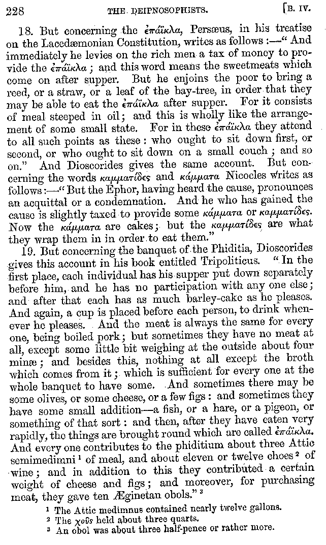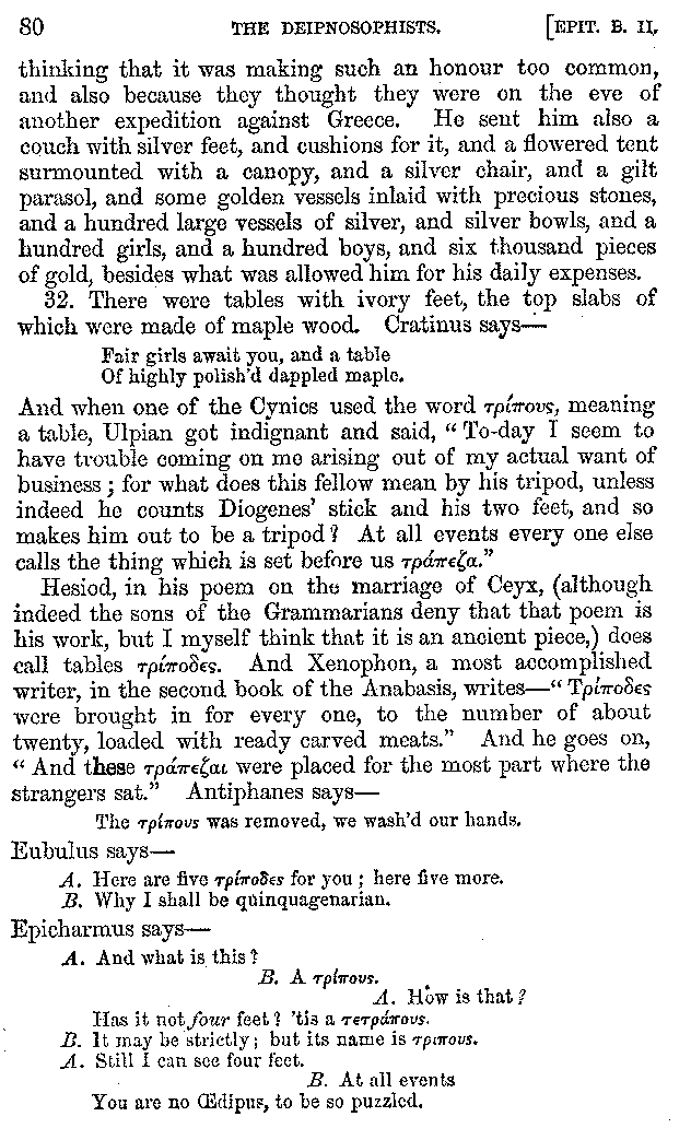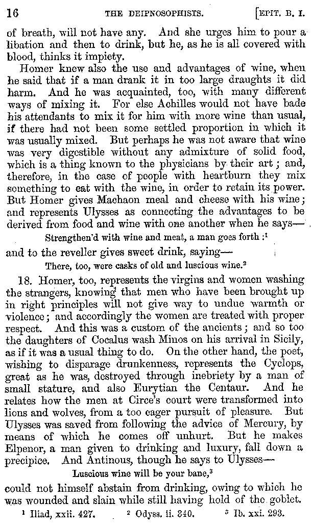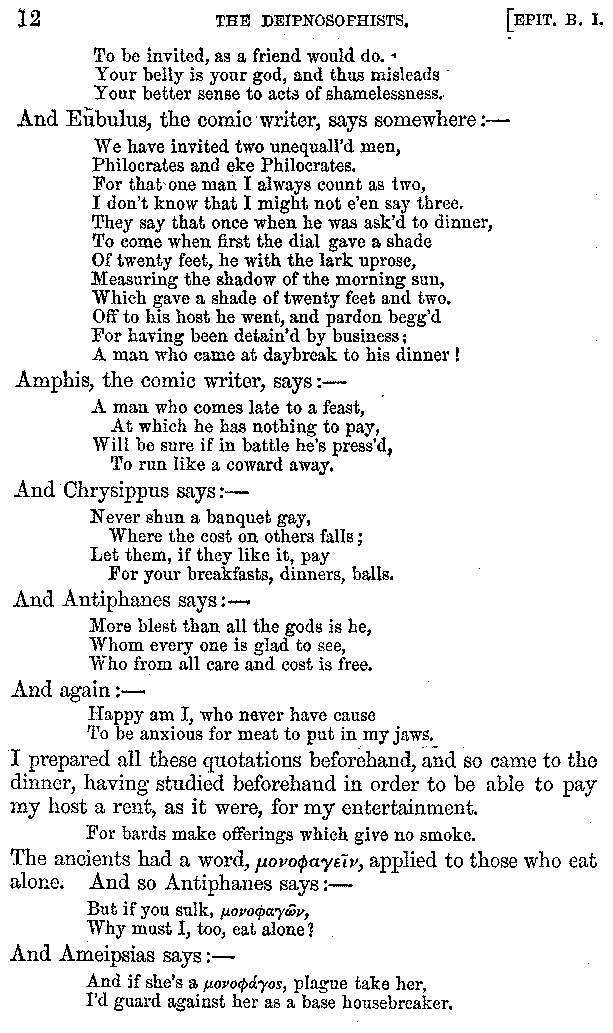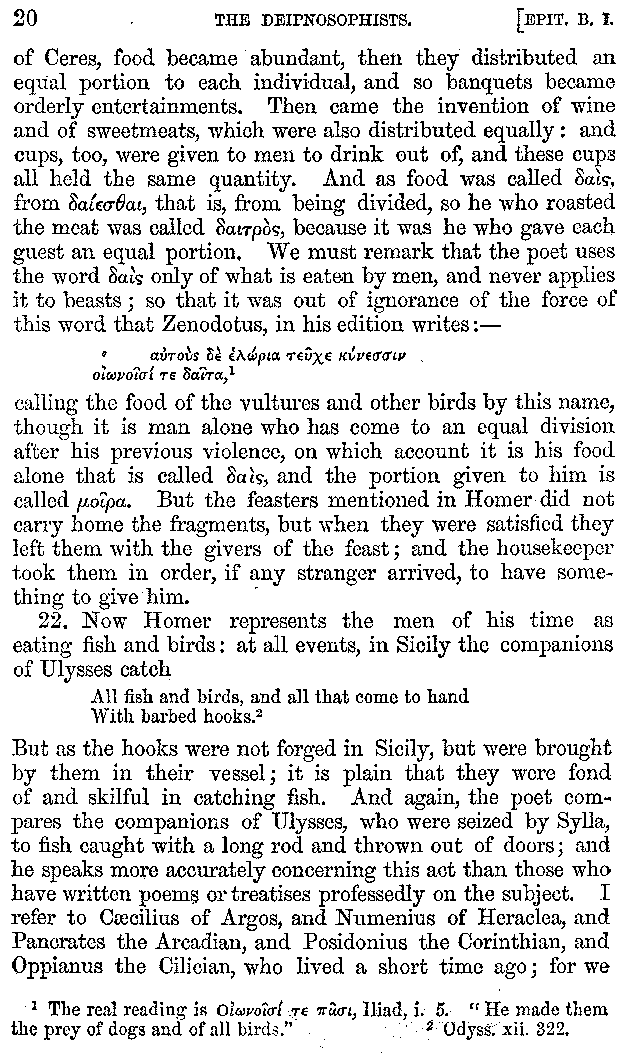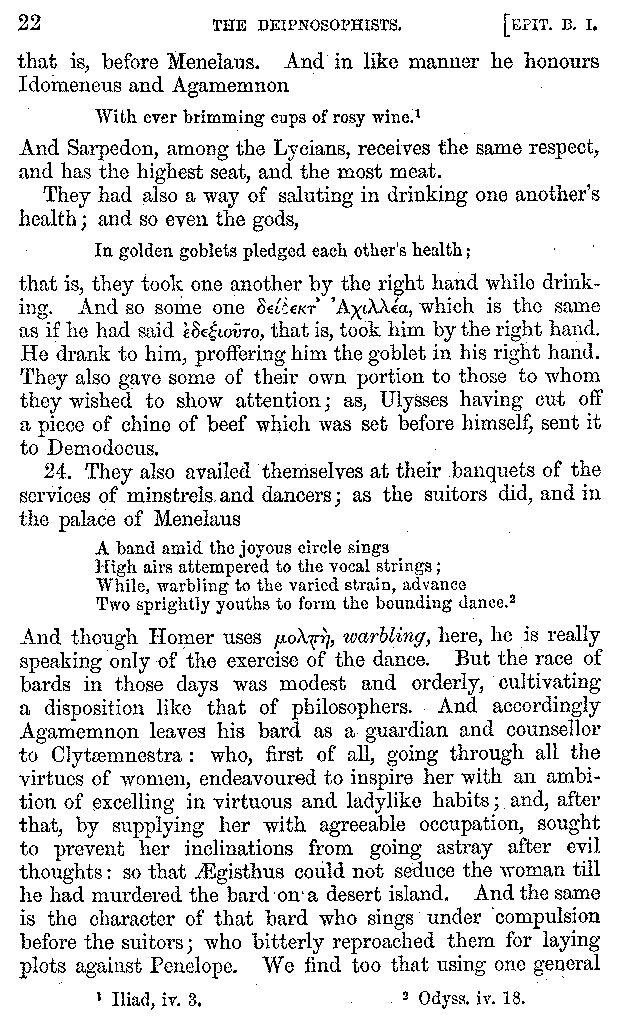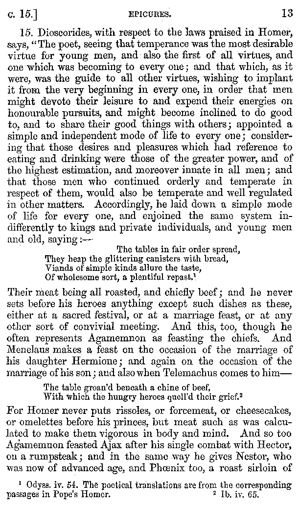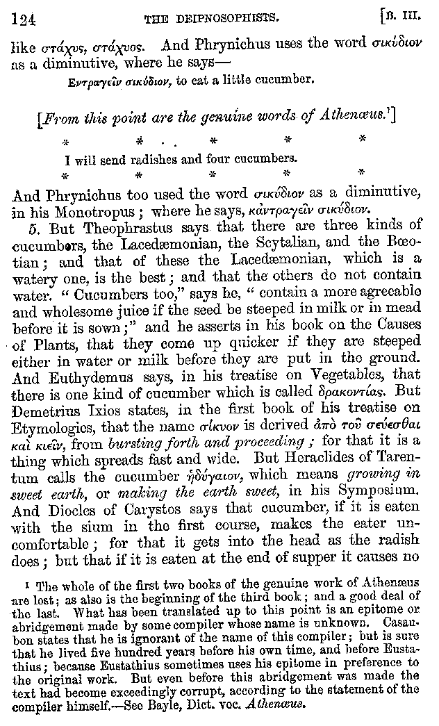 [iv] The first two books, and portions of the third, eleventh, and fifteenth, exist only in an Epitome, of which both the date and author are unknown. It soon, however, became more common than the original work, and eventually in a great degree superseded it. Indeed Bentley has proved that the only knowledge which, in the time of Eustathius, existed of Athenæus, was through its medium.