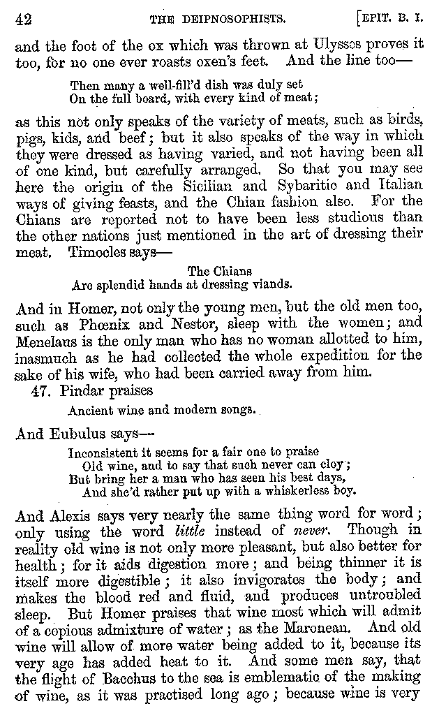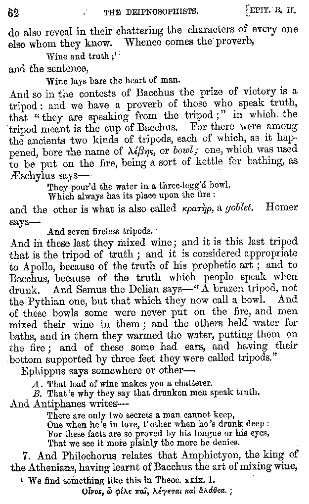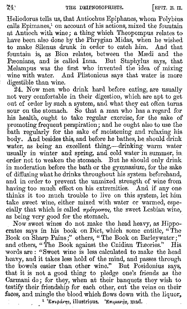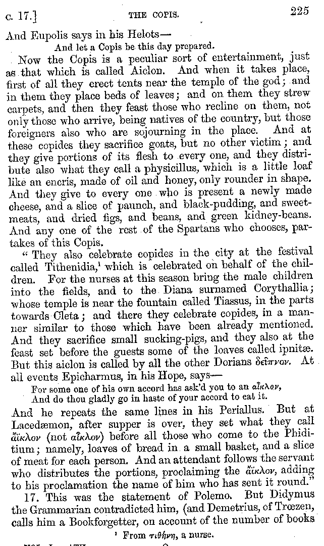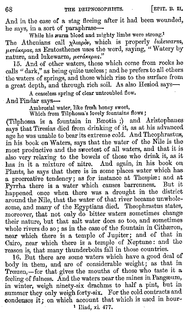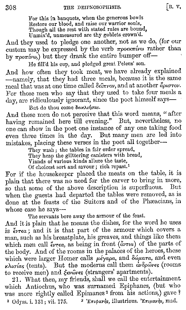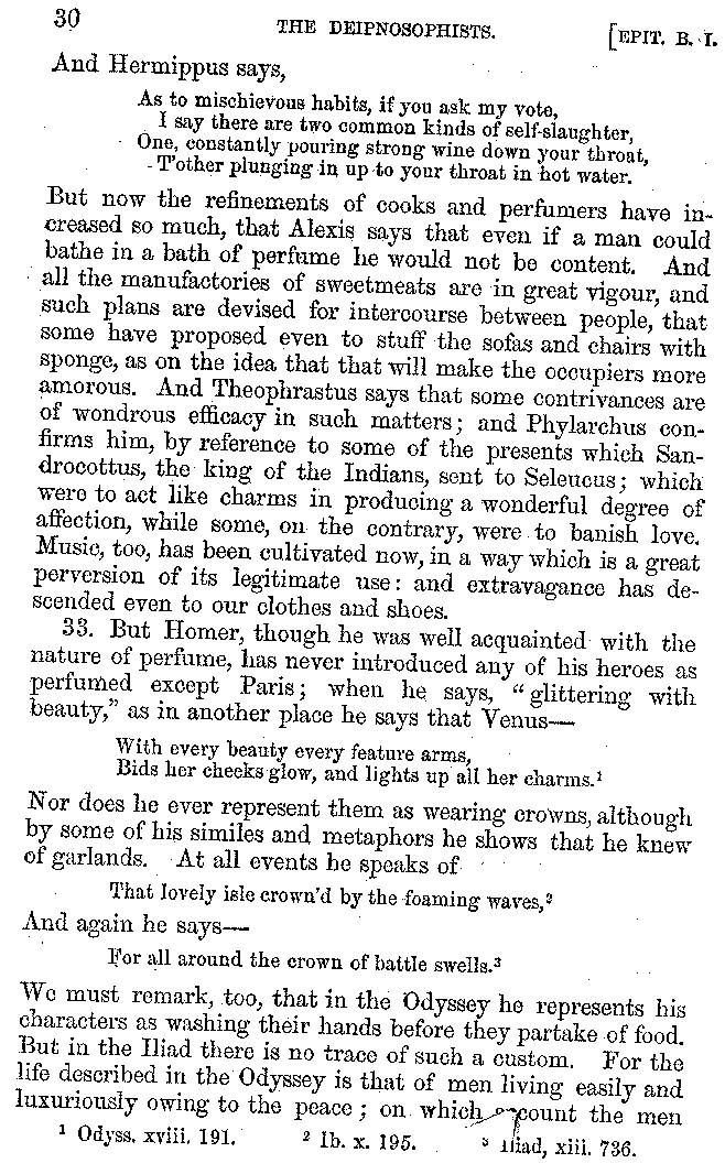 [iv] The first two books, and portions of the third, eleventh, and fifteenth, exist only in an Epitome, of which both the date and author are unknown. It soon, however, became more common than the original work, and eventually in a great degree superseded it. Indeed Bentley has proved that the only knowledge which, in the time of Eustathius, existed of Athenæus, was through its medium.