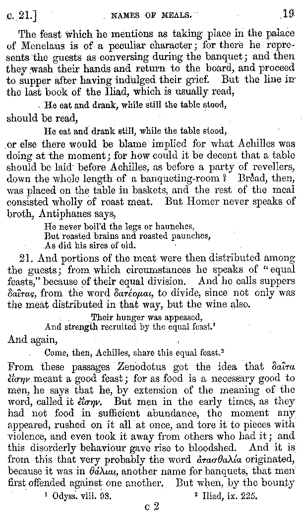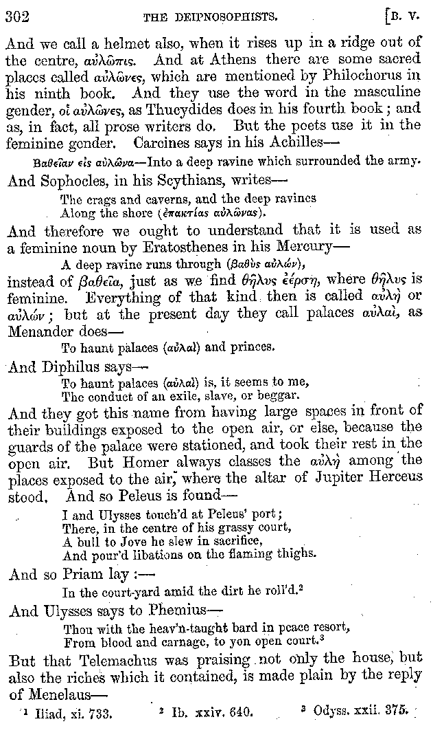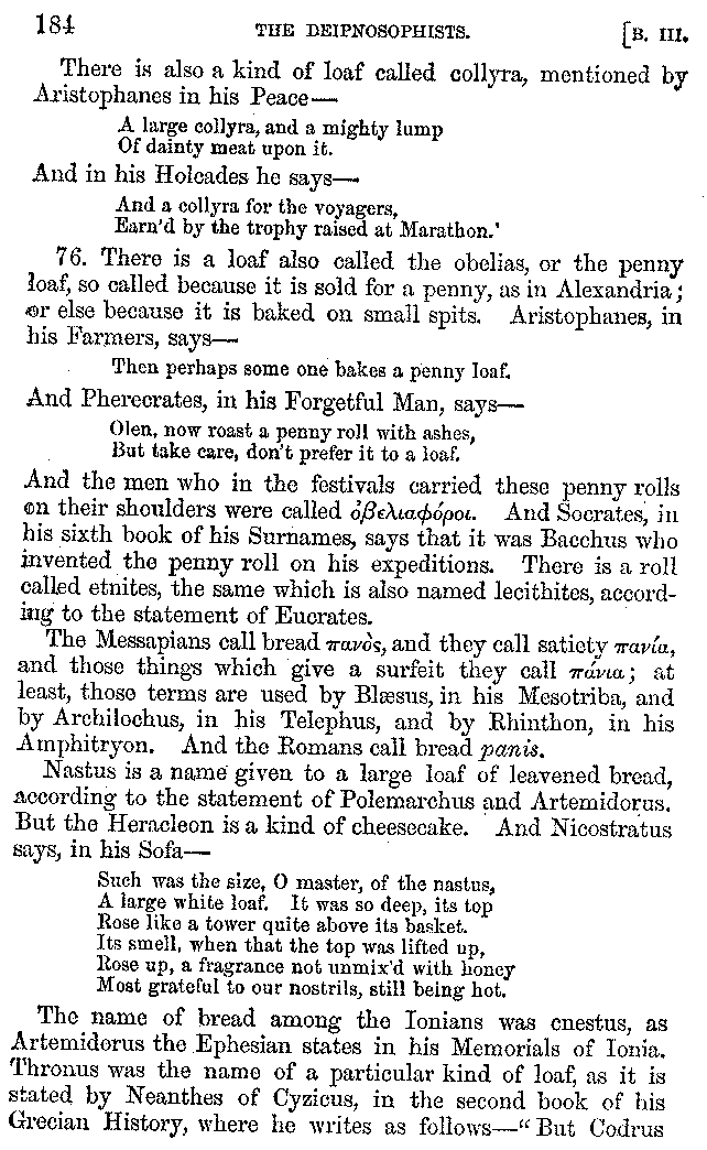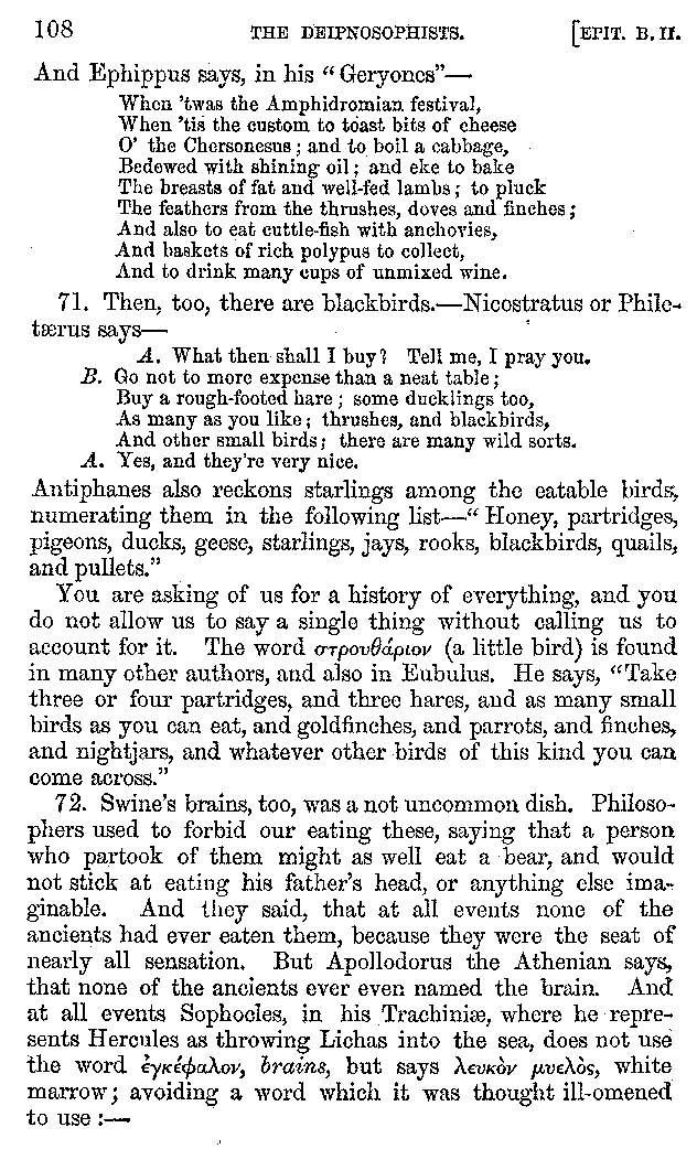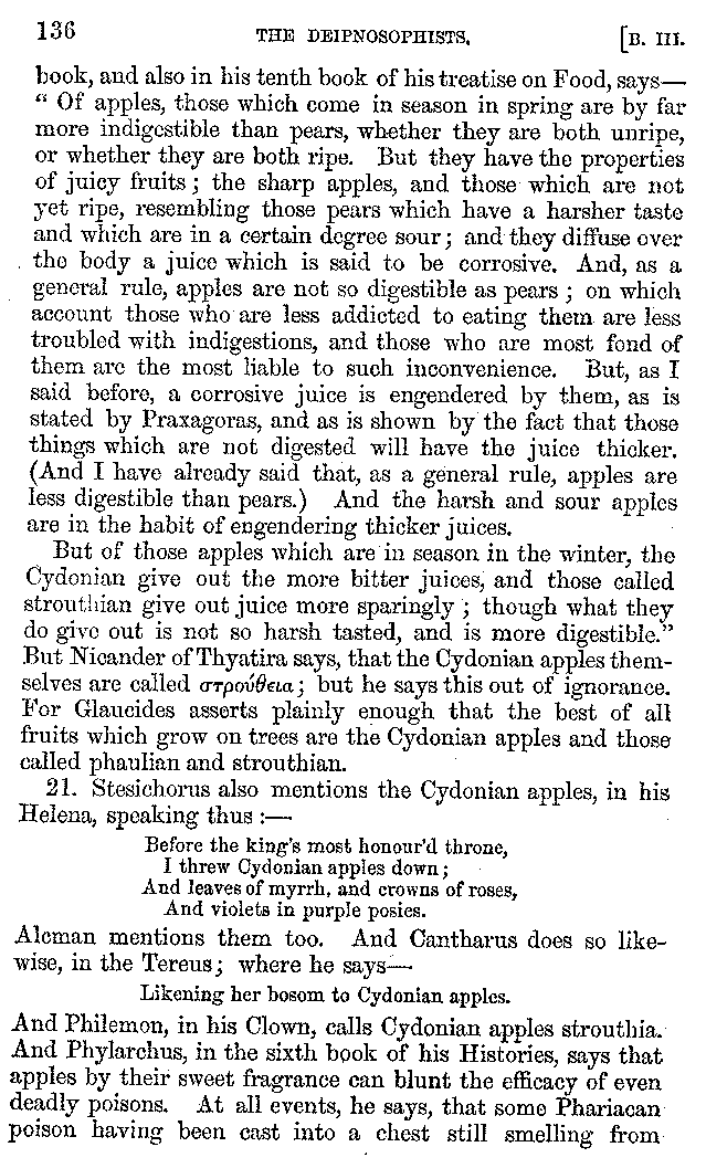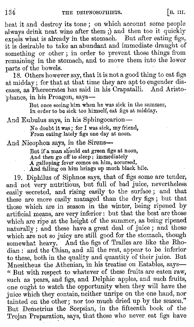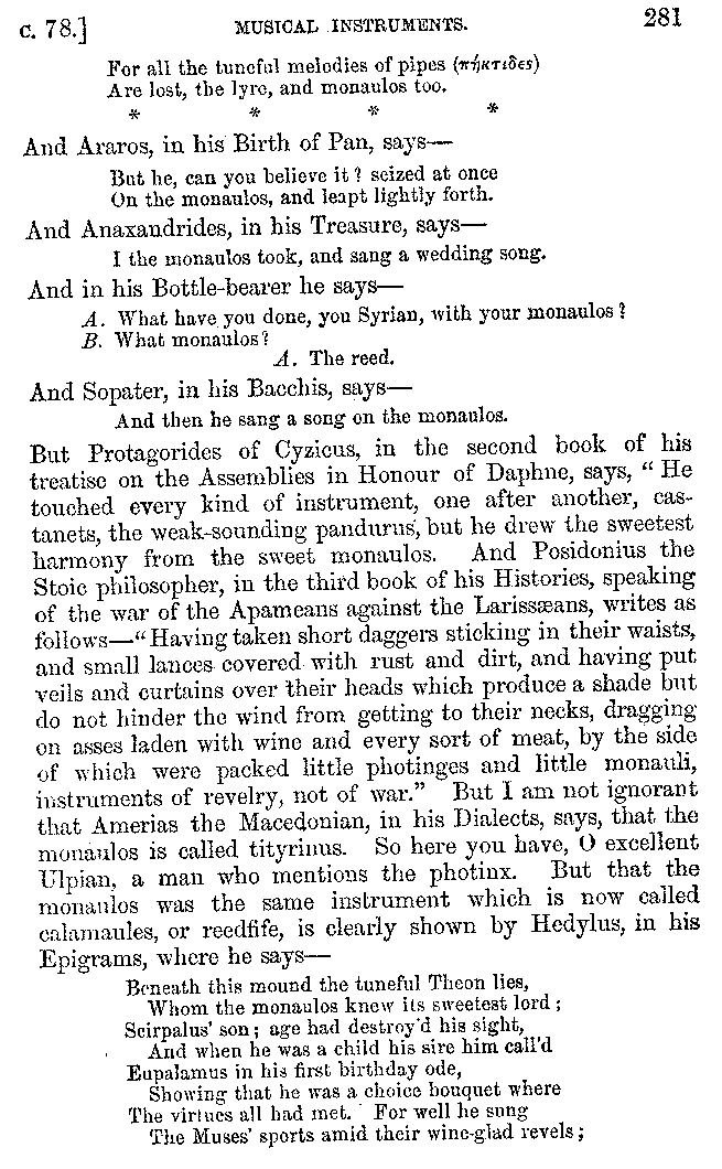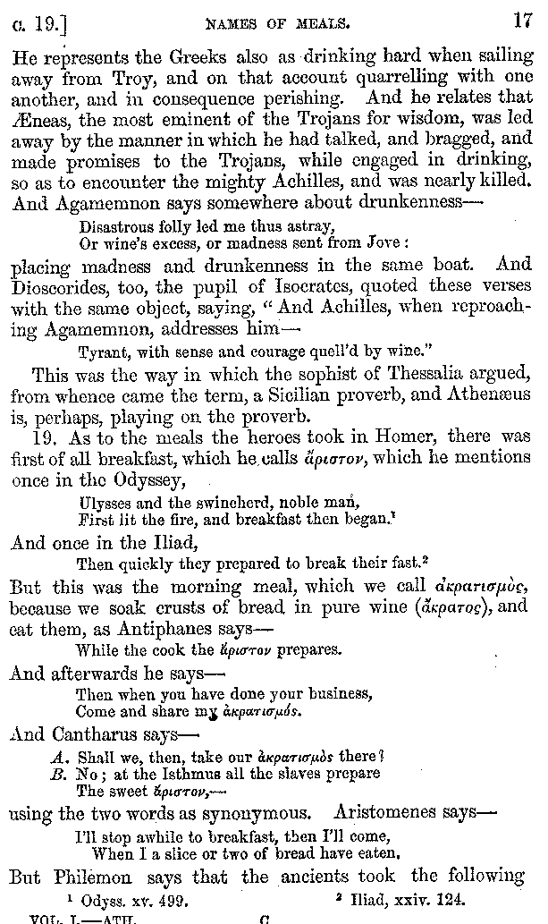 [iv] The first two books, and portions of the third, eleventh, and fifteenth, exist only in an Epitome, of which both the date and author are unknown. It soon, however, became more common than the original work, and eventually in a great degree superseded it. Indeed Bentley has proved that the only knowledge which, in the time of Eustathius, existed of Athenæus, was through its medium.