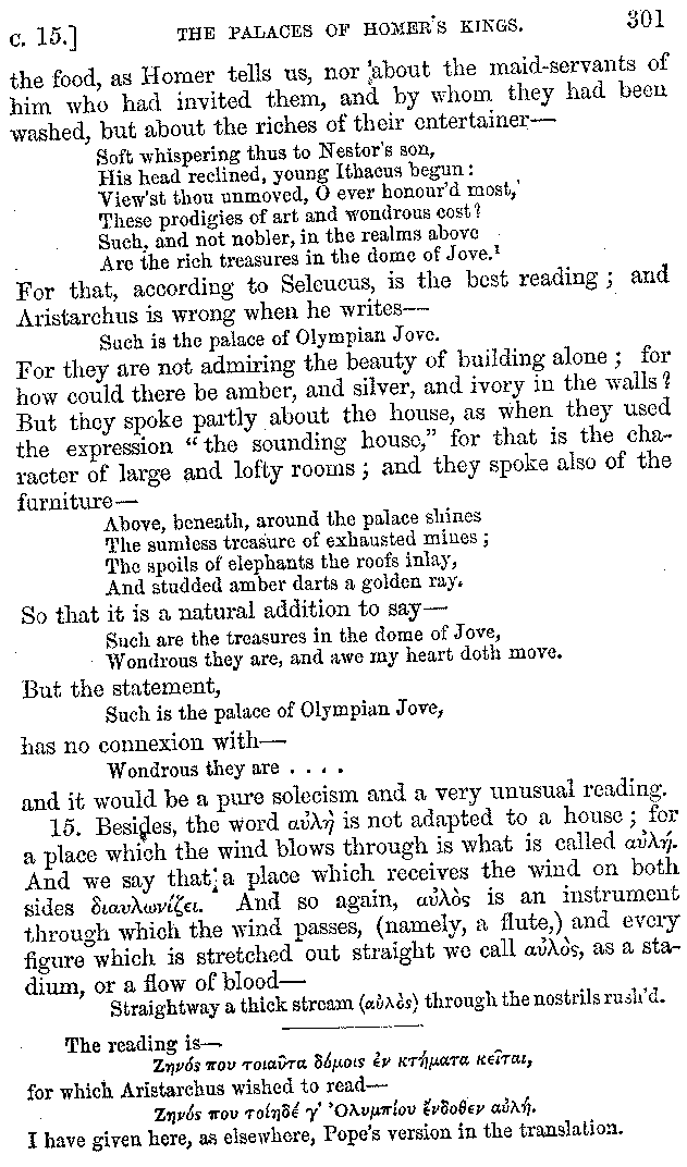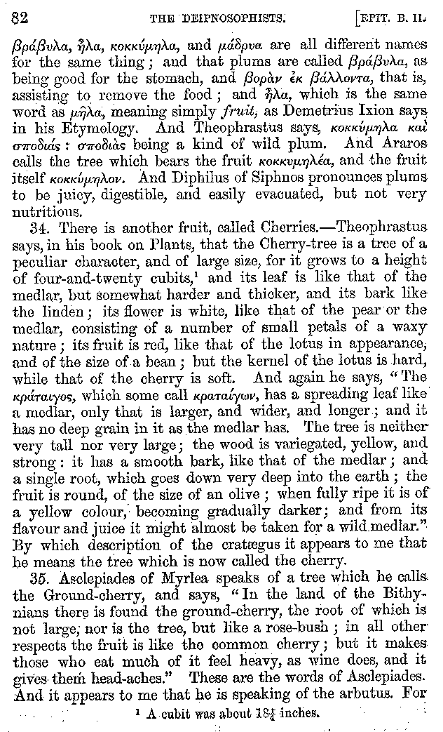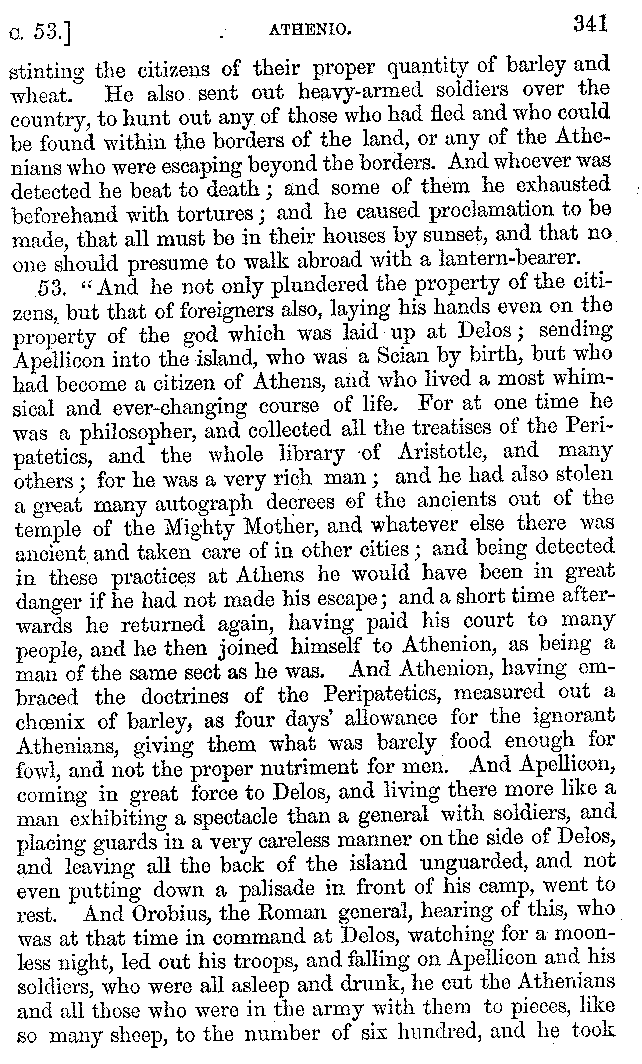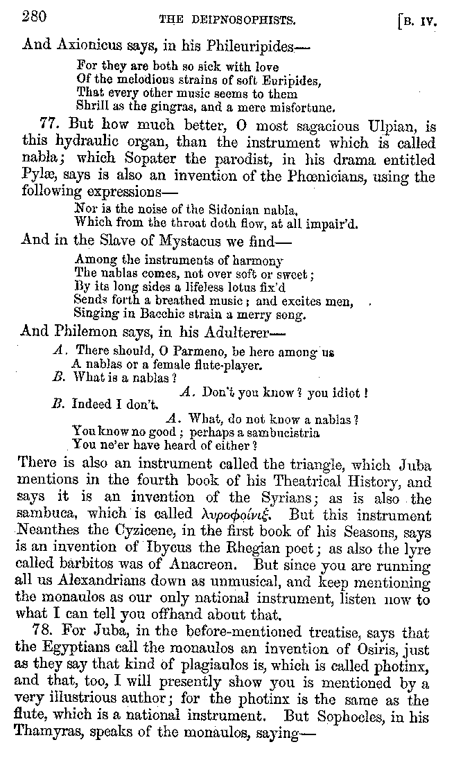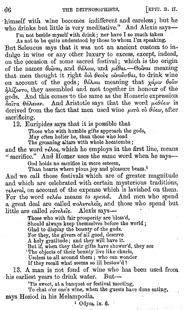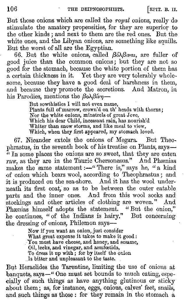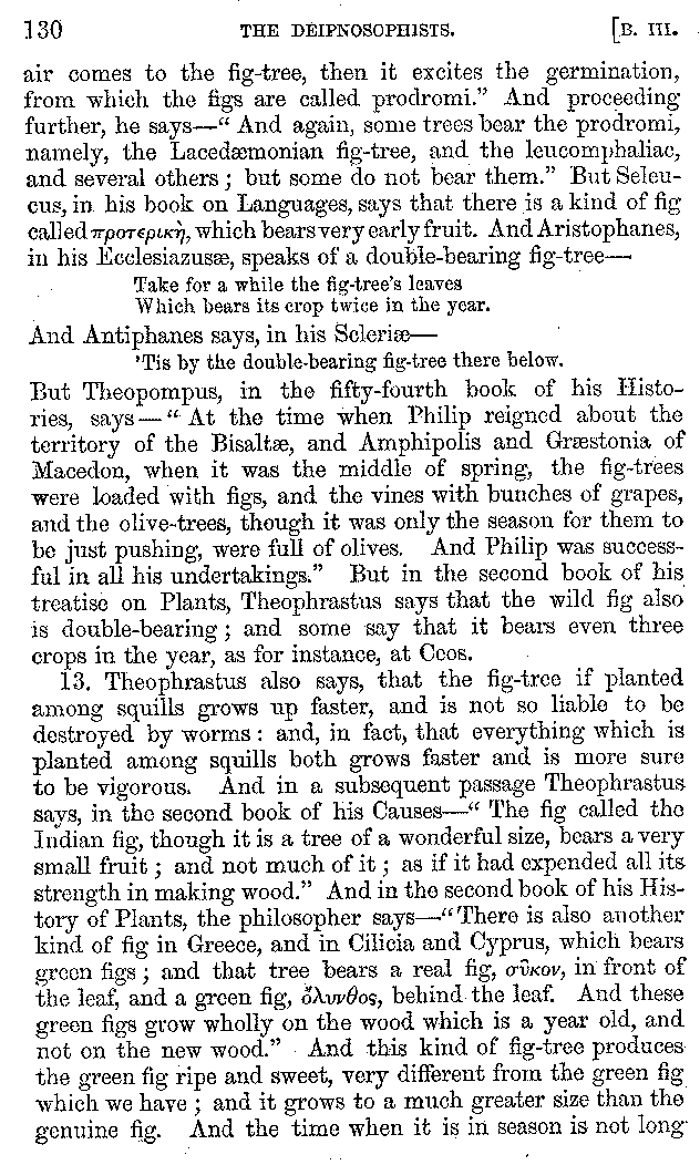[iv] The first two books, and portions of the third, eleventh, and fifteenth, exist only in an Epitome, of which both the date and author are unknown. It soon, however, became more common than the original work, and eventually in a great degree superseded it. Indeed Bentley has proved that the only knowledge which, in the time of Eustathius, existed of Athenæus, was through its medium.