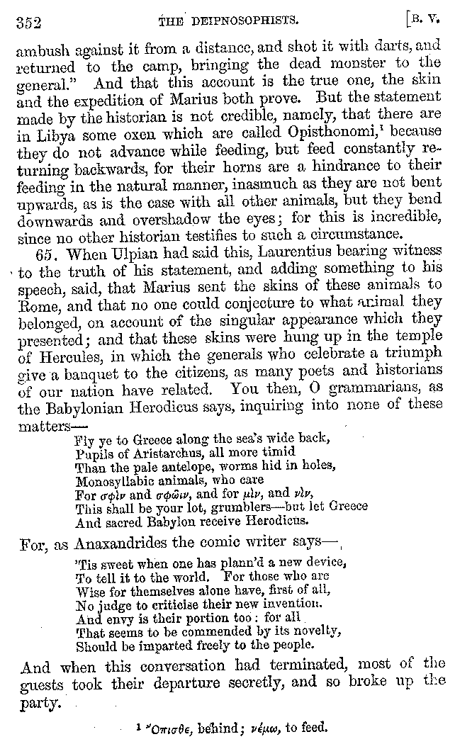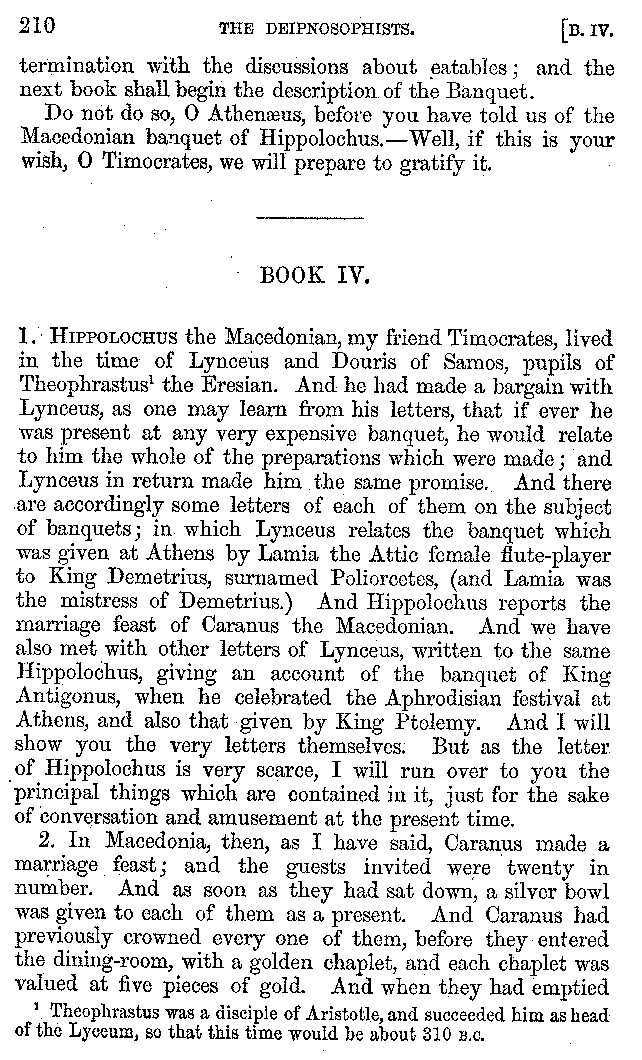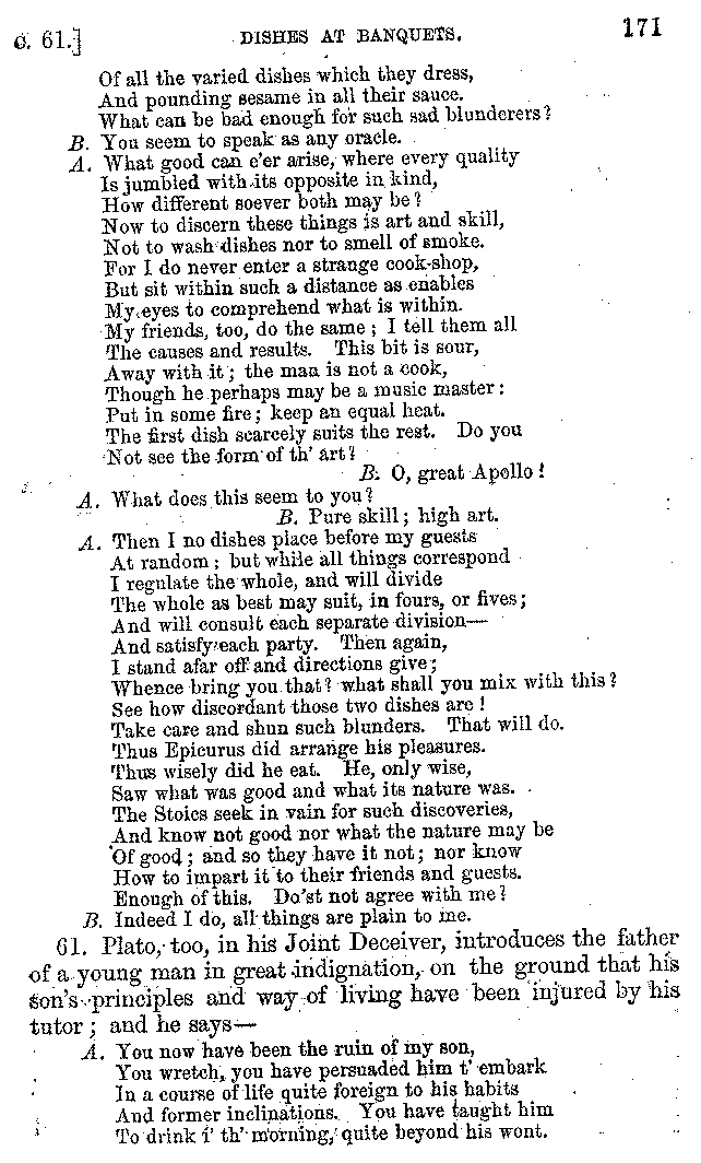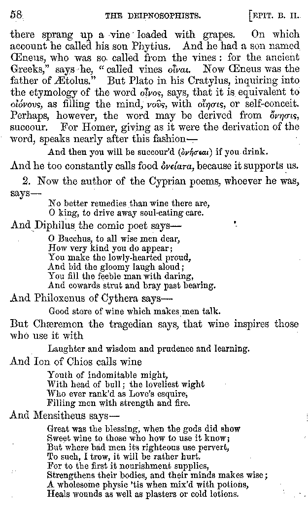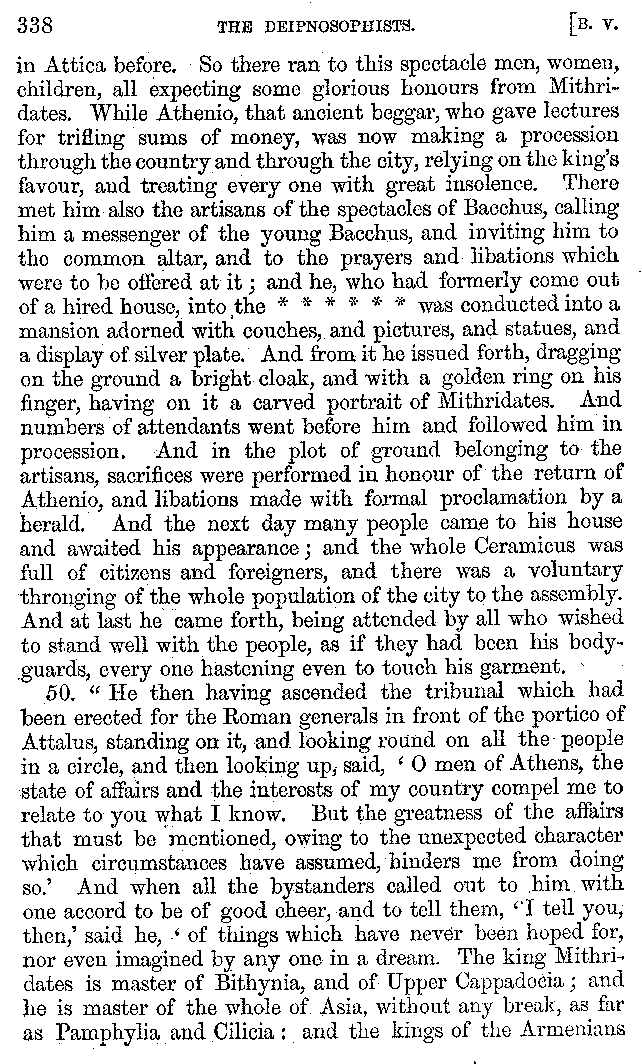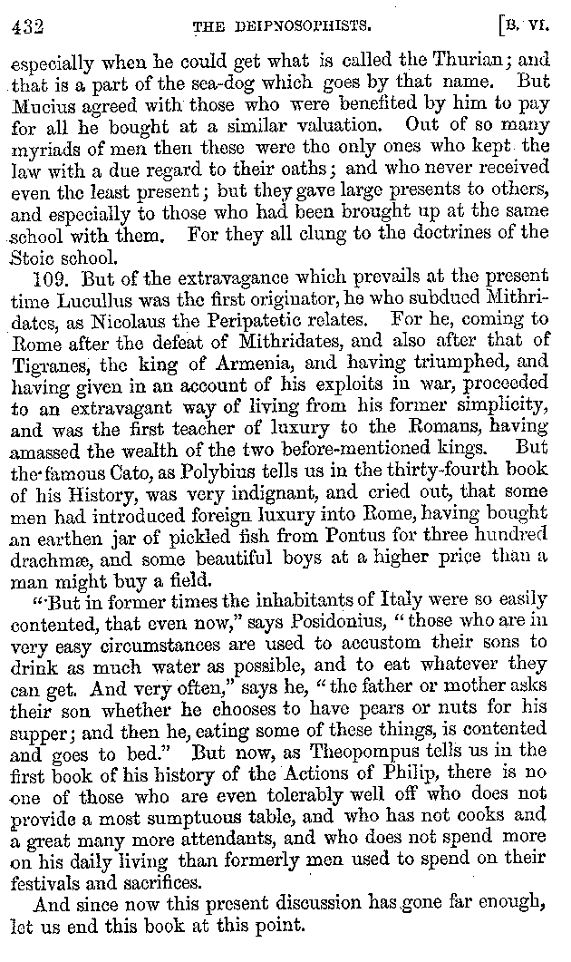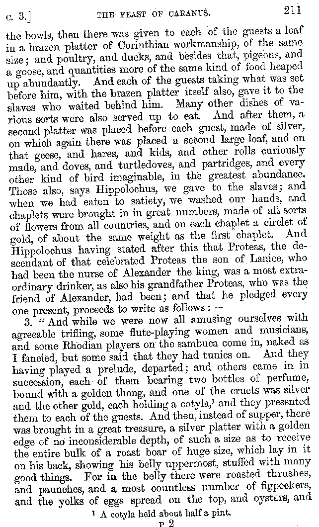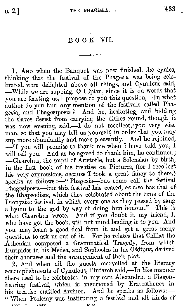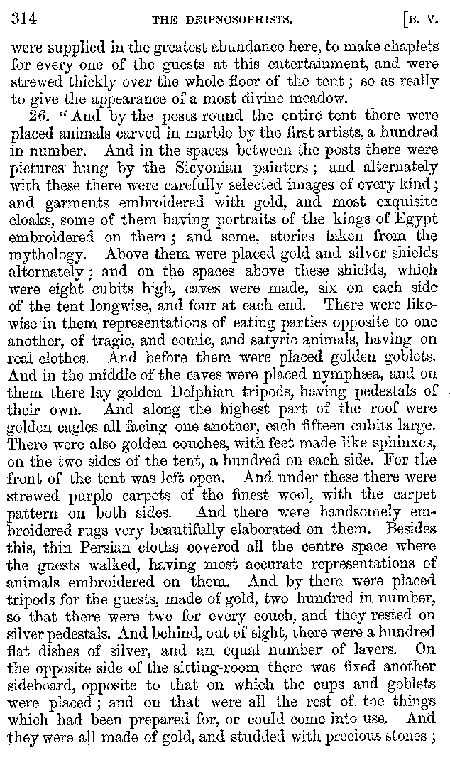 And the arrangement of the conversation is an imitation of a sumptuous banquet; and the plan of the book follows the arrangement of the conversation. This, then, is the delicious feast of words which this admirable master of the [2]feast, Athenæus, has prepared for us; and gradually surpassing himself, like the orator at Athens, as he warms with his subject, he bounds on towards the end of the book in noble strides.