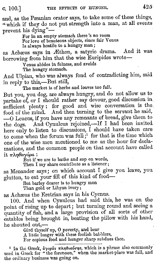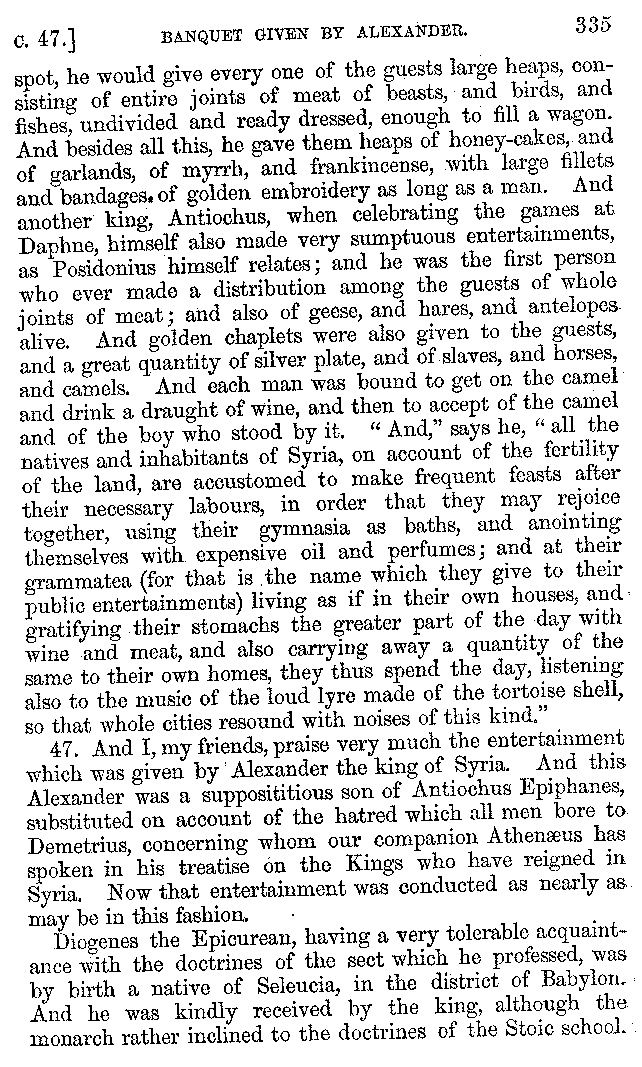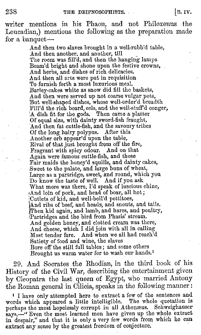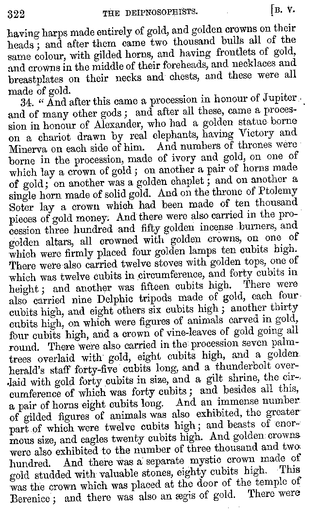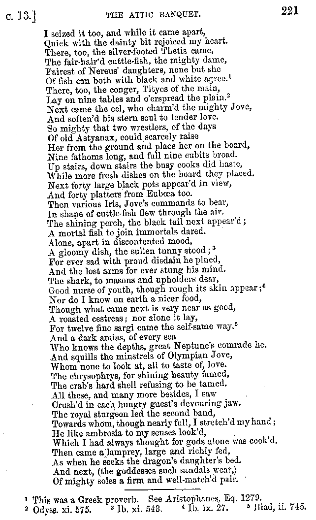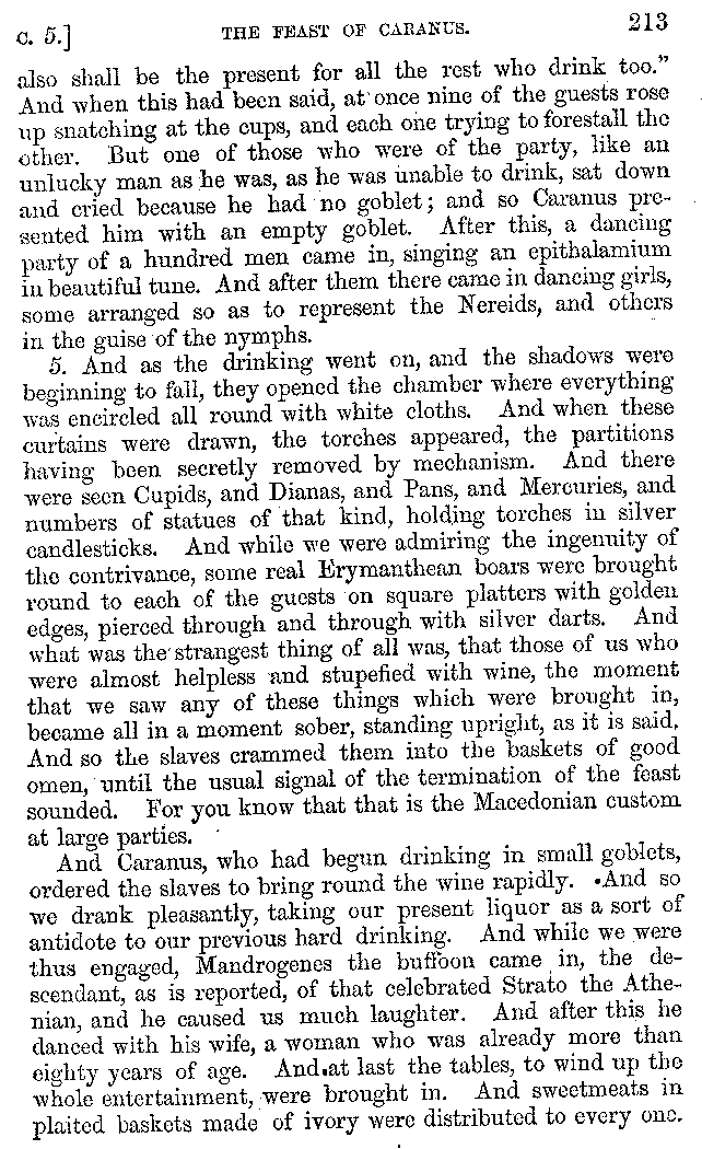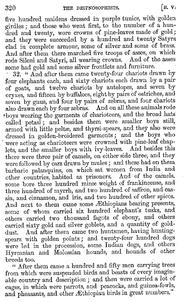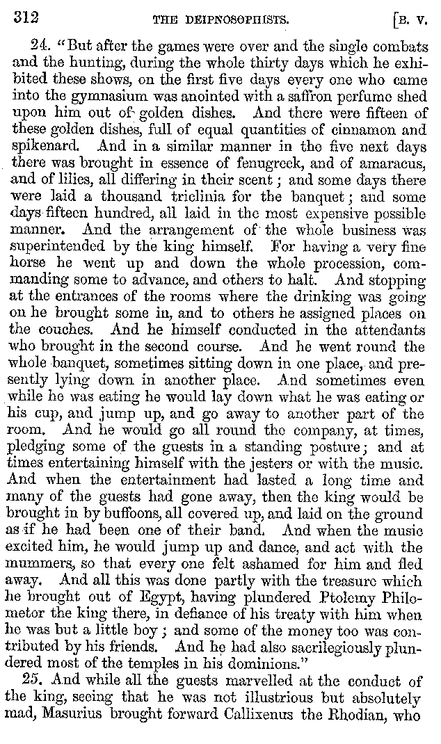 And the arrangement of the conversation is an imitation of a sumptuous banquet; and the plan of the book follows the arrangement of the conversation. This, then, is the delicious feast of words which this admirable master of the [2]feast, Athenæus, has prepared for us; and gradually surpassing himself, like the orator at Athens, as he warms with his subject, he bounds on towards the end of the book in noble strides.