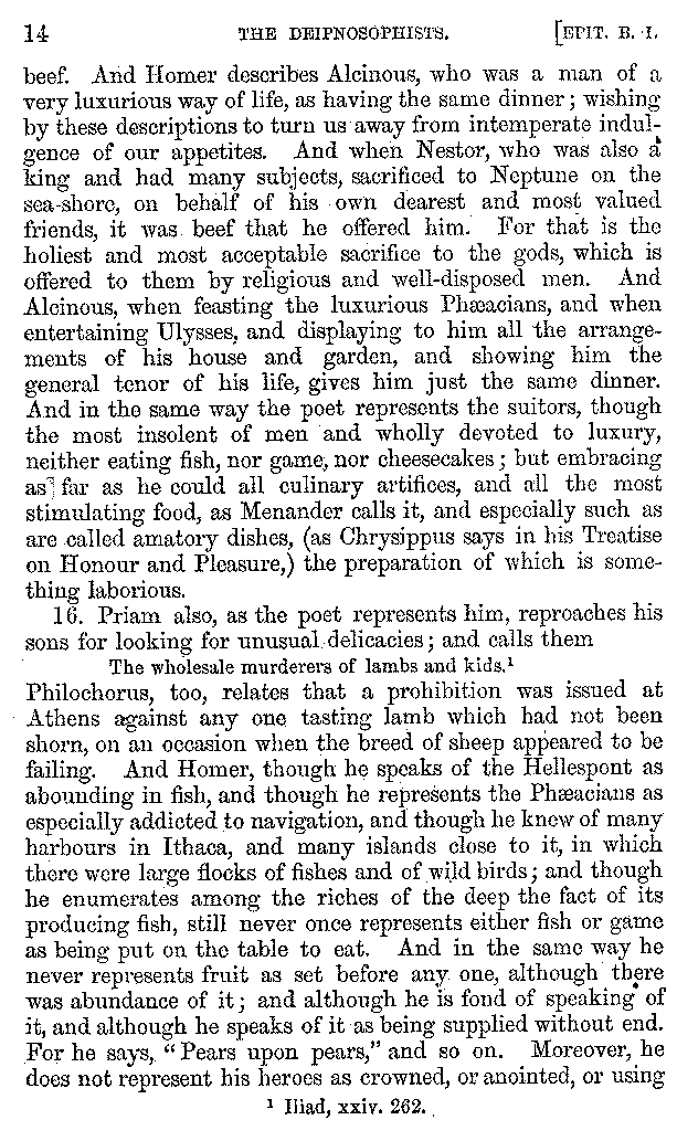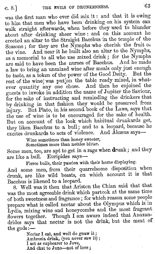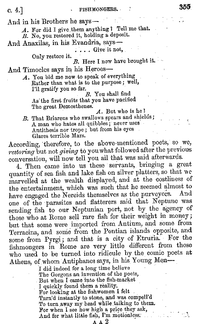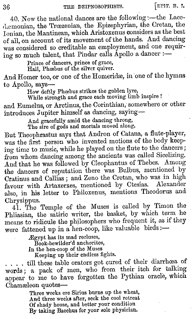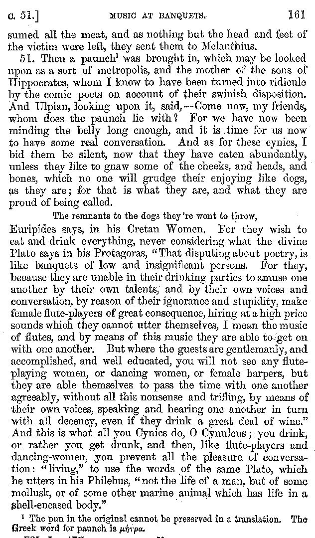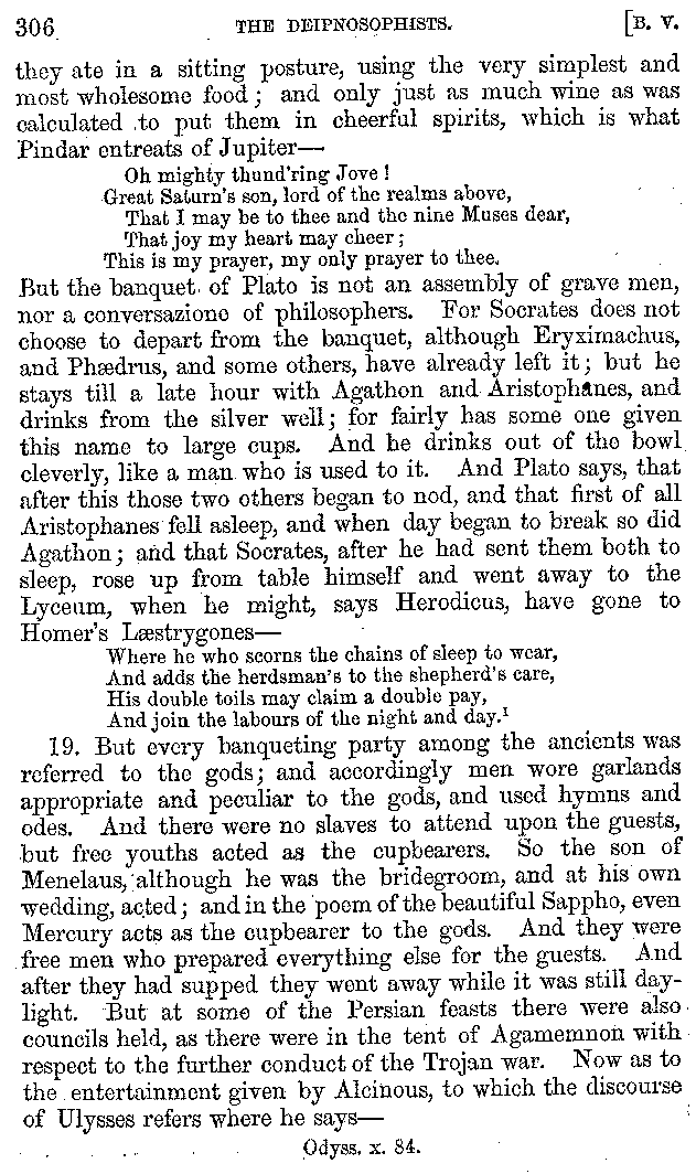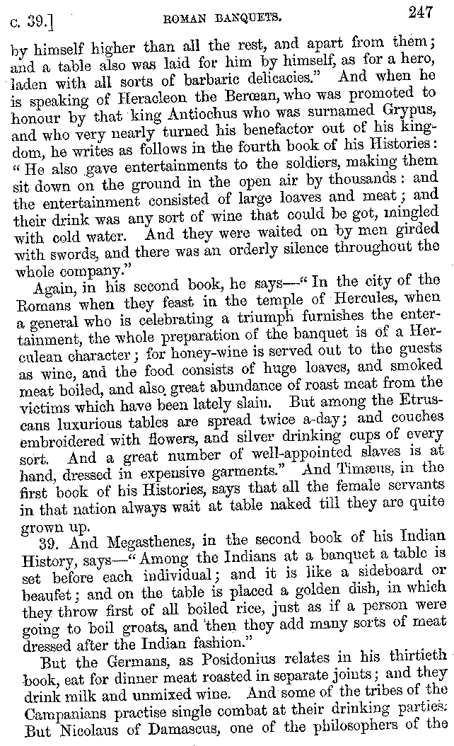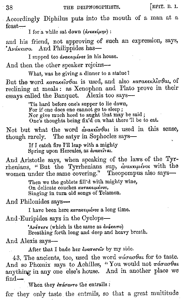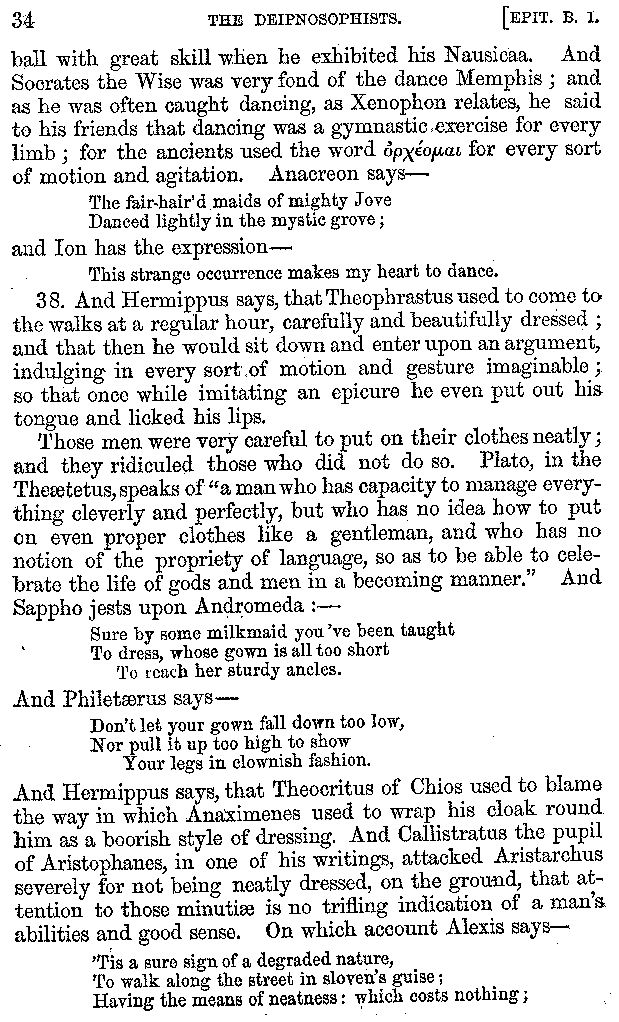 And the arrangement of the conversation is an imitation of a sumptuous banquet; and the plan of the book follows the arrangement of the conversation. This, then, is the delicious feast of words which this admirable master of the [2]feast, Athenæus, has prepared for us; and gradually surpassing himself, like the orator at Athens, as he warms with his subject, he bounds on towards the end of the book in noble strides.