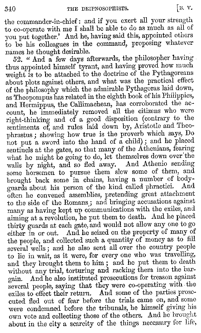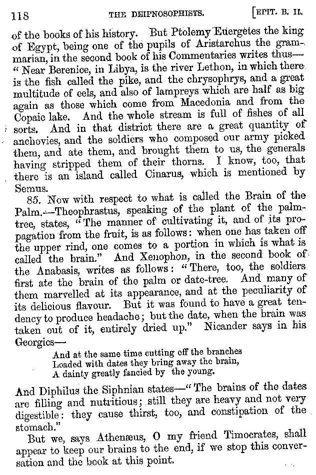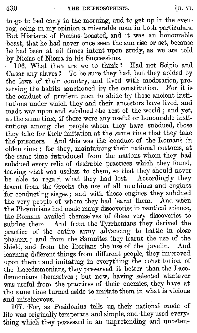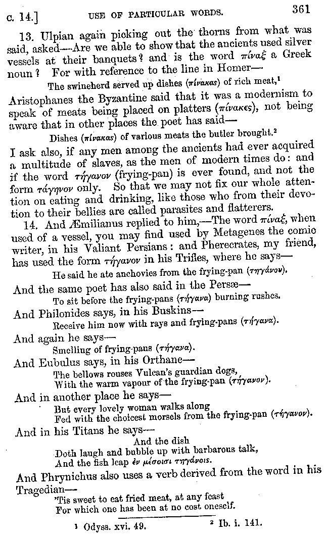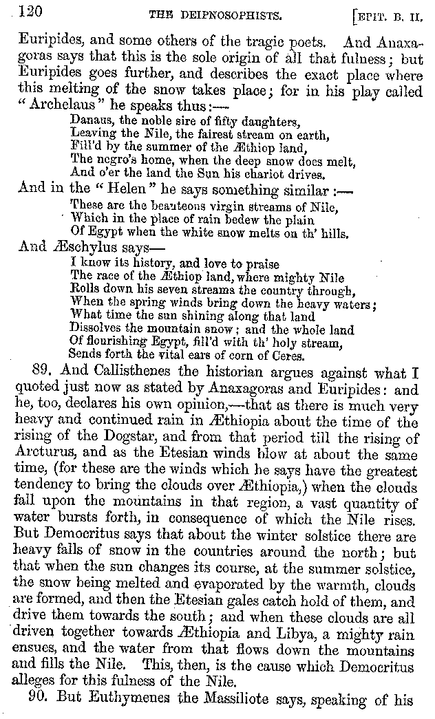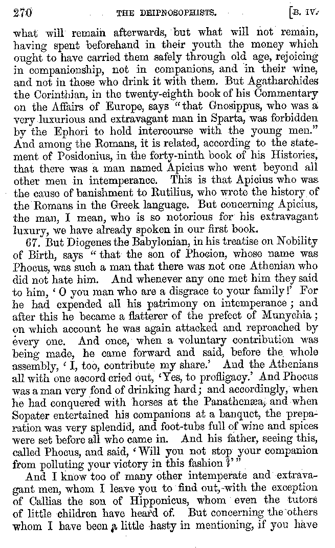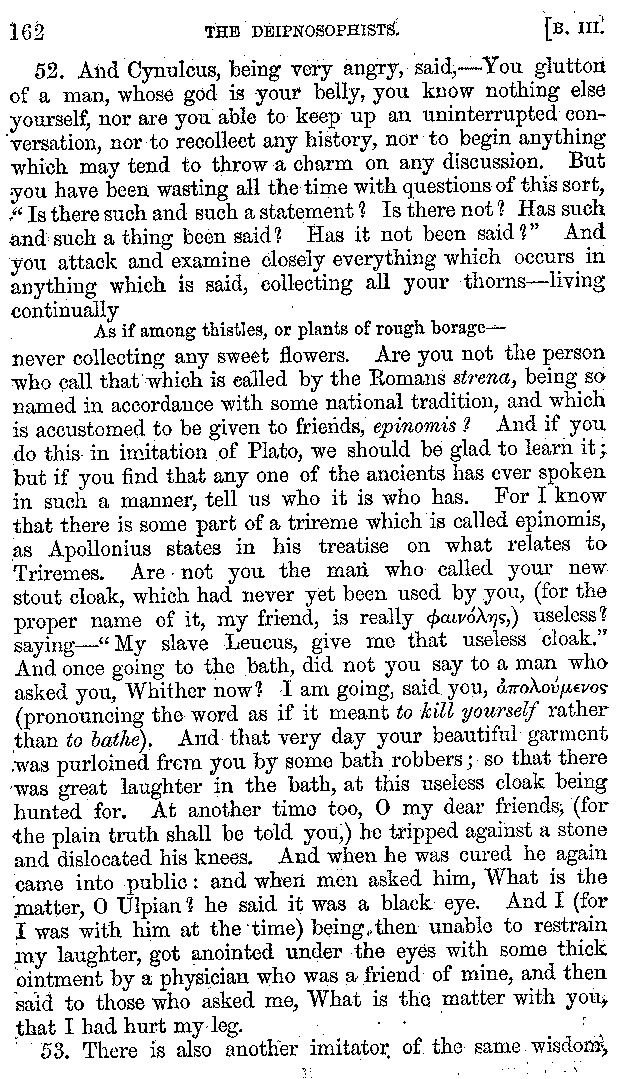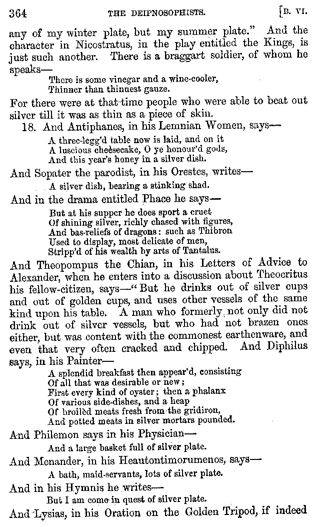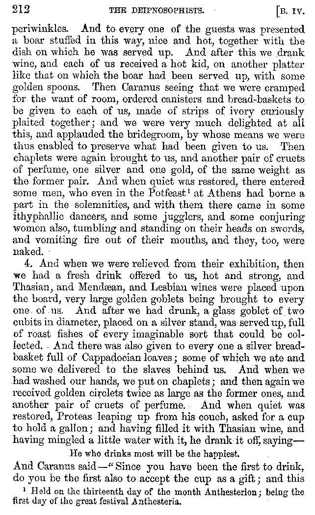 And the arrangement of the conversation is an imitation of a sumptuous banquet; and the plan of the book follows the arrangement of the conversation. This, then, is the delicious feast of words which this admirable master of the [2]feast, Athenæus, has prepared for us; and gradually surpassing himself, like the orator at Athens, as he warms with his subject, he bounds on towards the end of the book in noble strides.