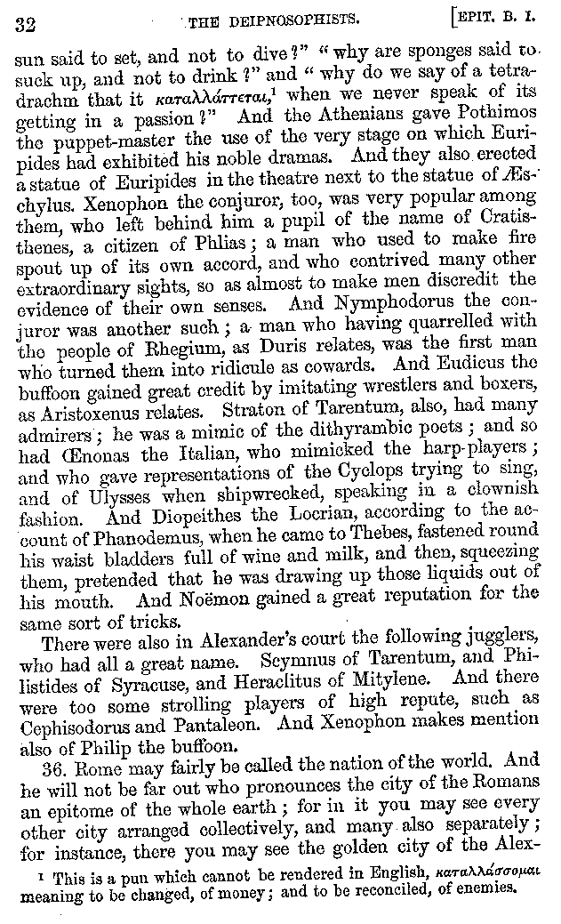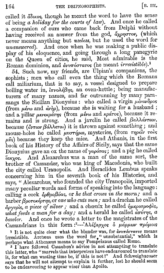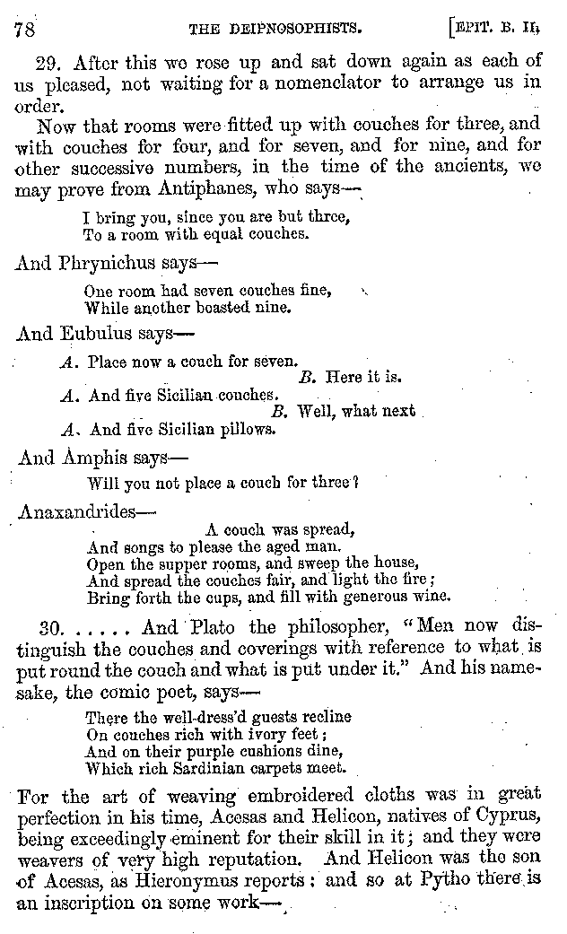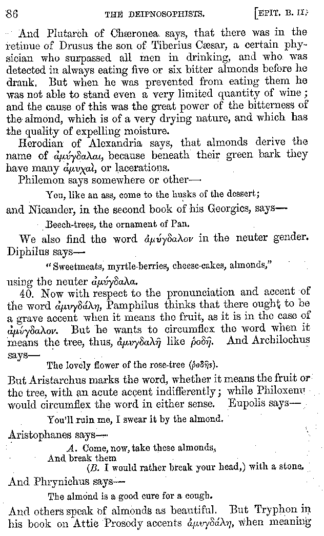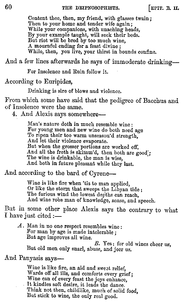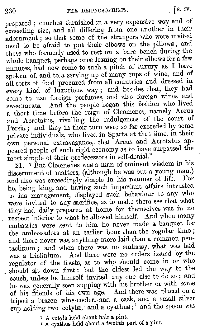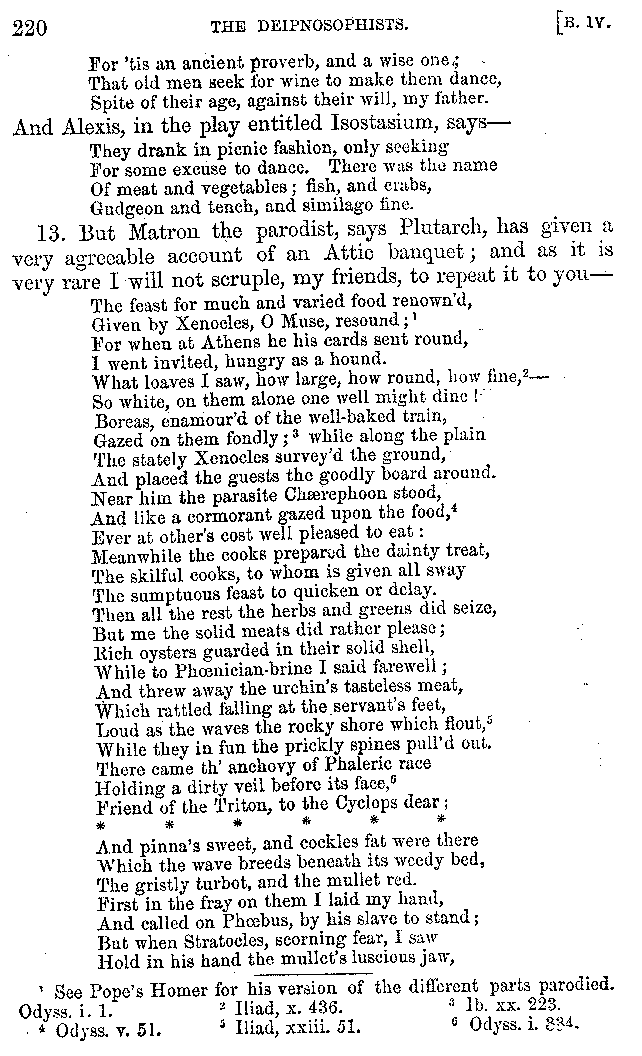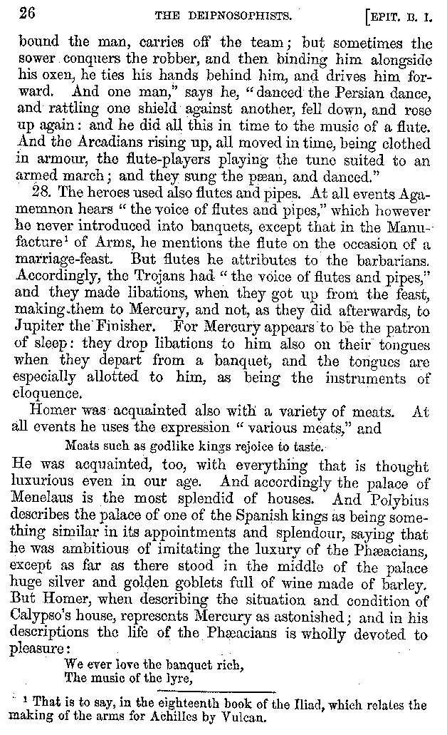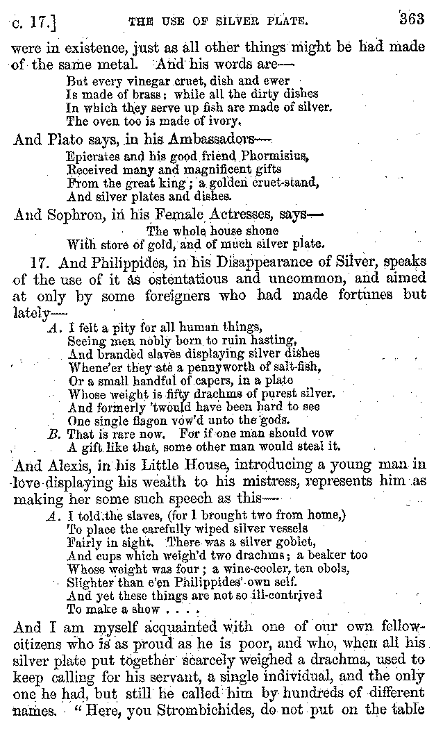 And the arrangement of the conversation is an imitation of a sumptuous banquet; and the plan of the book follows the arrangement of the conversation. This, then, is the delicious feast of words which this admirable master of the [2]feast, Athenæus, has prepared for us; and gradually surpassing himself, like the orator at Athens, as he warms with his subject, he bounds on towards the end of the book in noble strides.