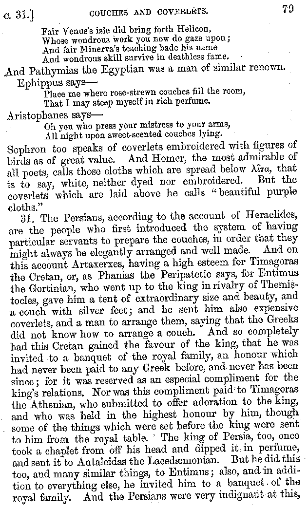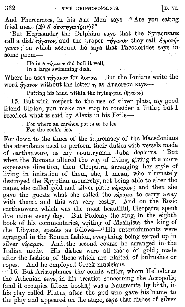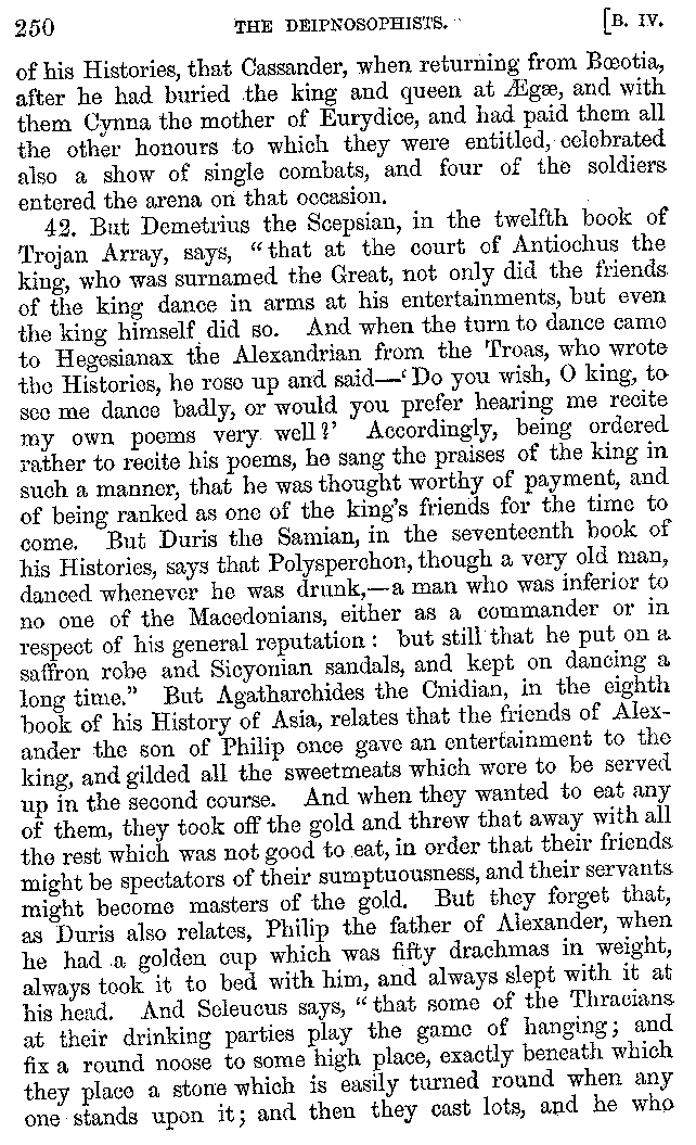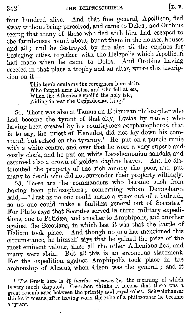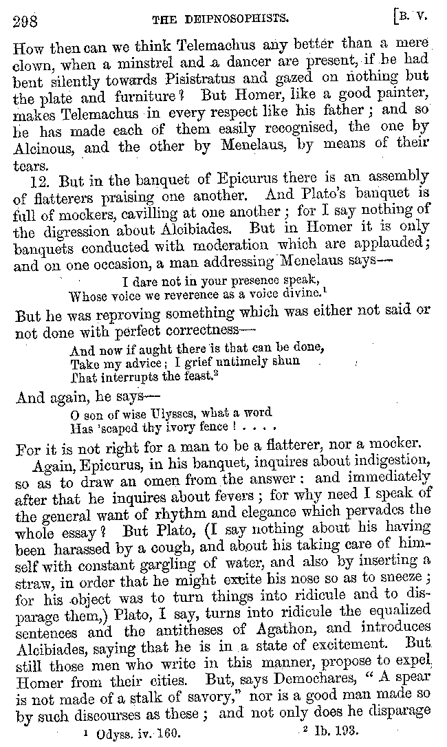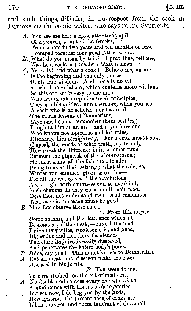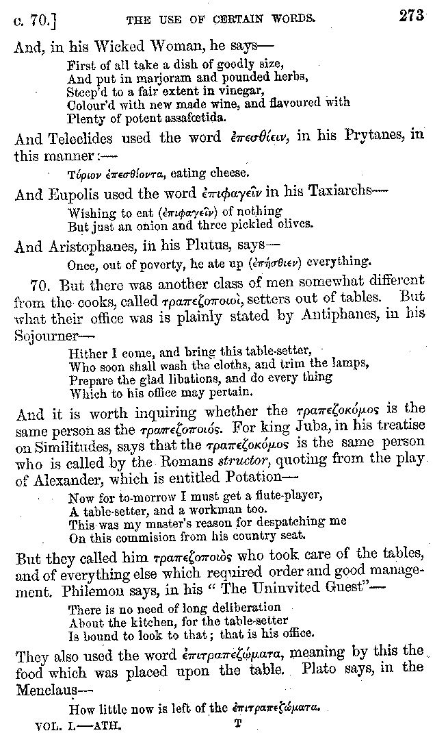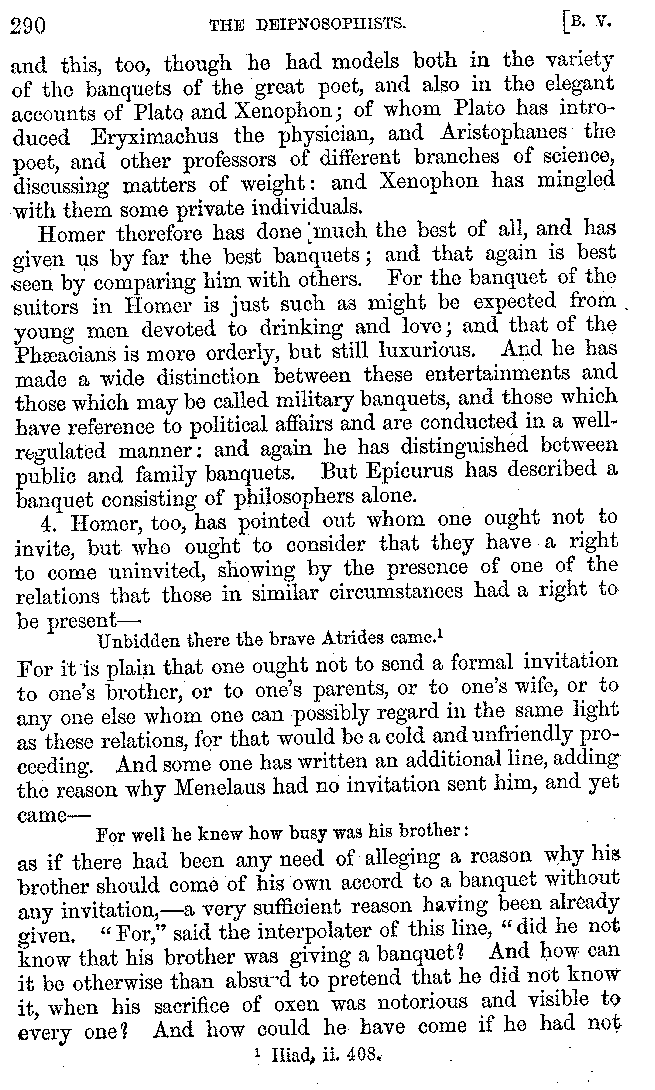 And the arrangement of the conversation is an imitation of a sumptuous banquet; and the plan of the book follows the arrangement of the conversation. This, then, is the delicious feast of words which this admirable master of the [2]feast, Athenæus, has prepared for us; and gradually surpassing himself, like the orator at Athens, as he warms with his subject, he bounds on towards the end of the book in noble strides.