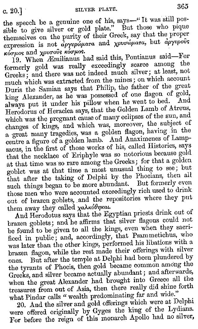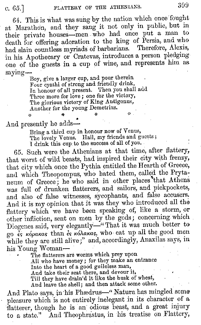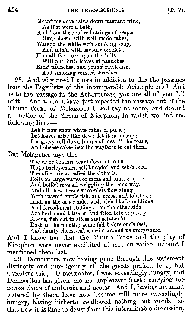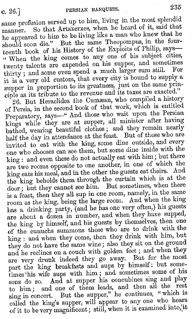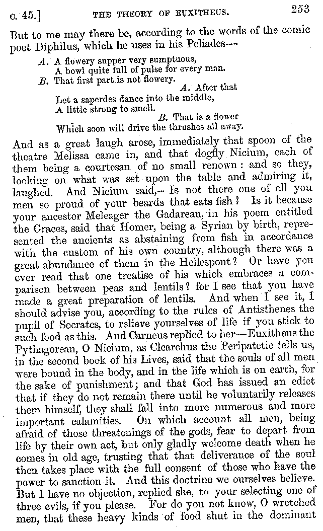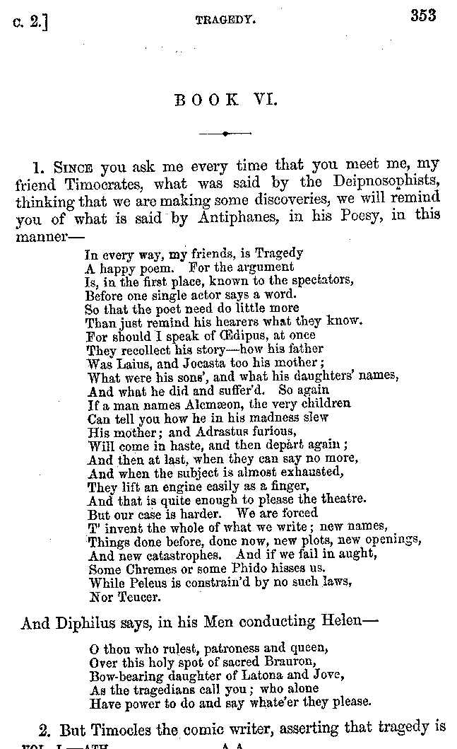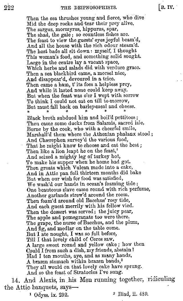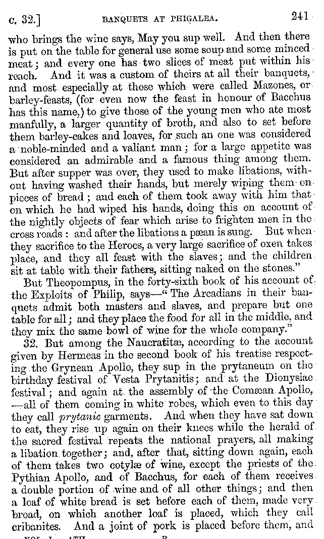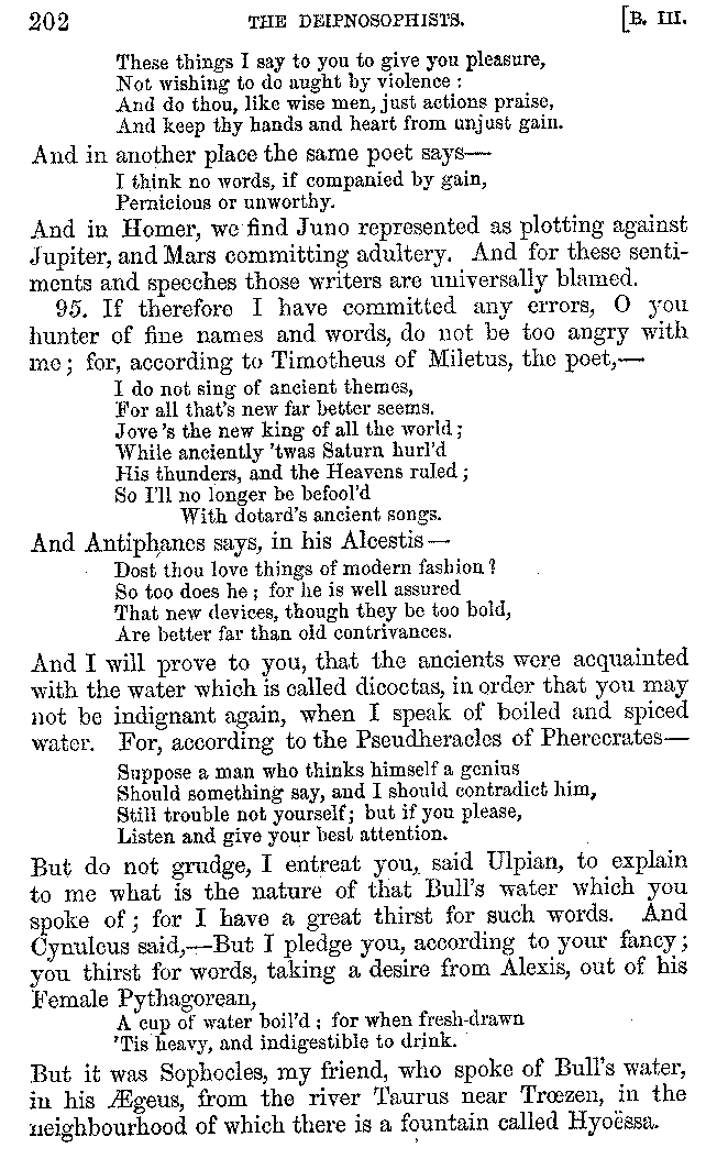 And the arrangement of the conversation is an imitation of a sumptuous banquet; and the plan of the book follows the arrangement of the conversation. This, then, is the delicious feast of words which this admirable master of the [2]feast, Athenæus, has prepared for us; and gradually surpassing himself, like the orator at Athens, as he warms with his subject, he bounds on towards the end of the book in noble strides.