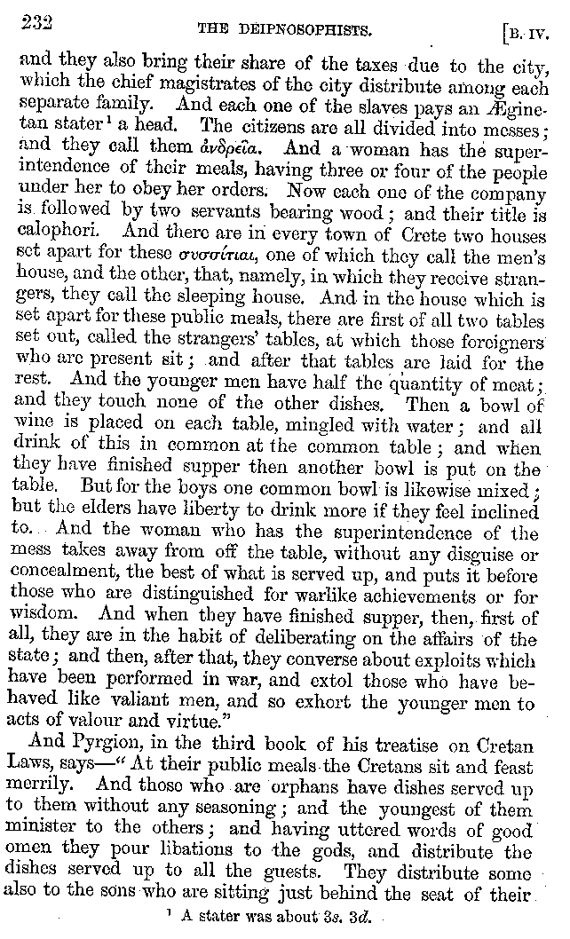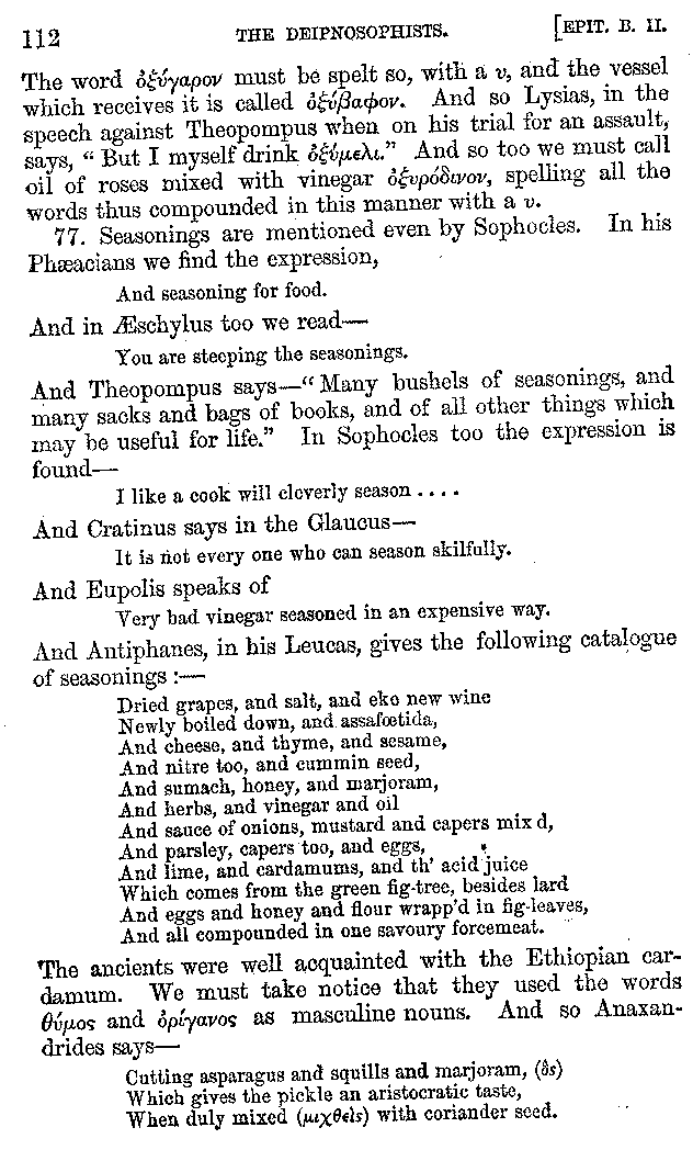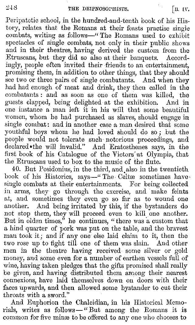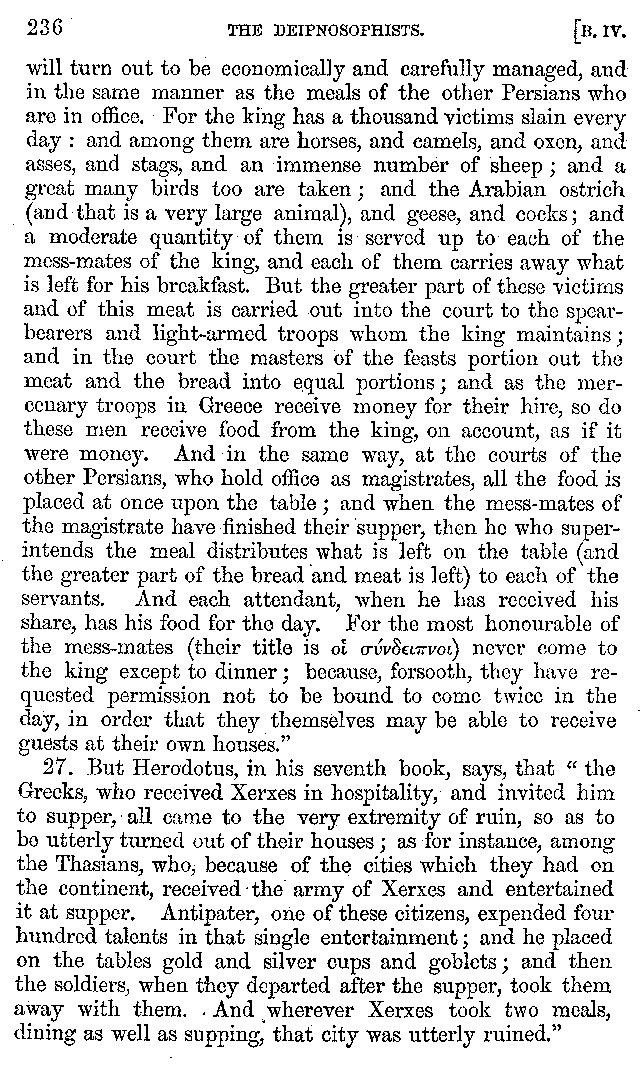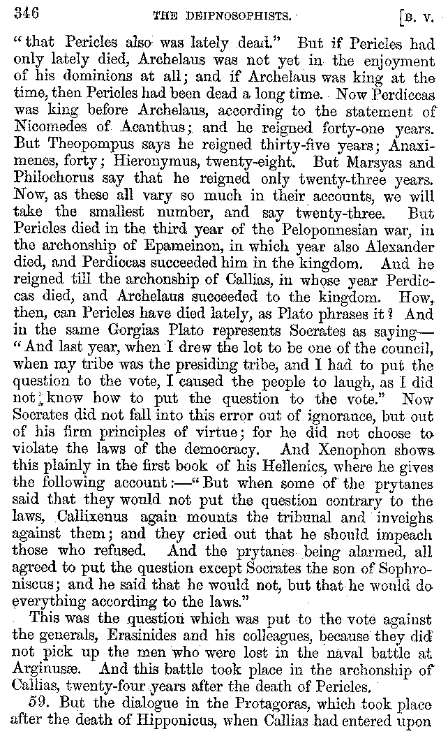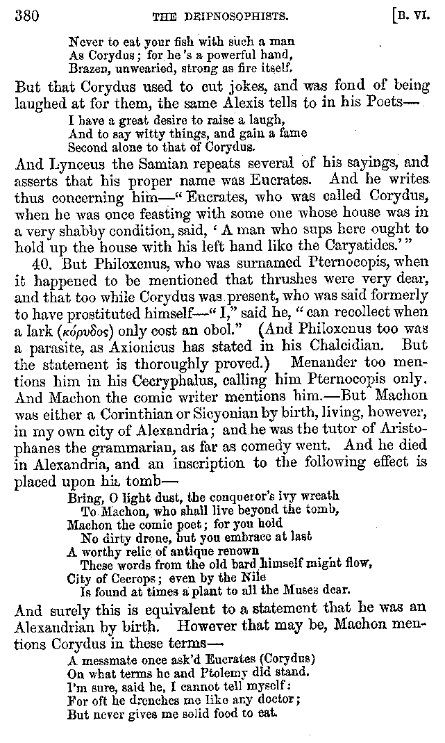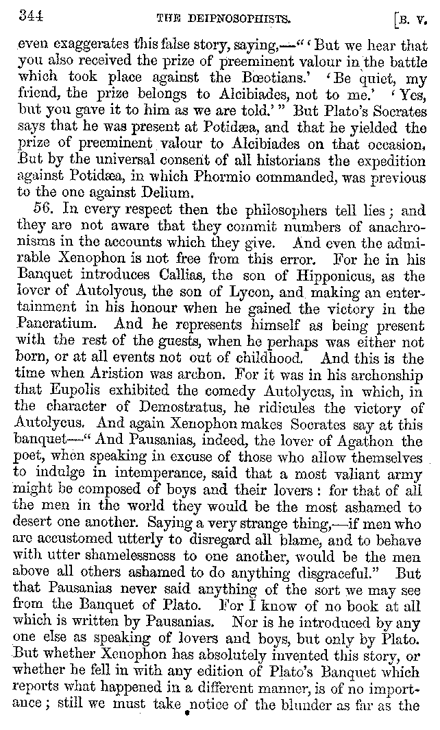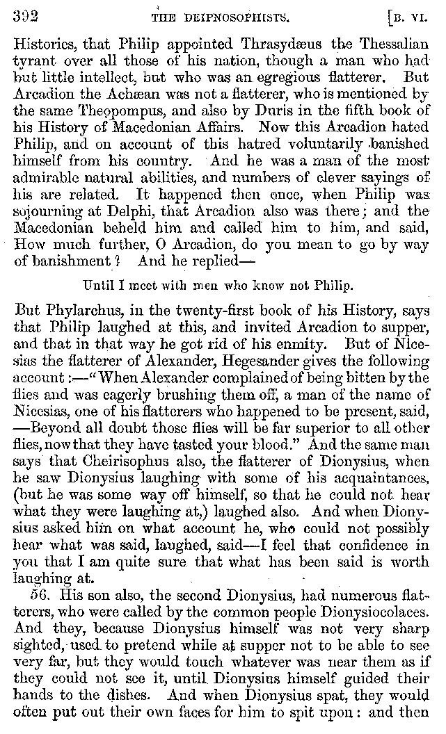 And the arrangement of the conversation is an imitation of a sumptuous banquet; and the plan of the book follows the arrangement of the conversation. This, then, is the delicious feast of words which this admirable master of the [2]feast, Athenæus, has prepared for us; and gradually surpassing himself, like the orator at Athens, as he warms with his subject, he bounds on towards the end of the book in noble strides.