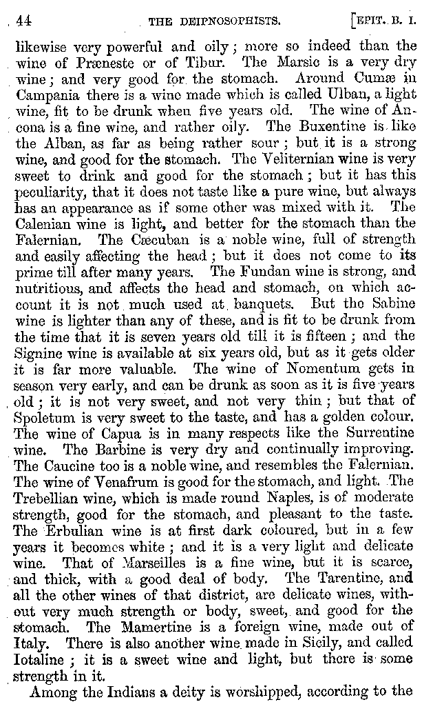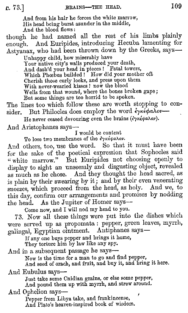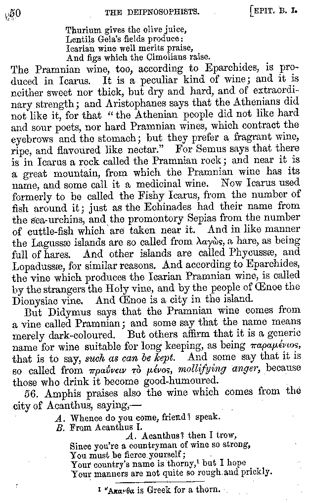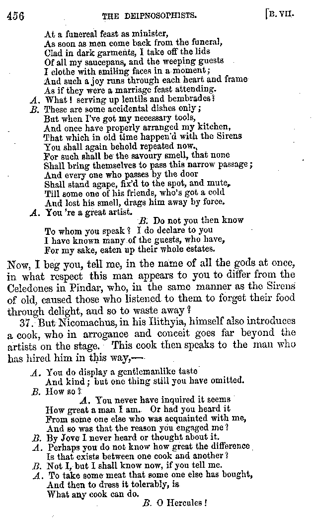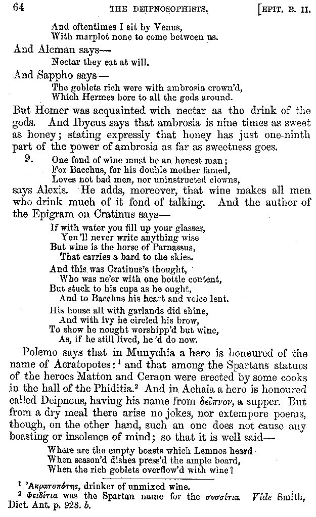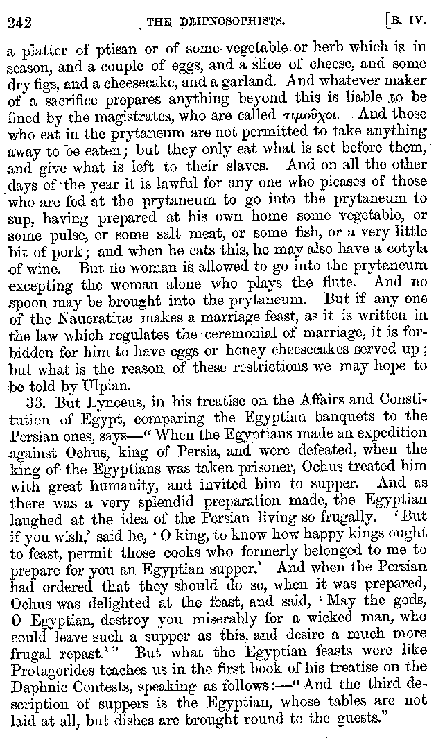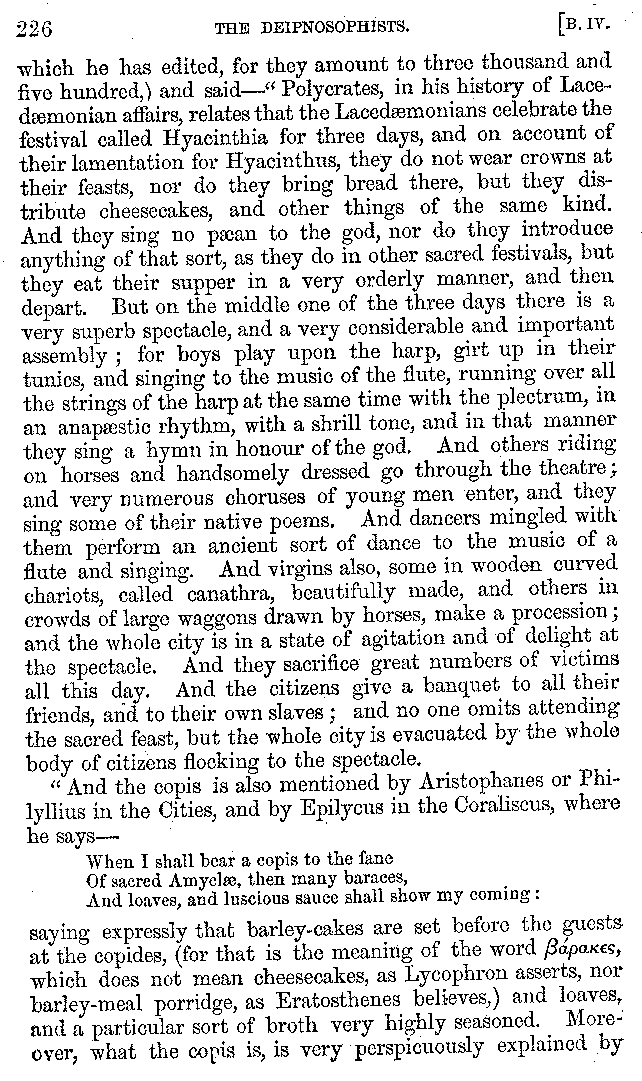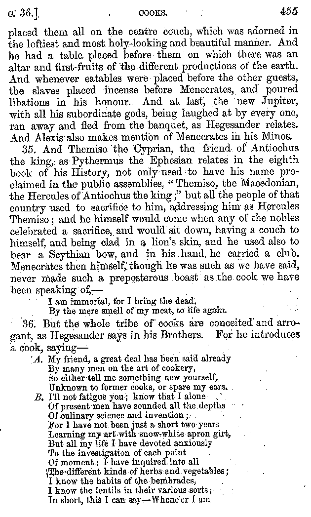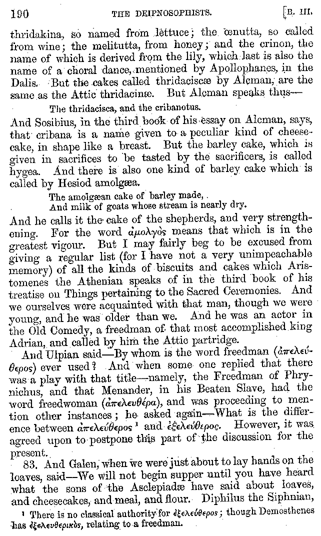 And the arrangement of the conversation is an imitation of a sumptuous banquet; and the plan of the book follows the arrangement of the conversation. This, then, is the delicious feast of words which this admirable master of the [2]feast, Athenæus, has prepared for us; and gradually surpassing himself, like the orator at Athens, as he warms with his subject, he bounds on towards the end of the book in noble strides.