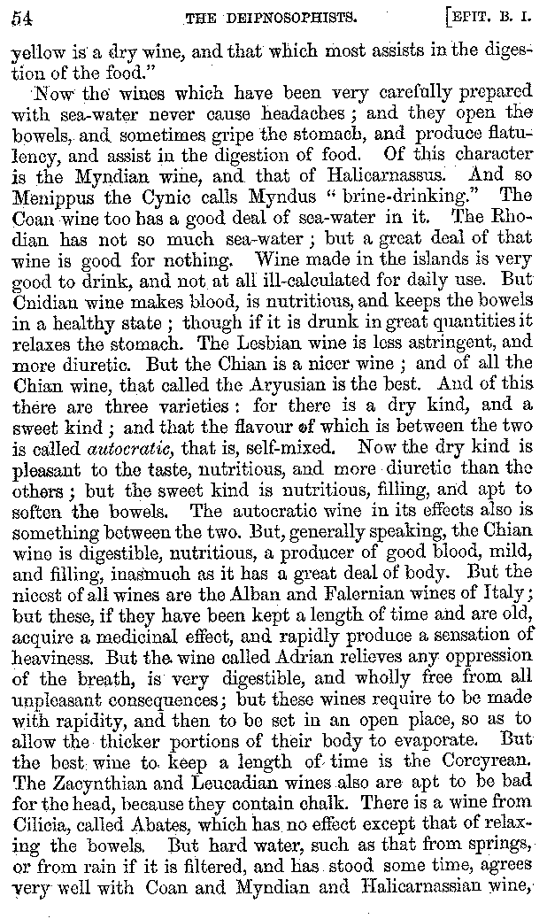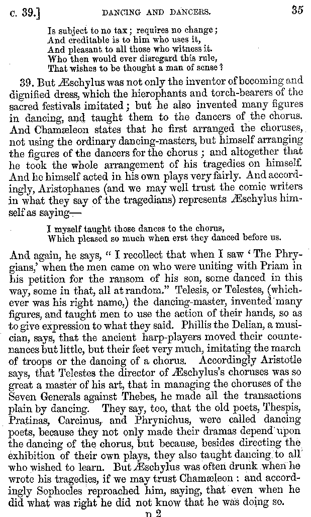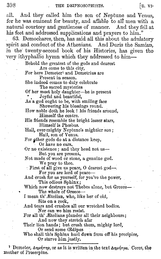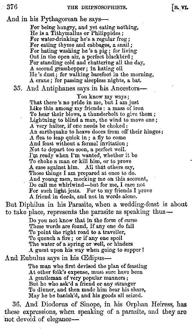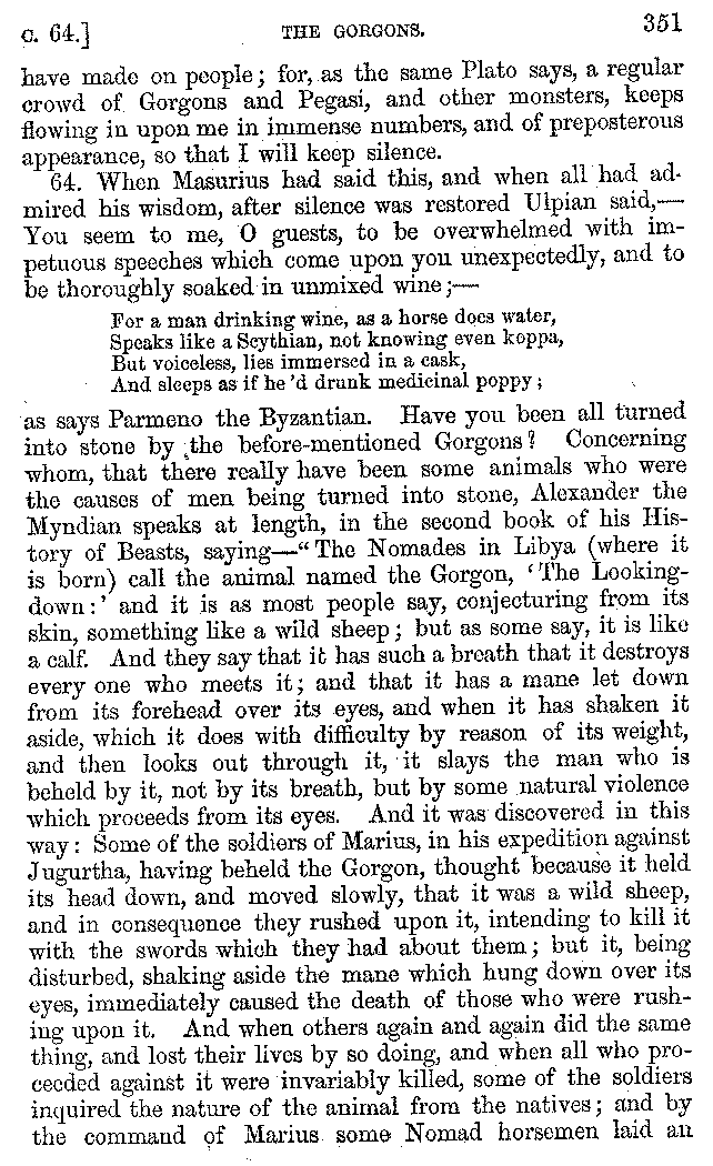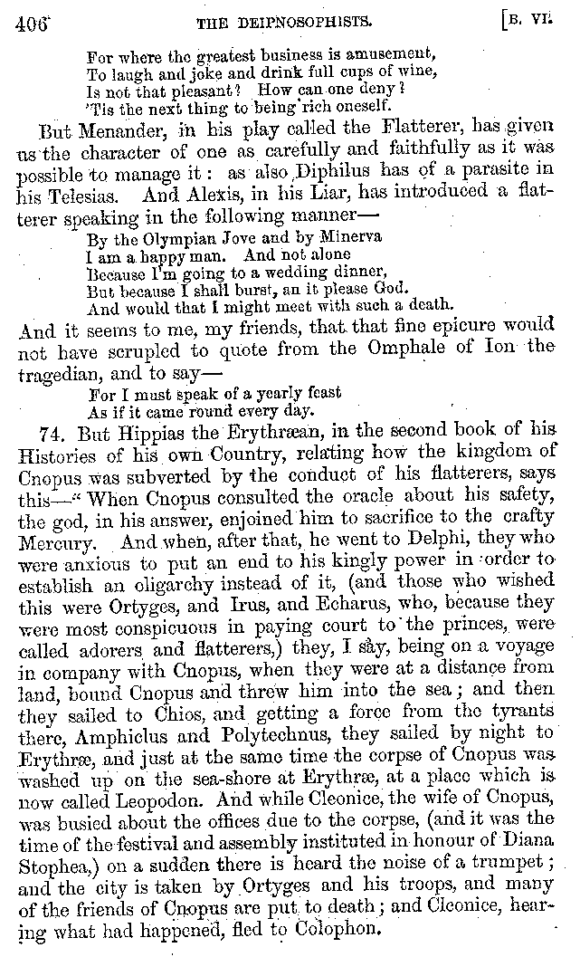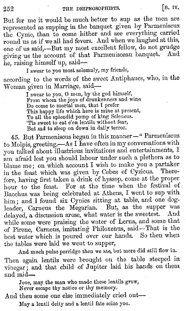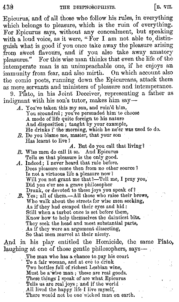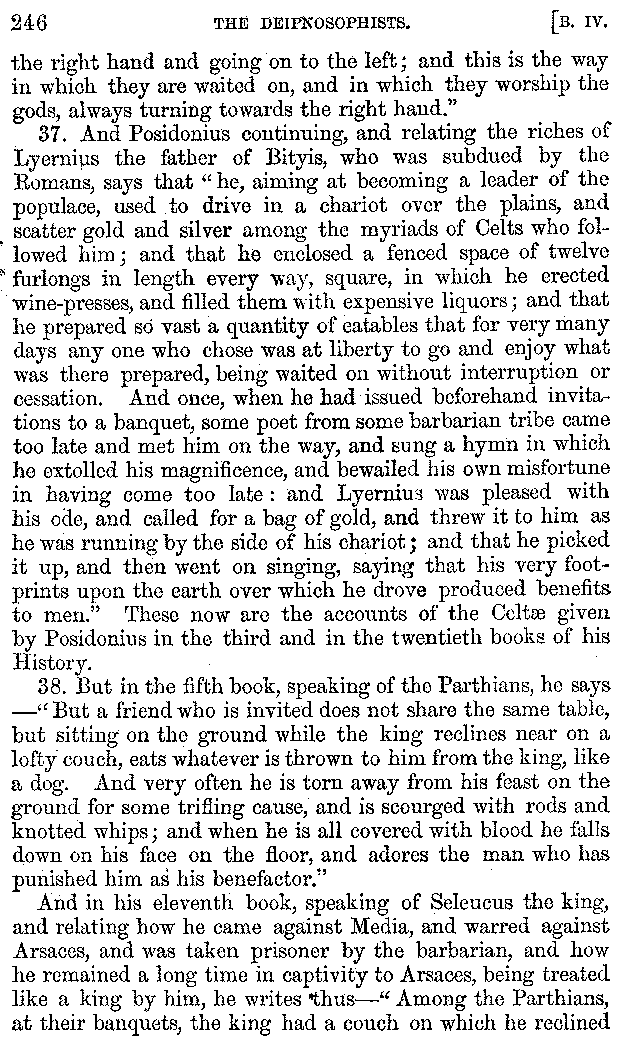 And the arrangement of the conversation is an imitation of a sumptuous banquet; and the plan of the book follows the arrangement of the conversation. This, then, is the delicious feast of words which this admirable master of the [2]feast, Athenæus, has prepared for us; and gradually surpassing himself, like the orator at Athens, as he warms with his subject, he bounds on towards the end of the book in noble strides.