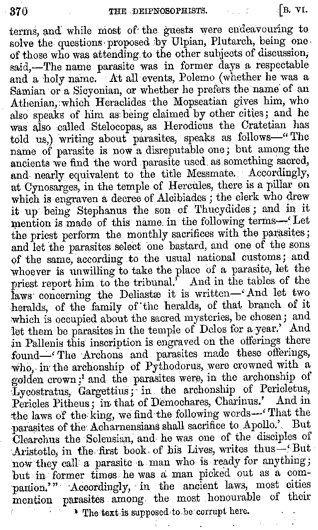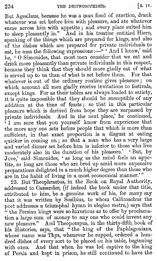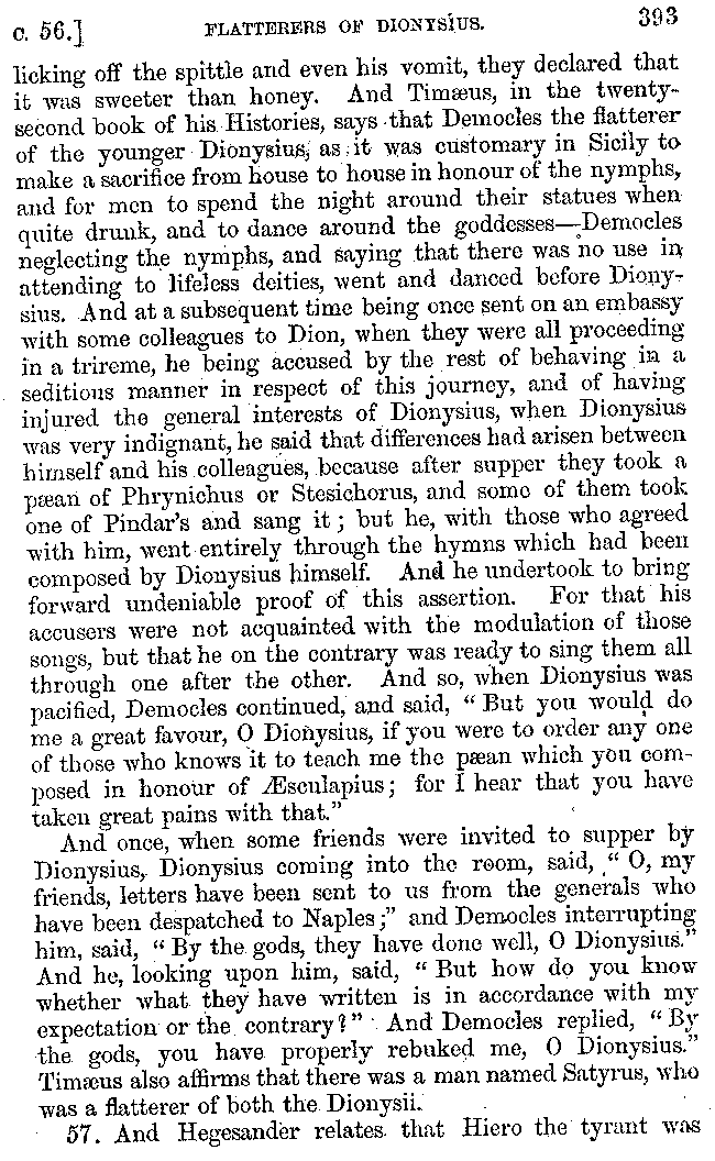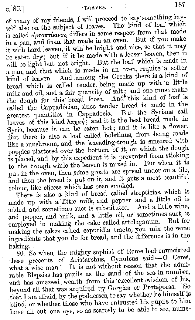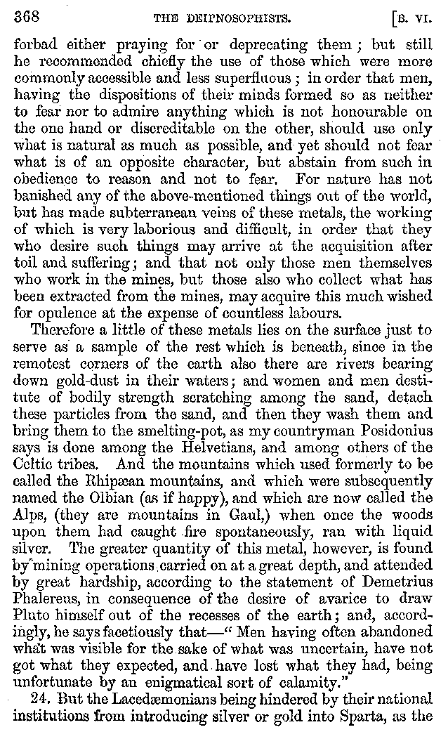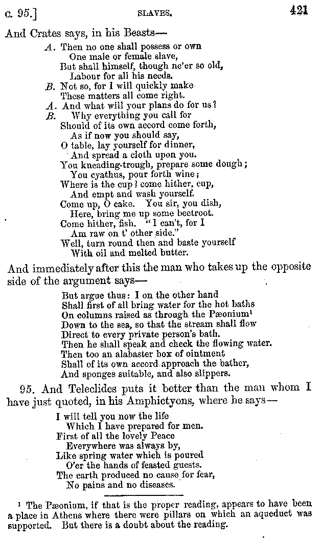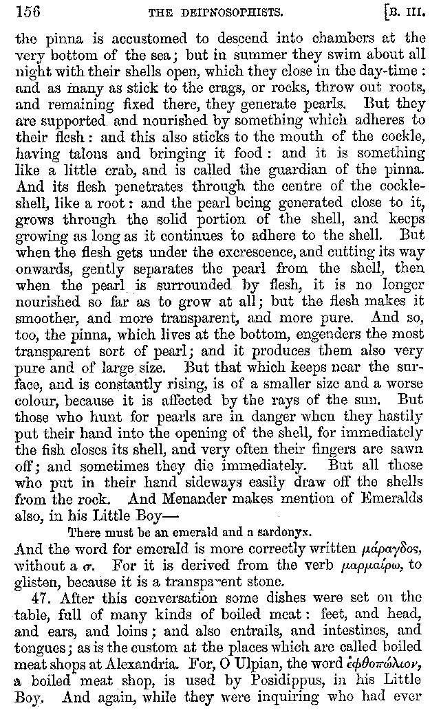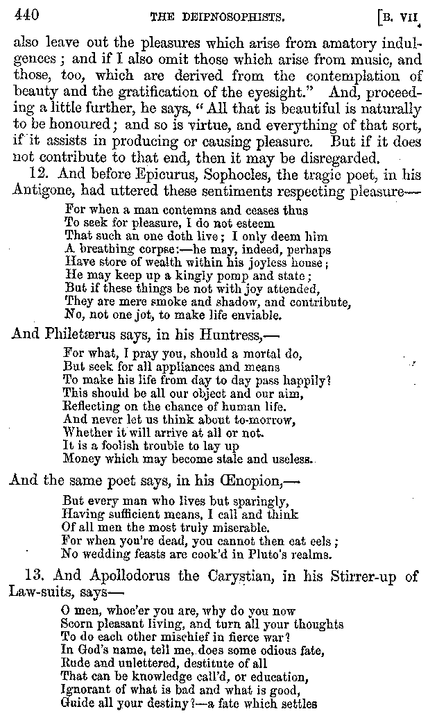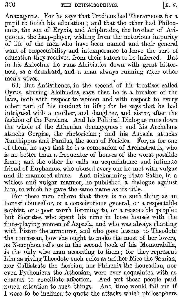 And the arrangement of the conversation is an imitation of a sumptuous banquet; and the plan of the book follows the arrangement of the conversation. This, then, is the delicious feast of words which this admirable master of the [2]feast, Athenæus, has prepared for us; and gradually surpassing himself, like the orator at Athens, as he warms with his subject, he bounds on towards the end of the book in noble strides.