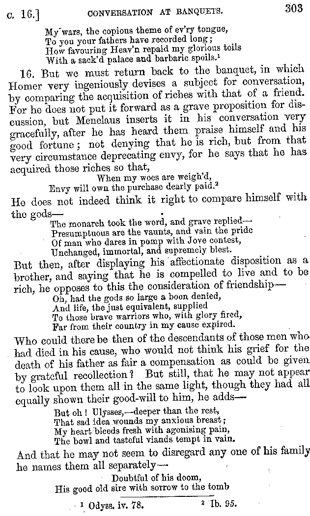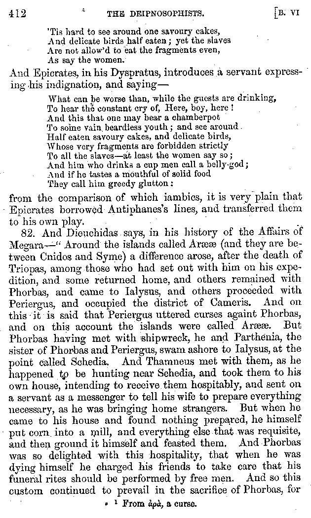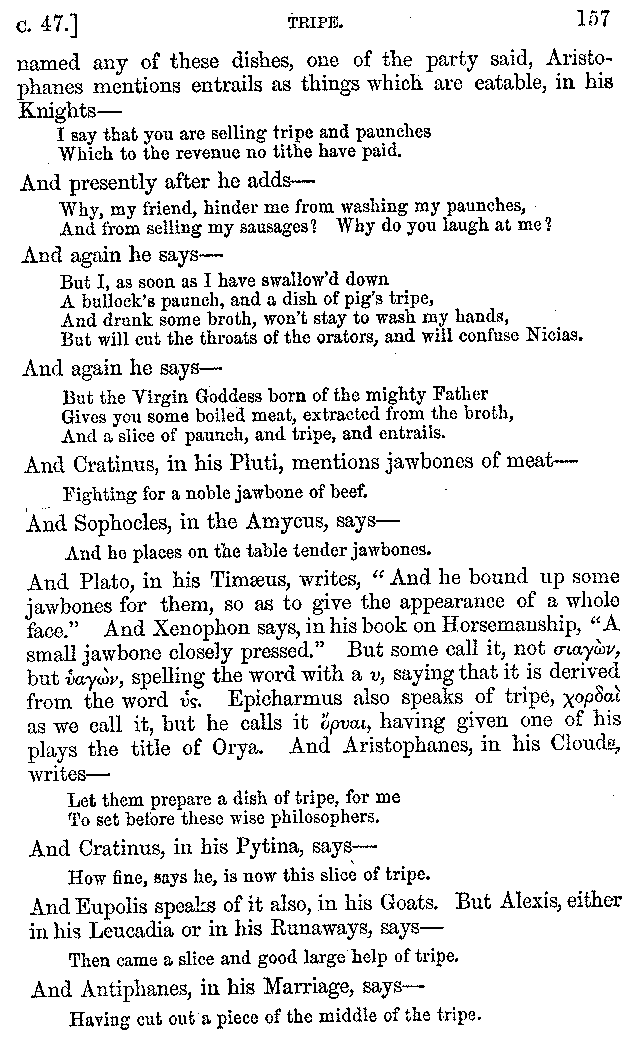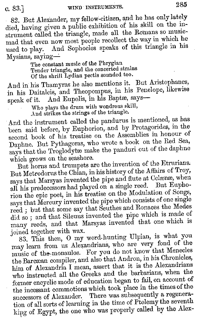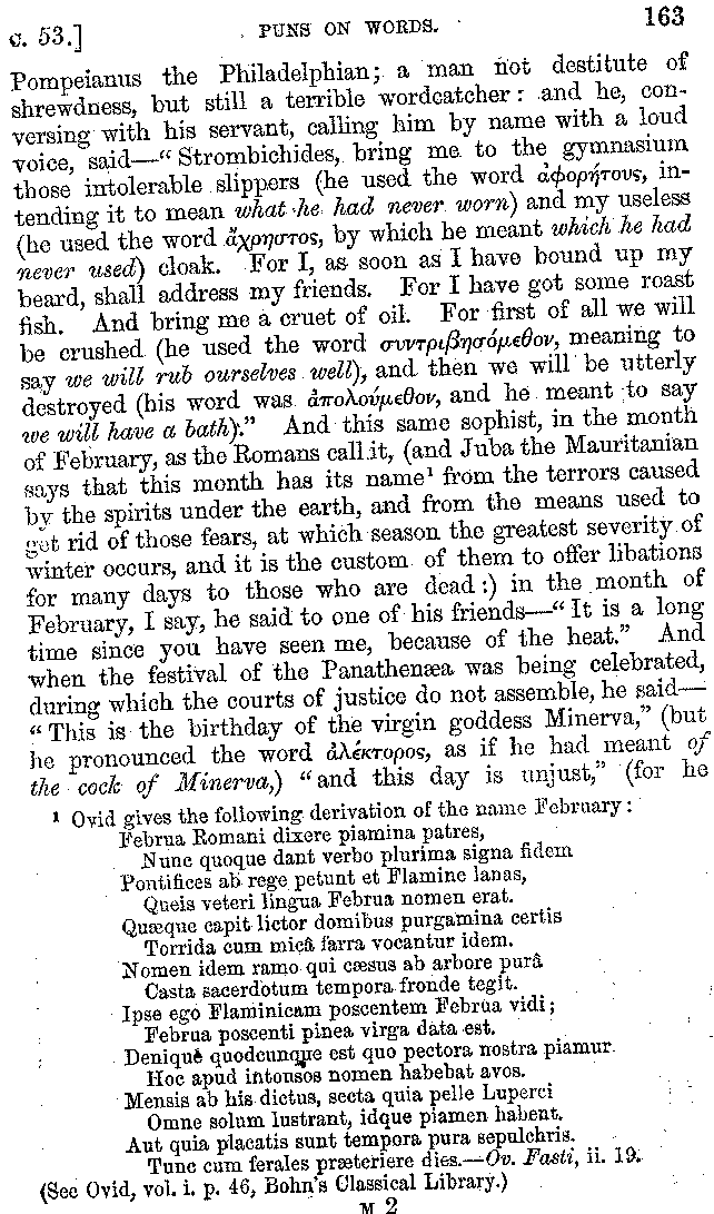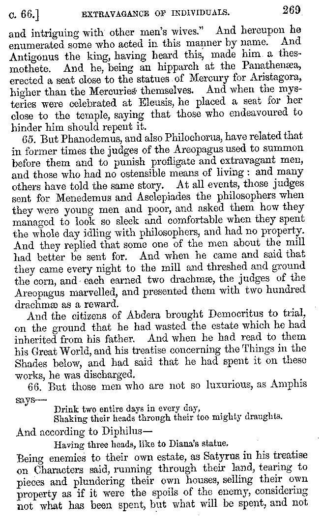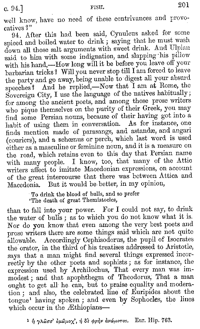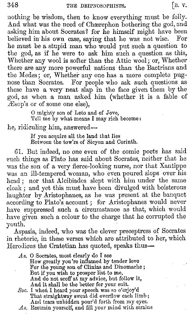 And the arrangement of the conversation is an imitation of a sumptuous banquet; and the plan of the book follows the arrangement of the conversation. This, then, is the delicious feast of words which this admirable master of the [2]feast, Athenæus, has prepared for us; and gradually surpassing himself, like the orator at Athens, as he warms with his subject, he bounds on towards the end of the book in noble strides.