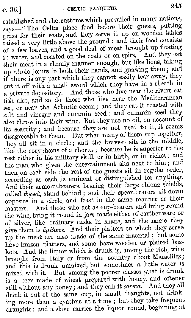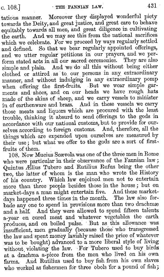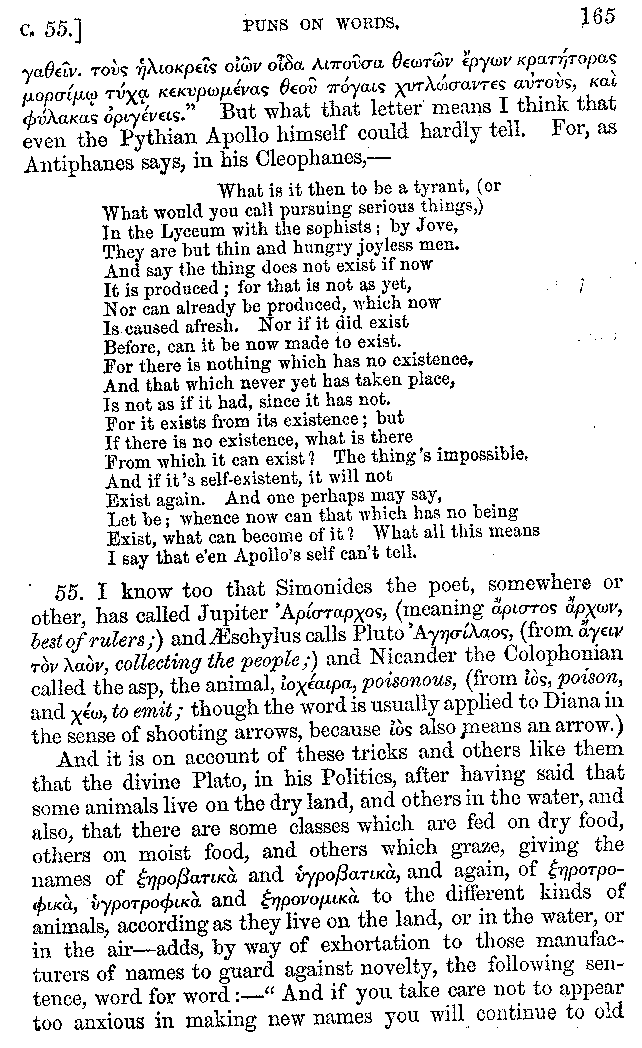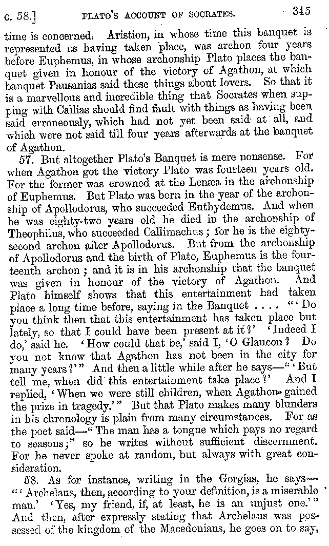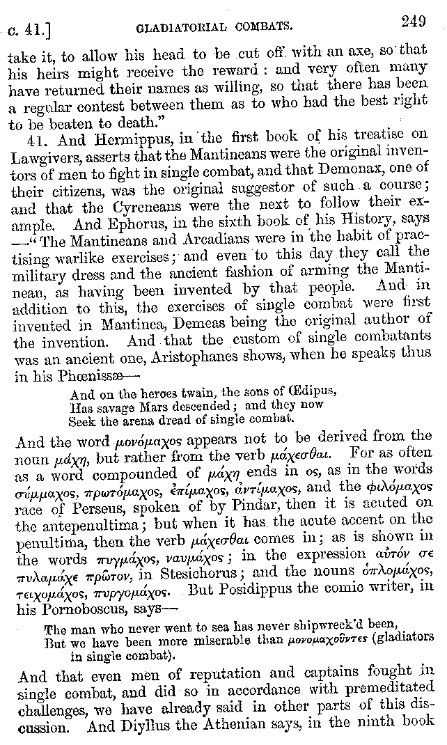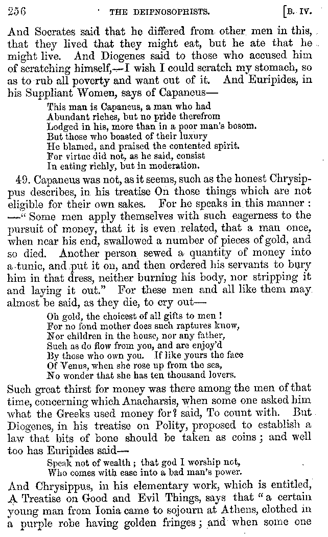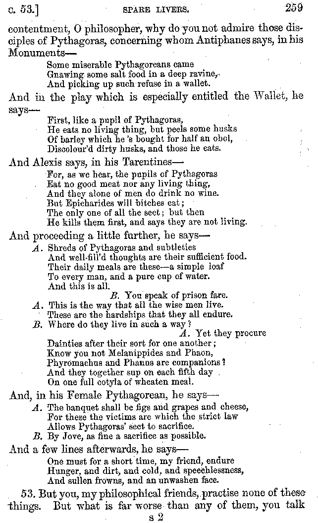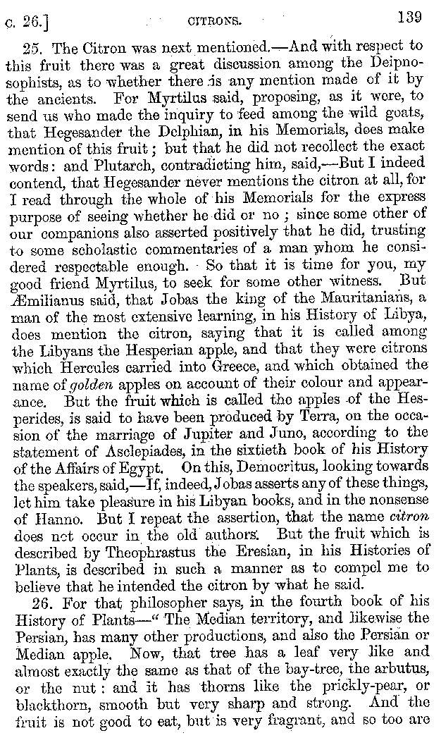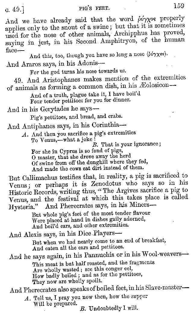 And the arrangement of the conversation is an imitation of a sumptuous banquet; and the plan of the book follows the arrangement of the conversation. This, then, is the delicious feast of words which this admirable master of the [2]feast, Athenæus, has prepared for us; and gradually surpassing himself, like the orator at Athens, as he warms with his subject, he bounds on towards the end of the book in noble strides.