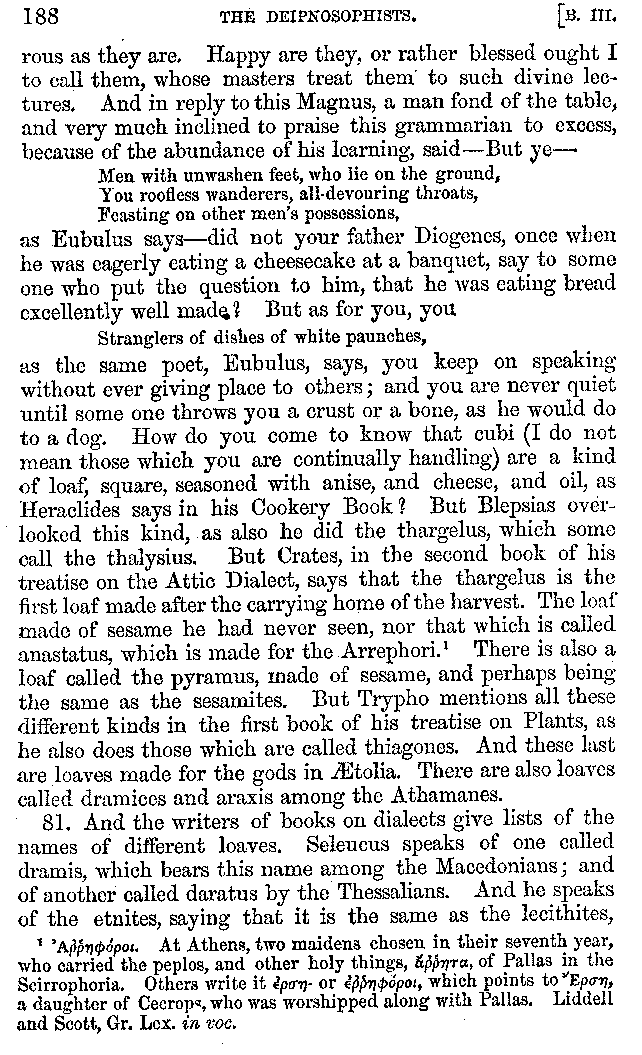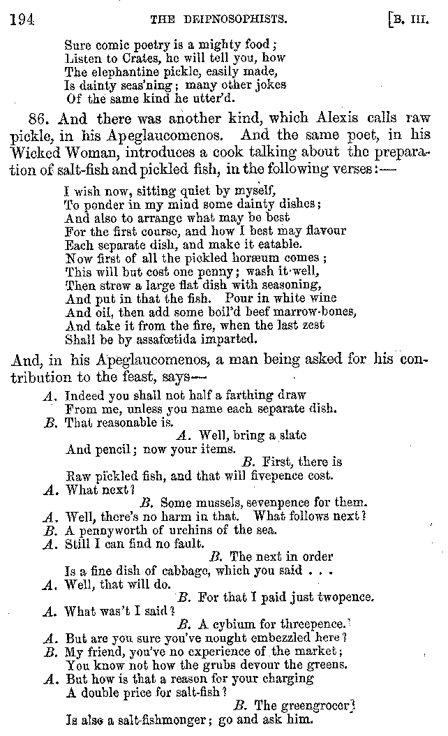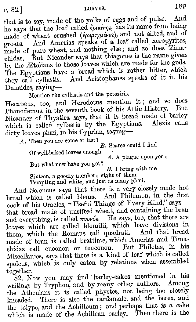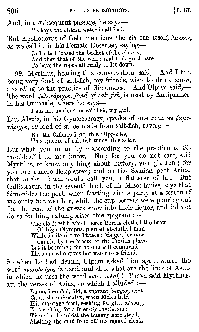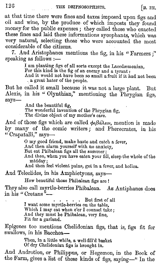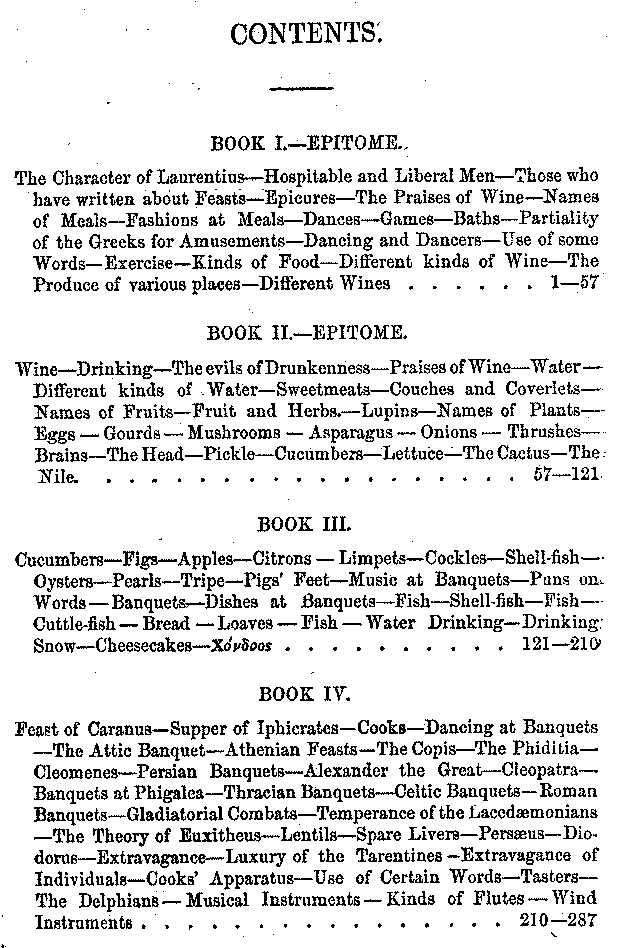 | Cucumbers—Figs—Apples—Citrons—Limpets—Cockles—Shell-fish—Oysters—Pearls—Tripe—Pigs' Feet—Music at Banquets—Puns on Words—Banquets—Dishes at Banquets—Fish—Shell-fish—Fish—Cuttle-fish—Bread—Loaves—Fish—Water Drinking—Drinking Snow—Cheesecakes—Χόνδοος | 121-210 |