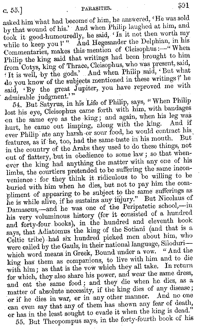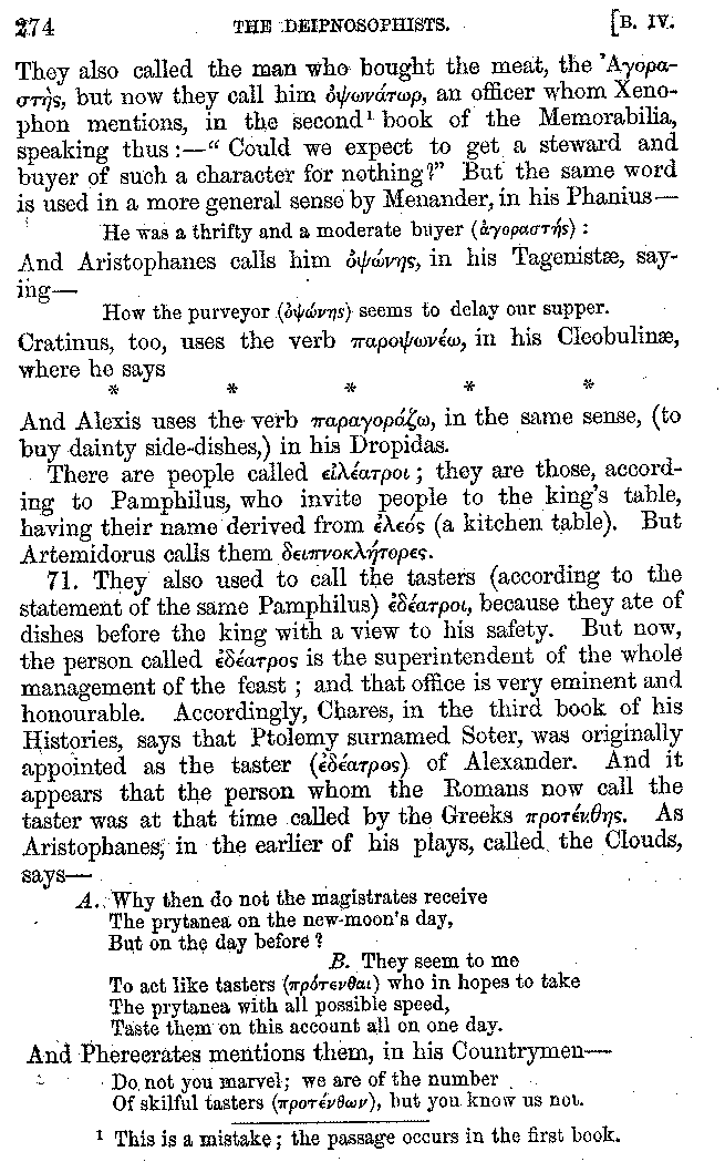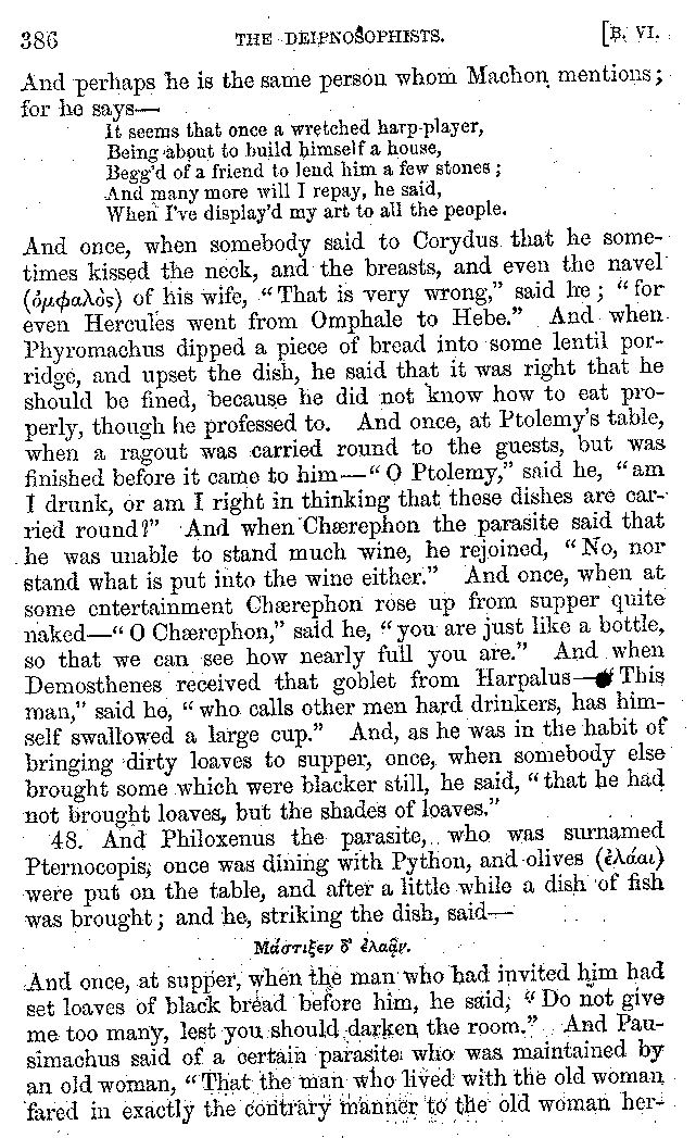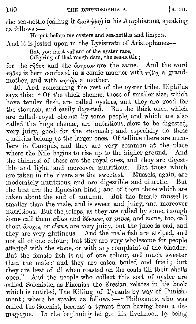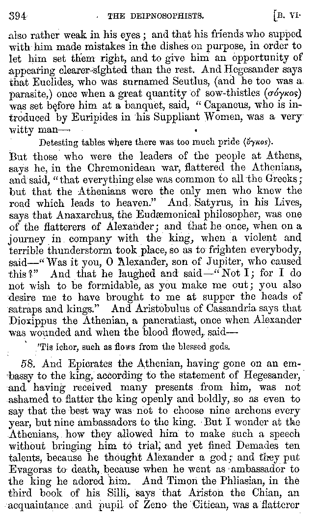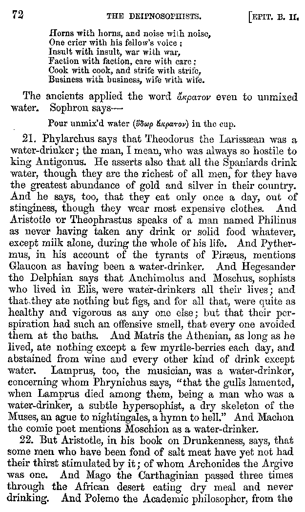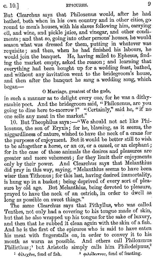 The same Clearchus says that Pithyllus, who was called Tenthes, not only had a covering to his tongue made of skin, but that he also wrapped up his tongue for the sake of luxury, and then that he rubbed it clean again with the skin of a fish. And he is the first of the epicures who is said to have eaten his meat with fingerstalls on, in order to convey it to his mouth as warm as possible. And others call Philoxenus Philicthus;[9:1] but Aristotle simply calls him Philodeipnus,[9:2] [10]writing in this way:—"Those who make harangues to the multitude, spend the whole day in looking at jugglers and mountebanks, and men who arrive from the Phasis or the Borysthenes; having never read a book in their lives except The Banquet of Philoxenus, and not all of that."