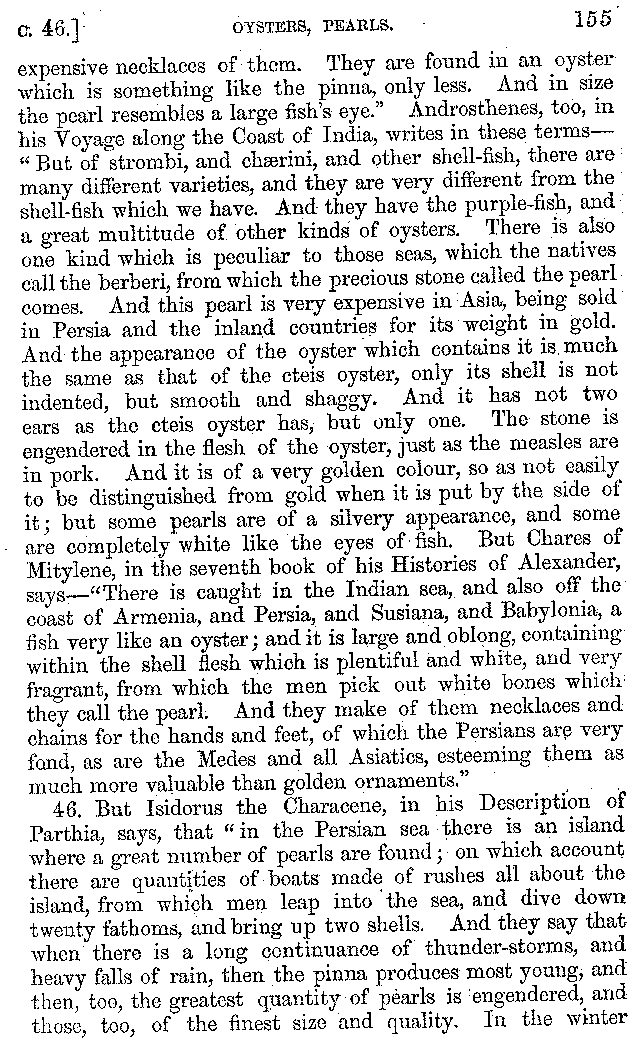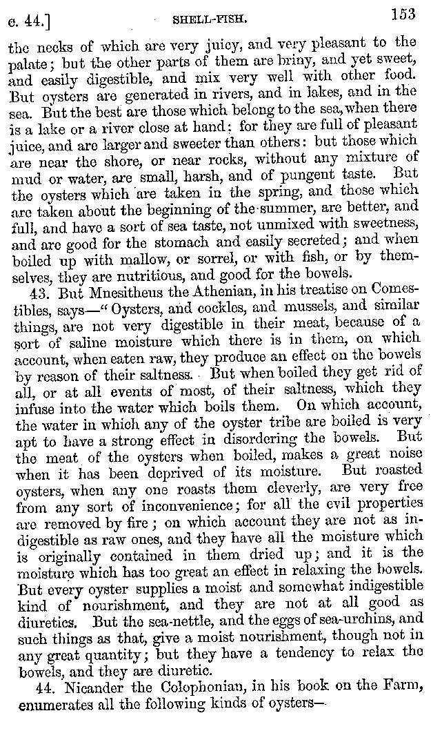 13. When the emperor Trajan was in Parthia, at a distance of many days' journey from the sea, Apicius sent him fresh oysters, which he had kept so by a clever contrivance of his own; real oysters, not like the sham anchovies which the cook of Nicomedes, king of the Bithynians, made in imitation of the real fish, and set before the king, when he expressed a wish for anchovies, (and he too at the time was a long way from the sea.) And in Euphron, the comic writer, a cook says:—