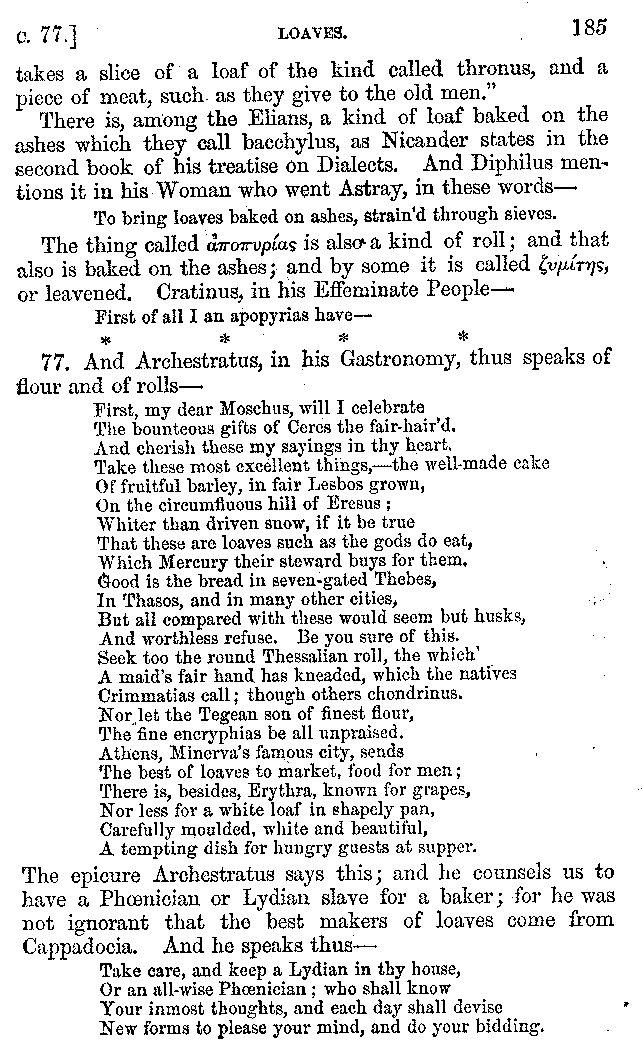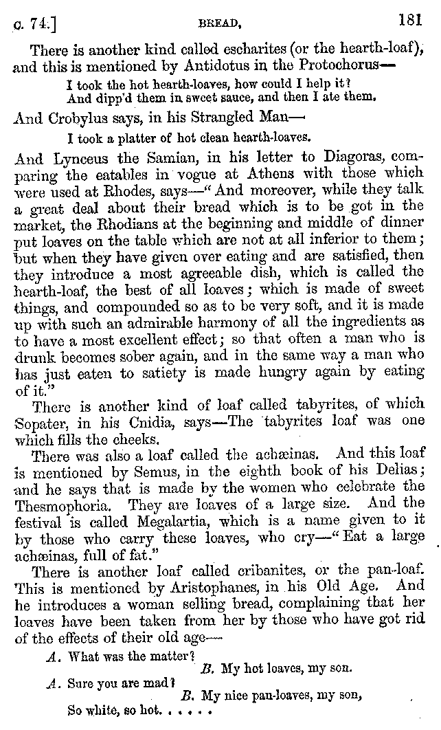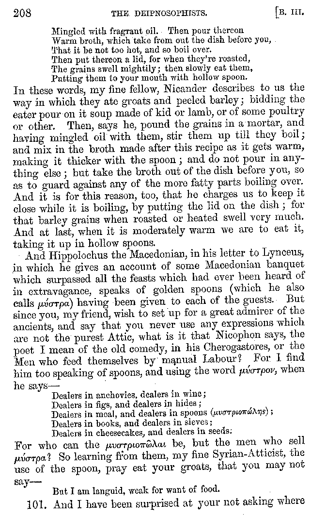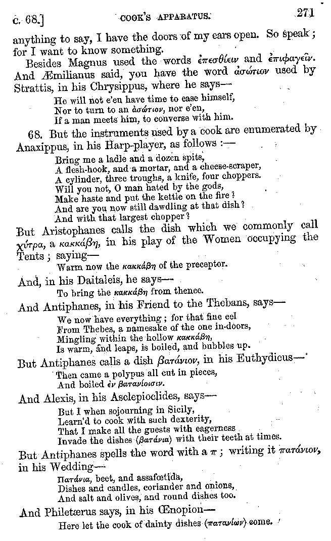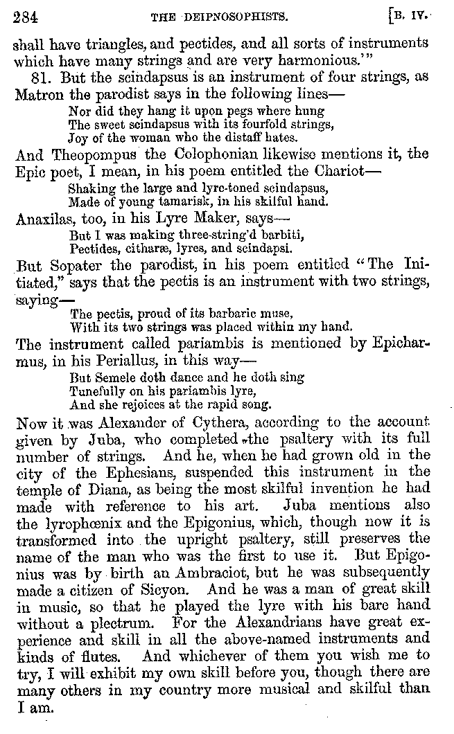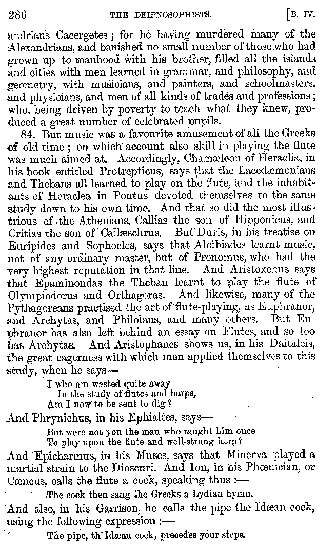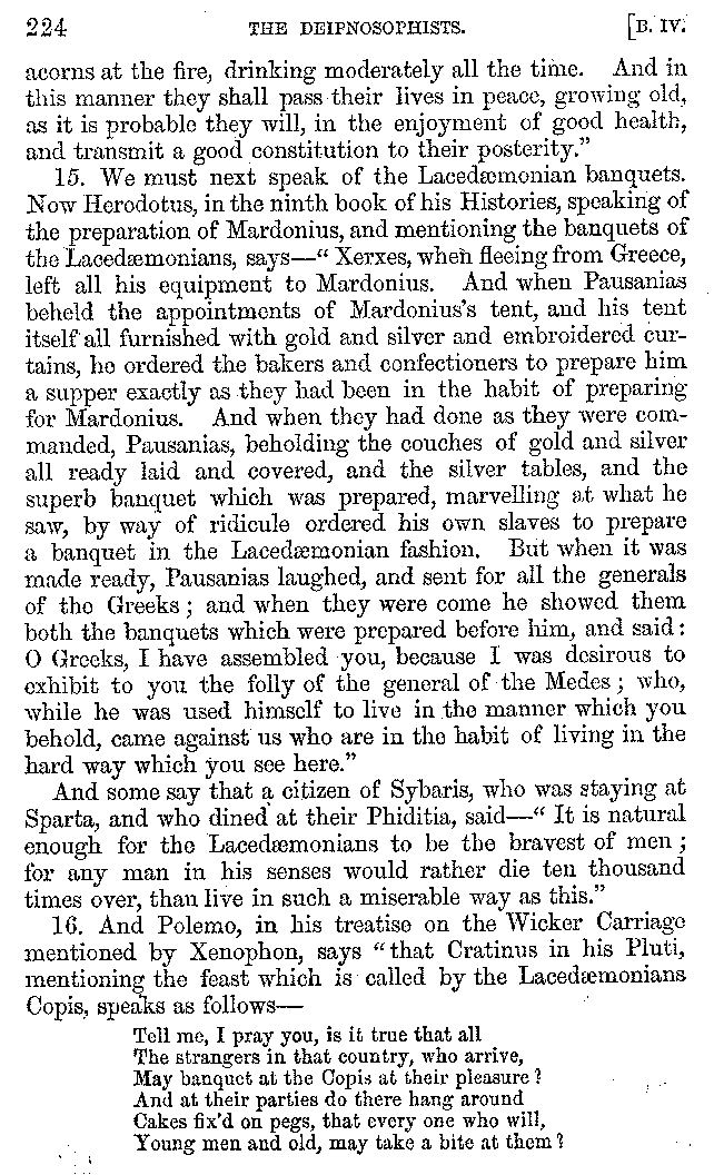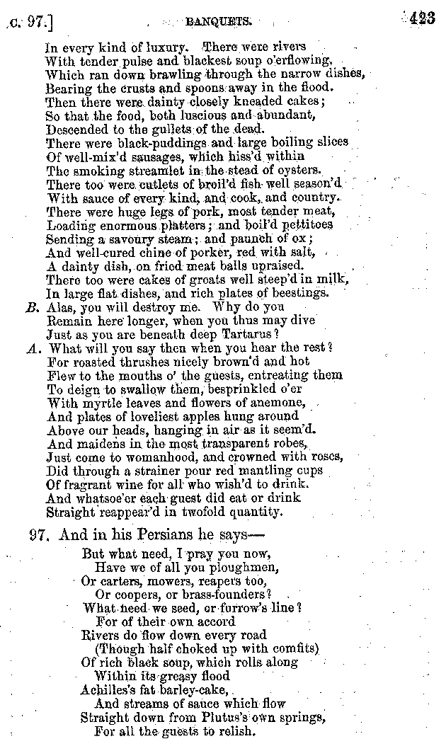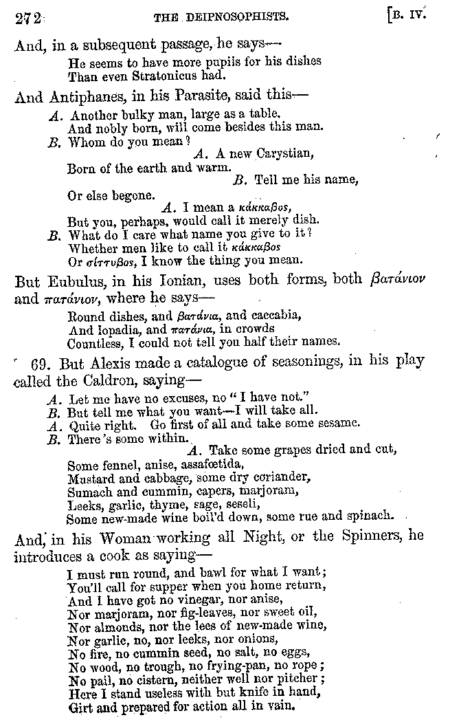 | Feast of Caranus—Supper of Iphicrates—Cooks—Dancing at Banquets—The Attic Banquet—Athenian Feasts—The Copis—The Phiditia—Cleomenes—Persian Banquets—Alexander the Great—Cleopatra—Banquets at Phigalea—Thracian Banquets—Celtic Banquets—Roman Banquets—Gladiatorial Combats—Temperance of the Lacedæmonians—The Theory of Euxitheus—Lentils—Spare Livers—Persæus—Diodorus—Extravagance—Luxury of the Tarentines—Extravagance of Individuals—Cooks' Apparatus—Use of Certain Words—Tasters—The Delphians—Musical Instruments—Kinds of Flutes—Wind Instruments | 210-287 |