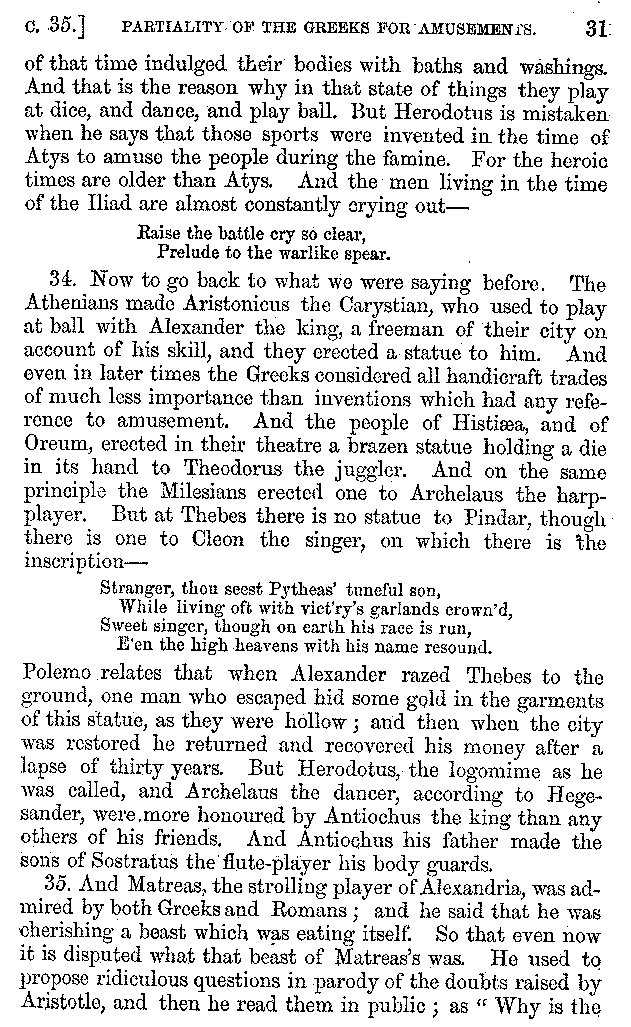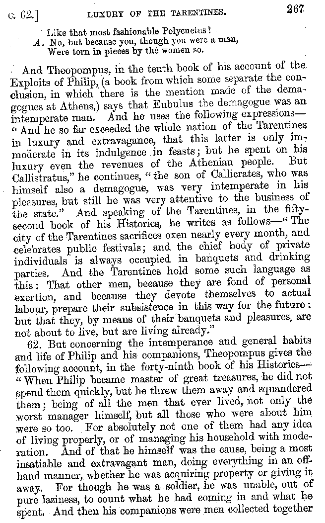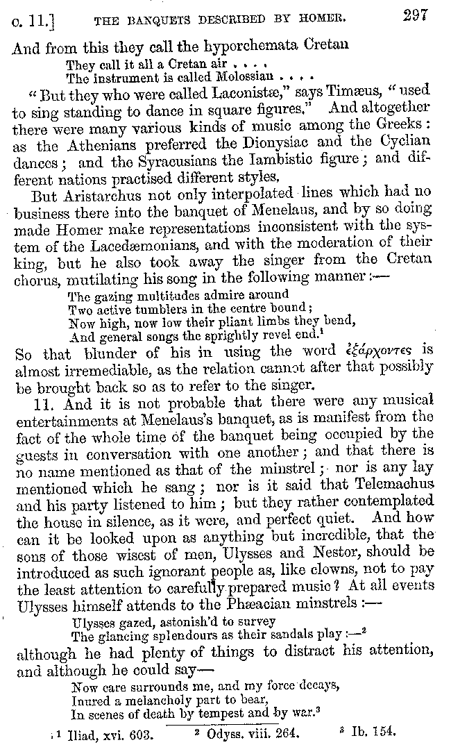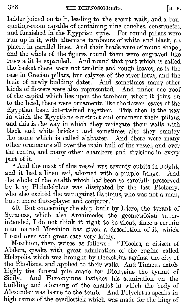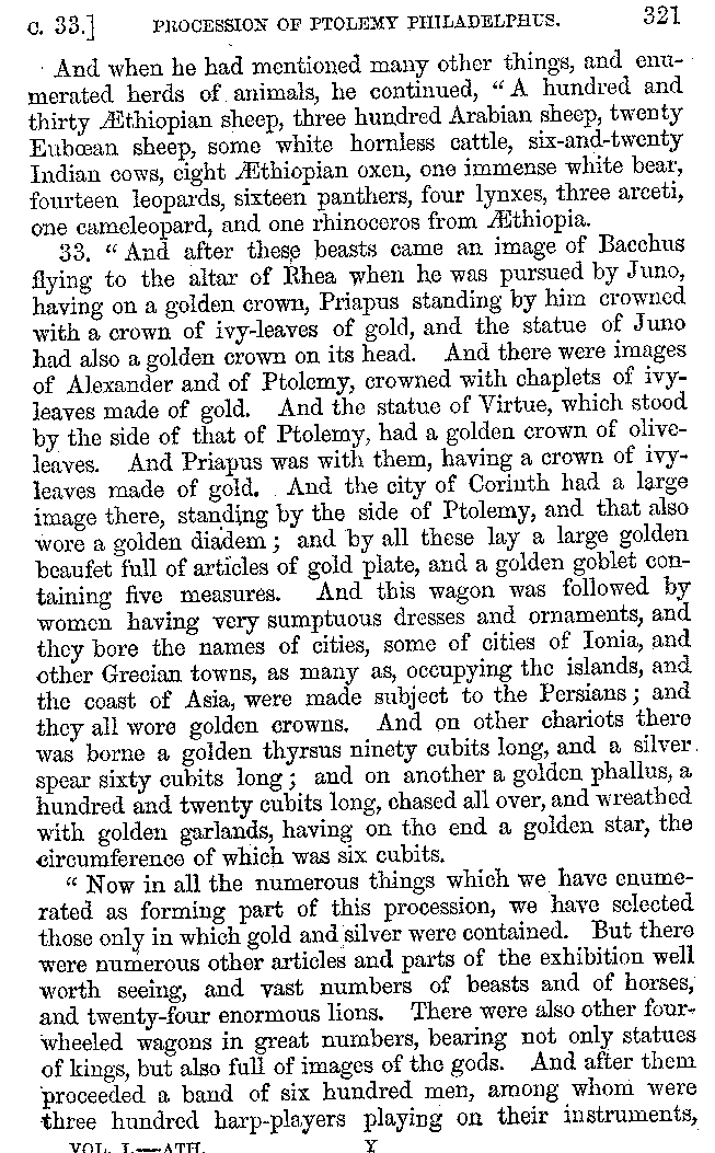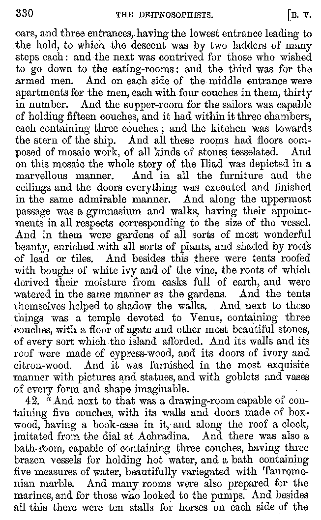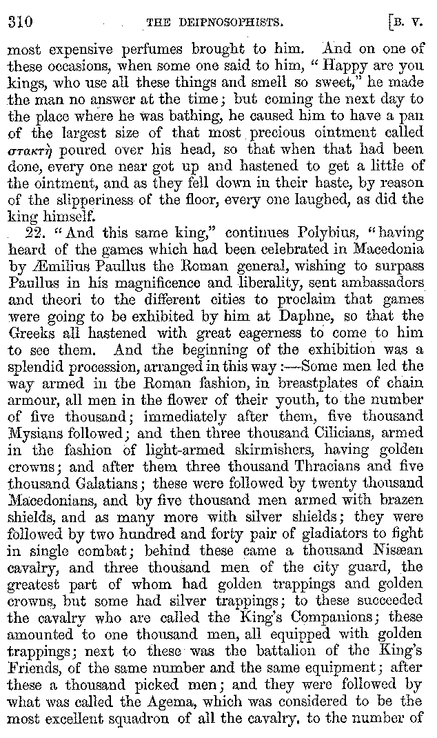 | Banquets—Baths—Banquets—The Banquets described by Homer—Banquets—The Palaces of Homer's Kings—Conversation at Banquets—Customs in Homer's Time—Attitudes of Guests—Feast given by Antiochus—Extravagance of Antiochus—Ptolemy Philadelphus—Procession of Ptolemy Philadelphus—A large Ship built by Ptolemy—The Ship of Ptolemy Philopator—Hiero's Ship—Banquet given by Alexander—Athenio—The Valour of Socrates—Plato's account of Socrates—Socrates—The Gorgons | 287-352 |
