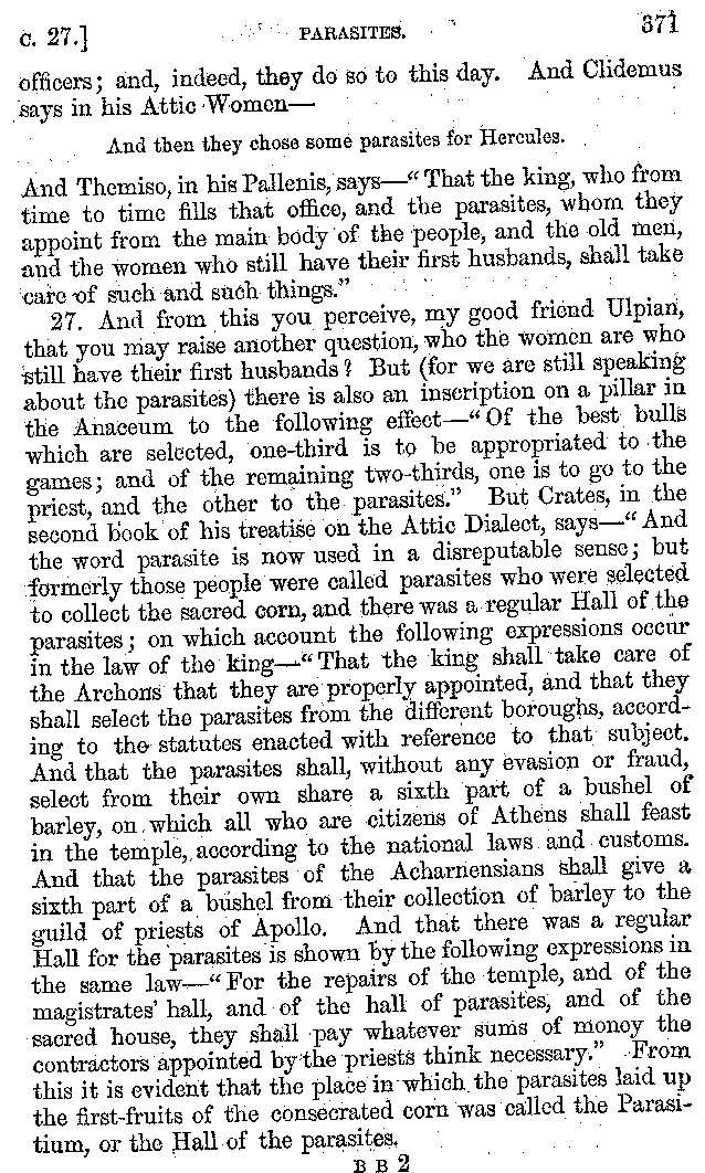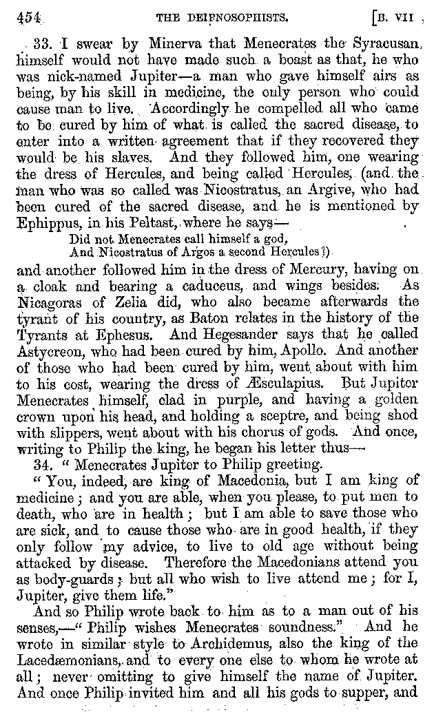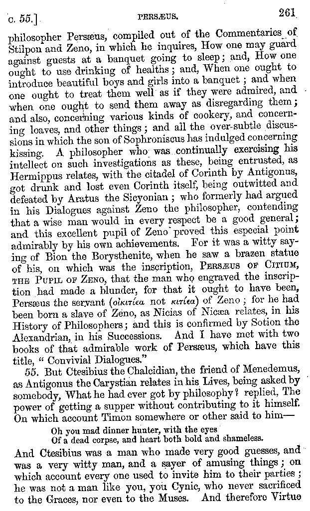 And of philosophers there were present Pontianus and Democritus, both of Nicomedia; men superior to all their contemporaries in the extent and variety of their learning; and Philadelphus of Ptolemais, a man who had not only been bred up from his infancy in philosophical speculation, but who was also a man of the highest reputation in every part of his life. Of the Cynics, there was one whom he calls Cynulcus, who had not only two white dogs following him, as they did Telemachus when he went to the assembly, but a more numerous pack than even Actæon had. And of rhetoricians there was a whole troop, in no respect inferior to the Cynics. And these last, as well, indeed, as every one else who ever opened his mouth, were run down by Uppianus the Tyrian, who, on account of the everlasting questions which he keeps putting every hour in the streets, and walks, and booksellers' shops, and baths, has got a name by which he is better known than by his real one, Ceitouceitus. This man had a rule of his own, to eat nothing without saying κεῖται; ἢ οὐ κεῖται; In this way, "Can we say of the word ὥρα, that it κεῖται, or is applicable to any part of the day? And is the word μέθυσος, or drunk, applicable to a man? Can the word μήτρα, or paunch, be applied to any eatable food? Is the name σύαγρος a compound word applicable to a boar?"—And of physicians there were present Daphnus [3]the Ephesian, a man holy both in his art and by his manners, a man of no slight insight into the principles of the Academic school; and Galenus of Pergamos, who has published such numbers of philosophical and medical works as to surpass all those who preceded him, and who is inferior to none of the guests in the eloquence of his descriptions. And Rufinus of Mylæa.—And of musicians, Alcides of Alexandria, was present. So that the whole party was so numerous that the catalogue looks rather like a muster-roll of soldiers, than the list of a dinner party.