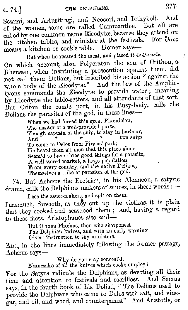 says the bard of Syracuse.[7:1] So that it is not easy to put all sorts of things on the table at one time; but it is easy to talk of all kinds of subjects at any time. Other men have written descriptions of feasts; and Tinachidas of Rhodes has done so in an epic poem of eleven books or more; and Numenius the Heraclean, the pupil of Dieuchas the physician; and Metreas of Pitane, the man who wrote parodies; and Hegemon of Thasos, surnamed Phacè, whom some men reckon among the writers of the Old Comedy. And Artemidorus, the false Aristophanes, collected a number of sayings relating to cookery. And Plato, the comic writer, mentions in his Phaon the banquet of Philoxenus the Leucadian.
