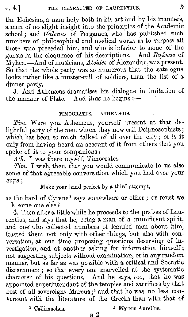 3. And Athenæus dramatises his dialogue in imitation of the manner of Plato. And thus he begins:—