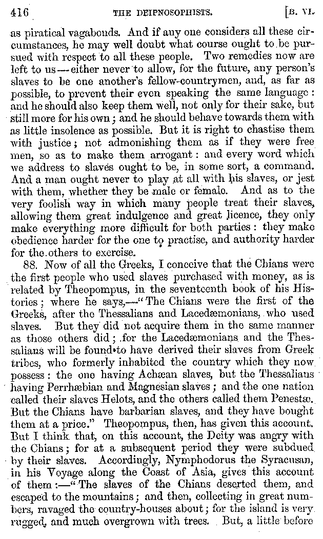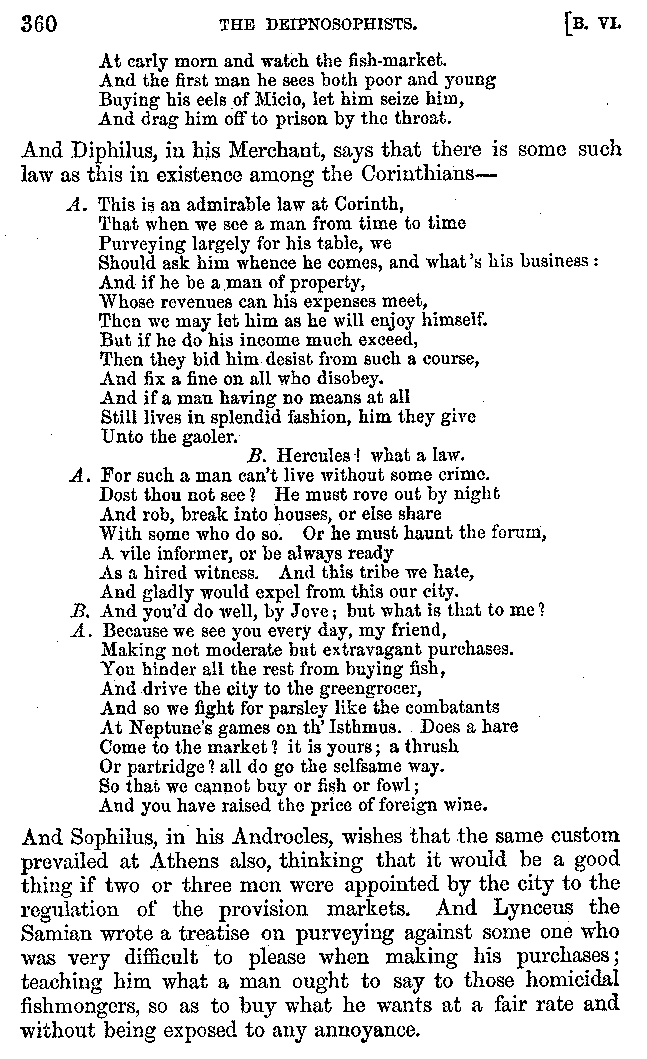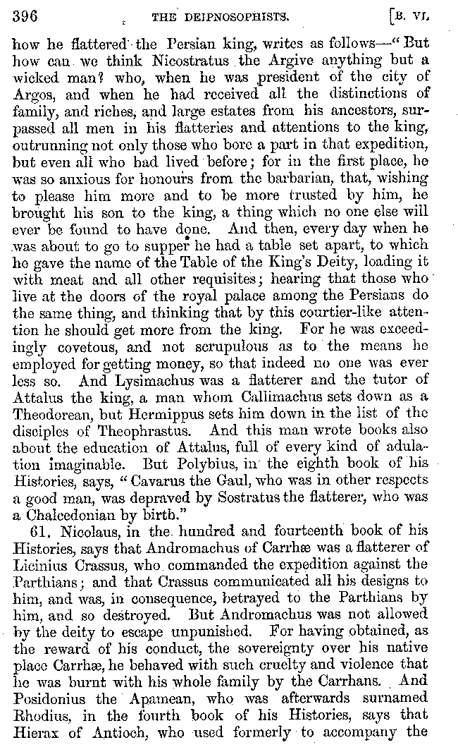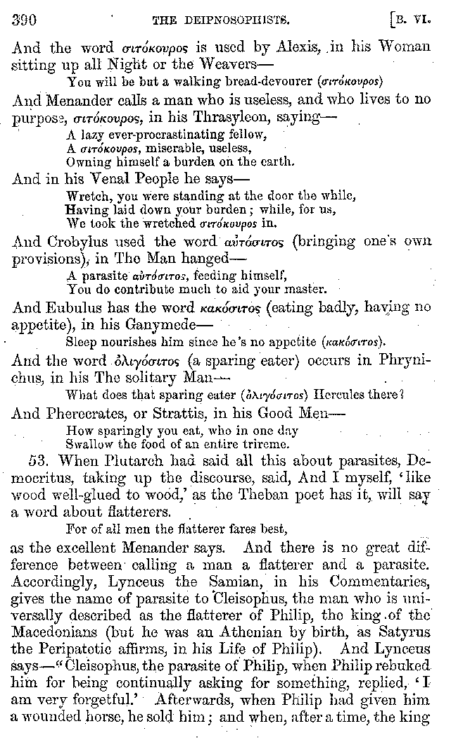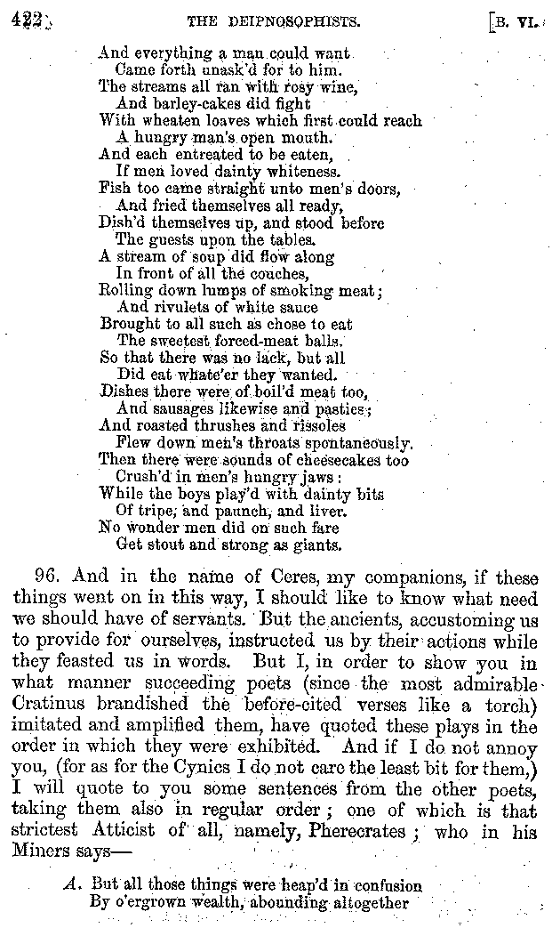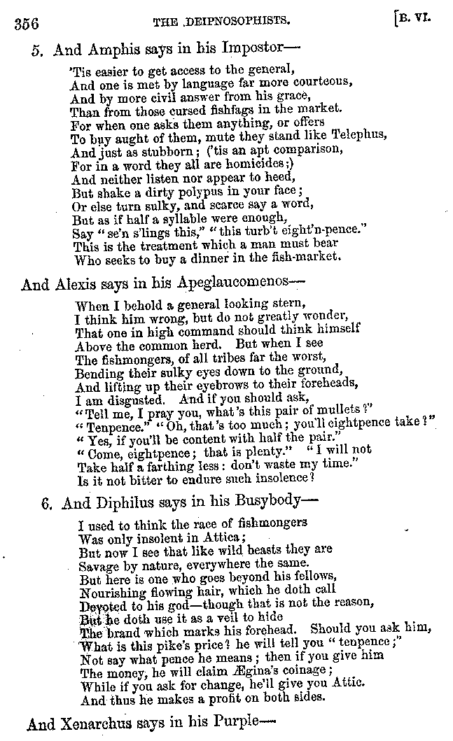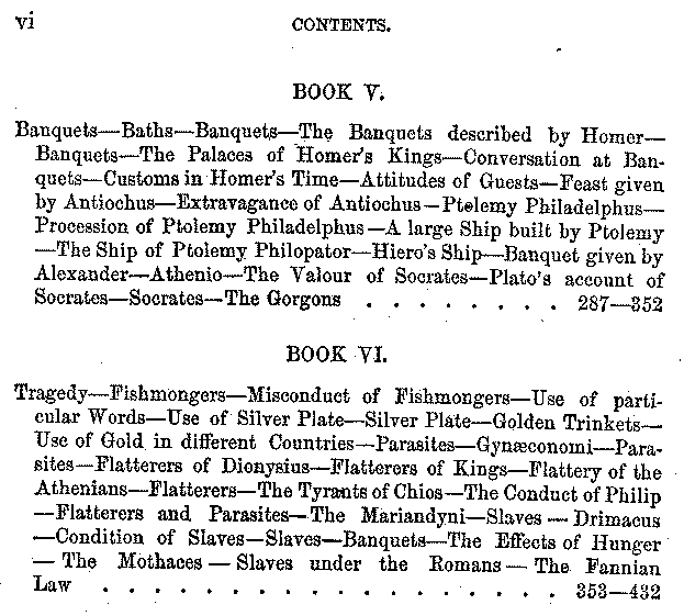 | Tragedy—Fishmongers—Misconduct of Fishmongers—Use of particular Words—Use of Silver Plate—Silver Plate—Golden Trinkets—Use of Gold in different Countries—Parasites—Gynæconomi—Parasites—Flatterers of Dionysius—Flatterers of Kings—Flattery of the Athenians—Flatterers—The Tyrants of Chios—The Conduct of Philip—Flatterers and Parasites—The Mariandyni—Slaves—Drimacus—Condition of Slaves—Slaves—Banquets—The Effects of Hunger—The Mothaces—Slaves under the Romans—The Fannian Law | 353-432 |