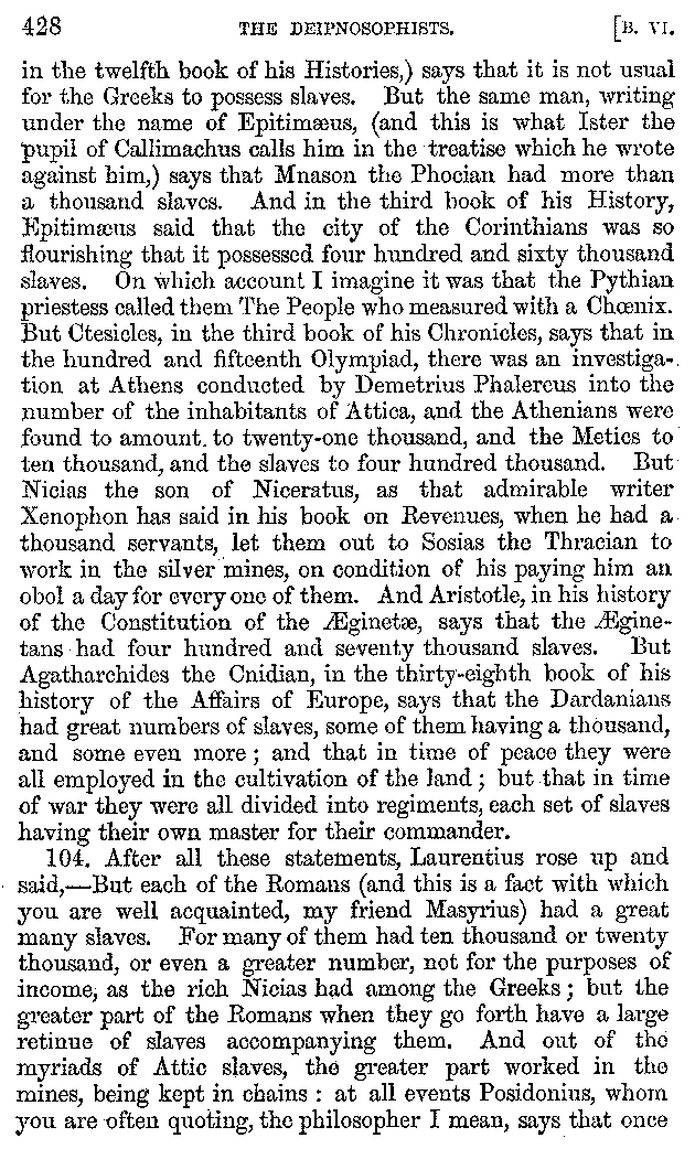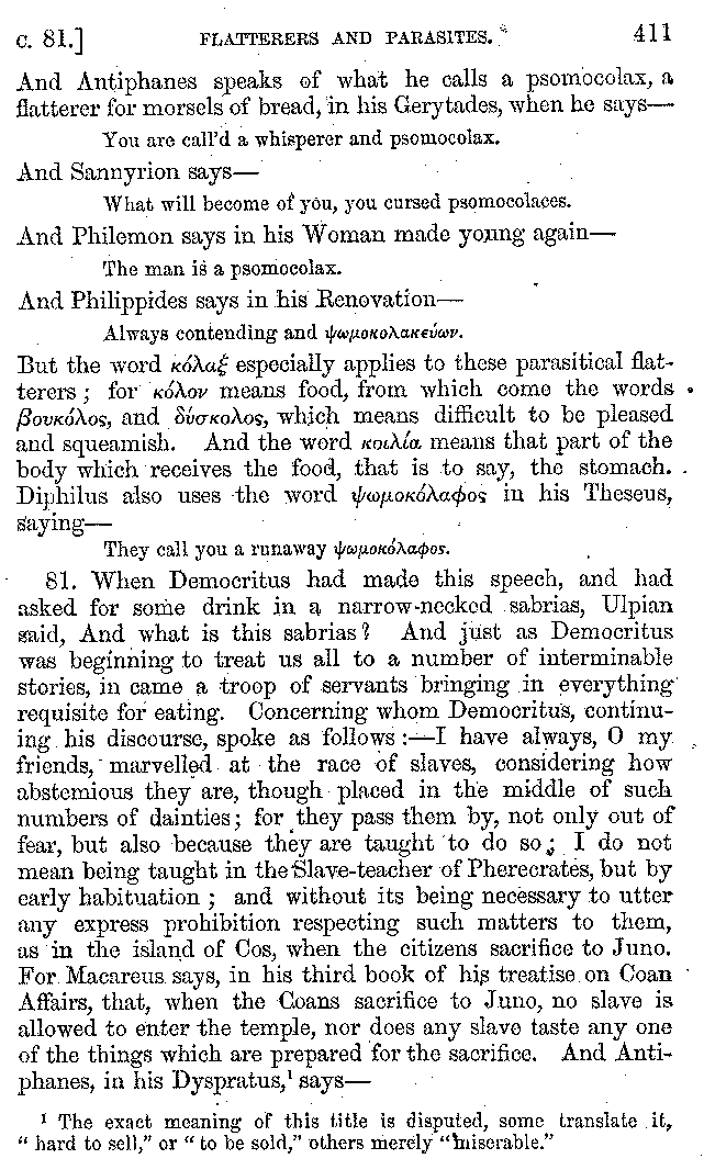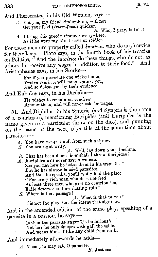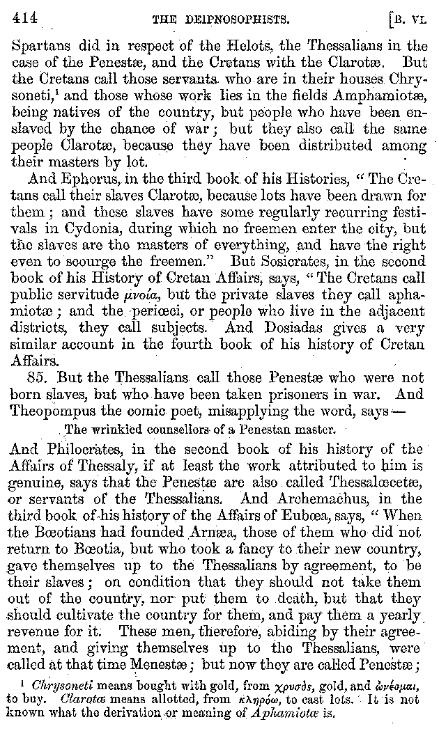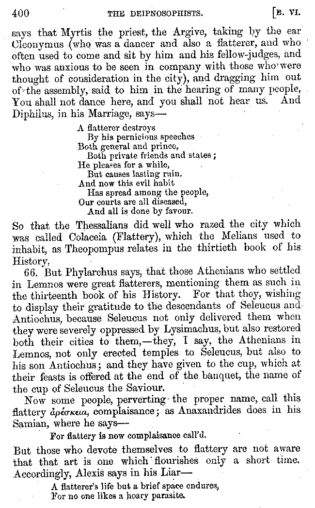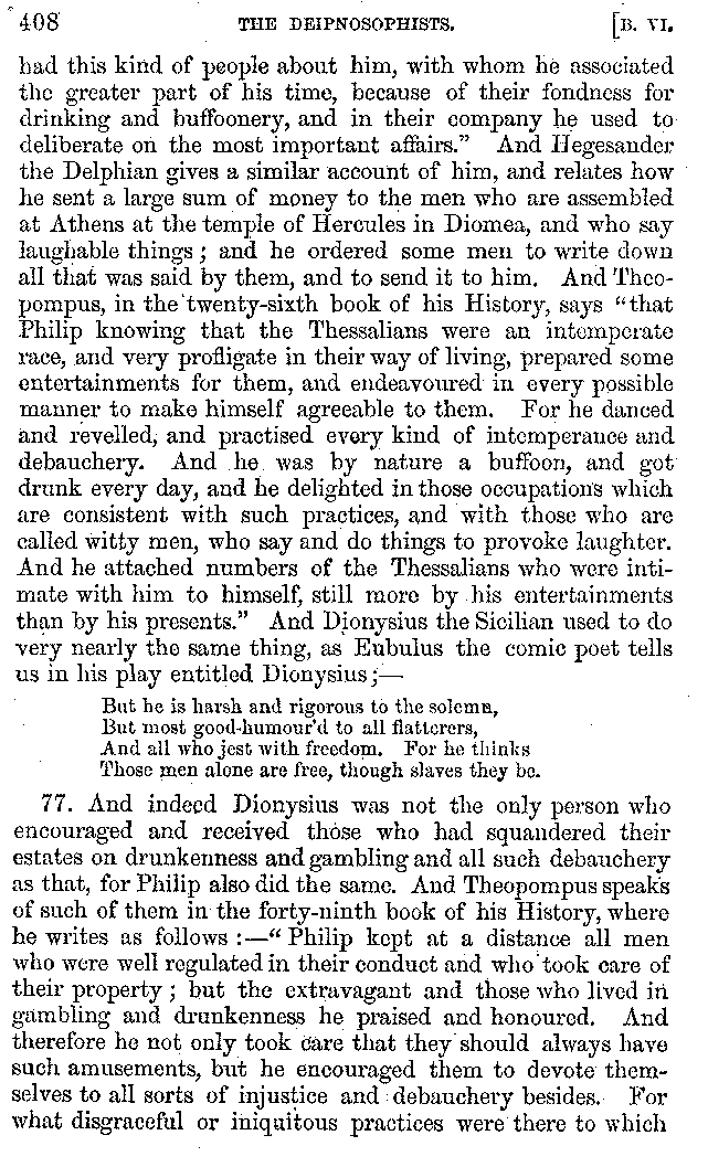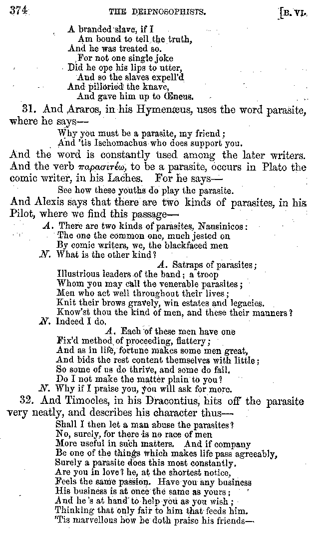 | Tragedy—Fishmongers—Misconduct of Fishmongers—Use of particular Words—Use of Silver Plate—Silver Plate—Golden Trinkets—Use of Gold in different Countries—Parasites—Gynæconomi—Parasites—Flatterers of Dionysius—Flatterers of Kings—Flattery of the Athenians—Flatterers—The Tyrants of Chios—The Conduct of Philip—Flatterers and Parasites—The Mariandyni—Slaves—Drimacus—Condition of Slaves—Slaves—Banquets—The Effects of Hunger—The Mothaces—Slaves under the Romans—The Fannian Law | 353-432 |
