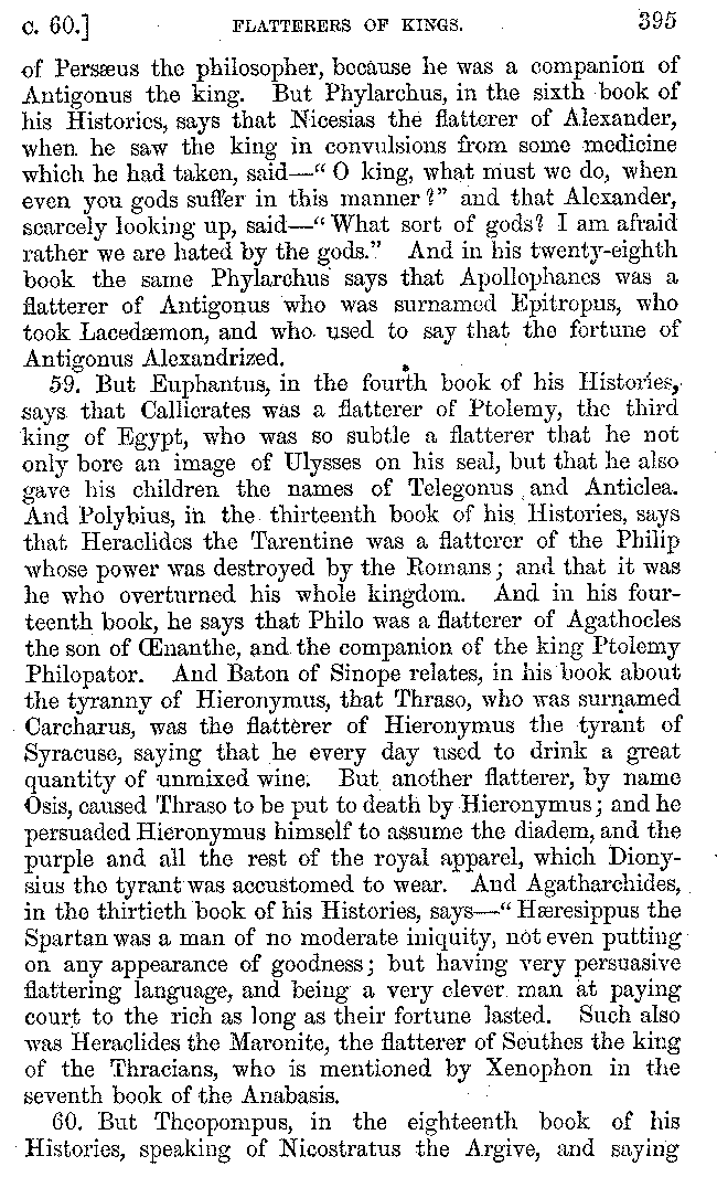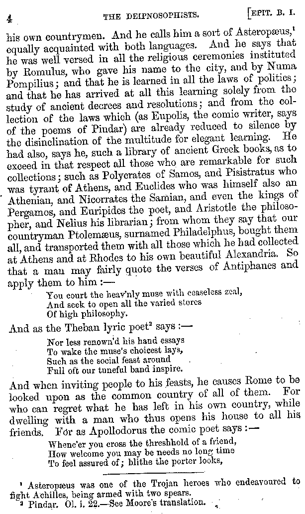 4. Then after a little while he proceeds to the praises of Laurentius, and says that he, being a man of a munificent spirit, and one who collected numbers of learned men about him, feasted them not only with other things, but also with conversation, at one time proposing questions deserving of investigation, and at another asking for information himself; not suggesting subjects without examination, or in any random manner, but as far as was possible with a critical and Socratic discernment; so that every one marvelled at the systematic character of his questions. And he says, too, that he was appointed superintendant of the temples and sacrifices by that best of all sovereigns Marcus;[3:2] and that he was no less conversant with the literature of the Greeks than with that of [4]his own countrymen. And he calls him a sort of Asteropæus,[4:1] equally acquainted with both languages. And he says that he was well versed in all the religious ceremonies instituted by Romulus, who gave his name to the city, and by Numa Pompilius; and that he is learned in all the laws of politics; and that he has arrived at all this learning solely from the study of ancient decrees and resolutions; and from the collection of the laws which (as Eupolis, the comic writer, says of the poems of Pindar) are already reduced to silence by the disinclination of the multitude for elegant learning. He had also, says he, such a library of ancient Greek books, as to exceed in that respect all those who are remarkable for such collections; such as Polycrates of Samos, and Pisistratus who was tyrant of Athens, and Euclides who was himself also an Athenian, and Nicorrates the Samian, and even the kings of Pergamos, and Euripides the poet, and Aristotle the philosopher, and Nelius his librarian; from whom they say that our countryman Ptolemæus, surnamed Philadelphus, bought them all, and transported them with all those which he had collected at Athens and at Rhodes to his own beautiful Alexandria. So that a man may fairly quote the verses of Antiphanes and apply them to him:—