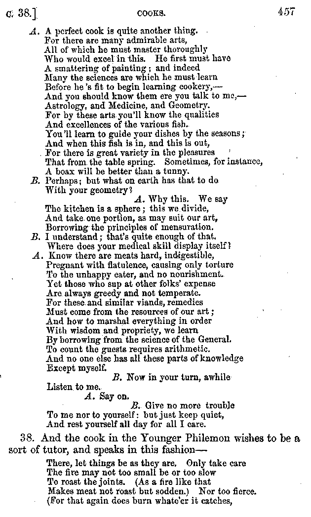 | A. | He took a female turnip, shred it fine Into the figure of the delicate fish; Then did he pour on oil and savoury salt With careful hand in due proportion. On that he strew'd twelve grains of poppy seed, Food which the Scythians love; then boil'd it all. And when the turnip touch'd the royal lips, Thus spake the king to the admiring guests: "A cook is quite as useful as a poet, And quite as wise, and these anchovies show it." |