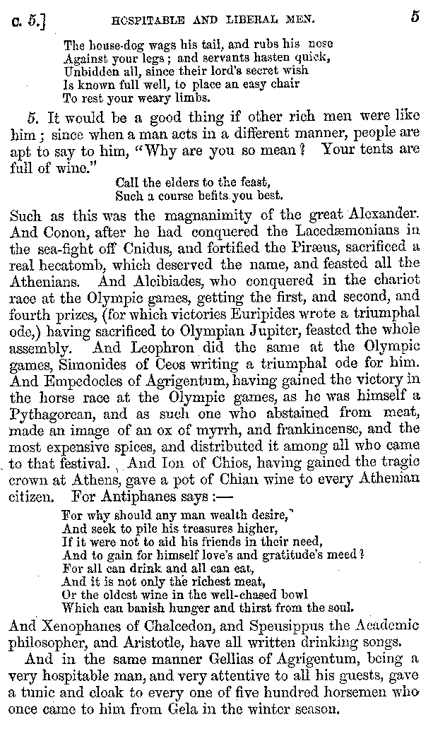 Such as this was the magnanimity of the great Alexander. And Conon, after he had conquered the Lacedæmonians in the sea-fight off Cnidus, and fortified the Piræus, sacrificed a real hecatomb, which deserved the name, and feasted all the Athenians. And Alcibiades, who conquered in the chariot race at the Olympic games, getting the first, and second, and fourth prizes, (for which victories Euripides wrote a triumphal ode,) having sacrificed to Olympian Jupiter, feasted the whole assembly. And Leophron did the same at the Olympic games, Simonides of Ceos writing a triumphal ode for him. And Empedocles of Agrigentum, having gained the victory in the horse race at the Olympic games, as he was himself a Pythagorean, and as such one who abstained from meat, made an image of an ox of myrrh, and frankincense, and the most expensive spices, and distributed it among all who came to that festival. And Ion of Chios, having gained the tragic crown at Athens, gave a pot of Chian wine to every Athenian citizen. For Antiphanes says:—