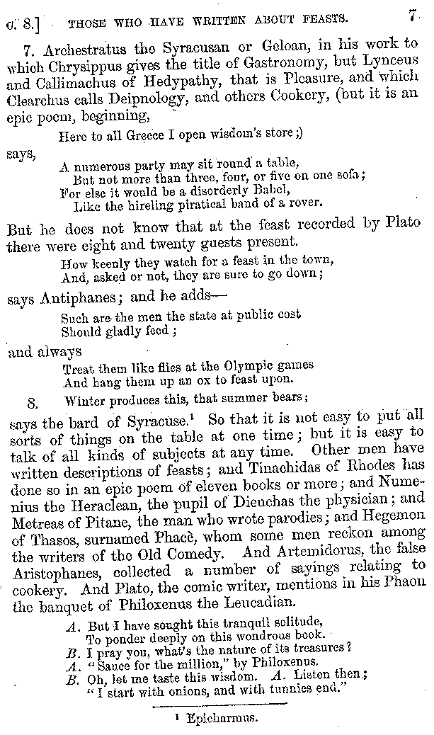 [7] 7. Archestratus the Syracusan or Geloan, in his work to which Chrysippus gives the title of Gastronomy, but Lynceus and Callimachus of Hedypathy, that is Pleasure, and which Clearchus calls Deipnology, and others Cookery, (but it is an epic poem, beginning,