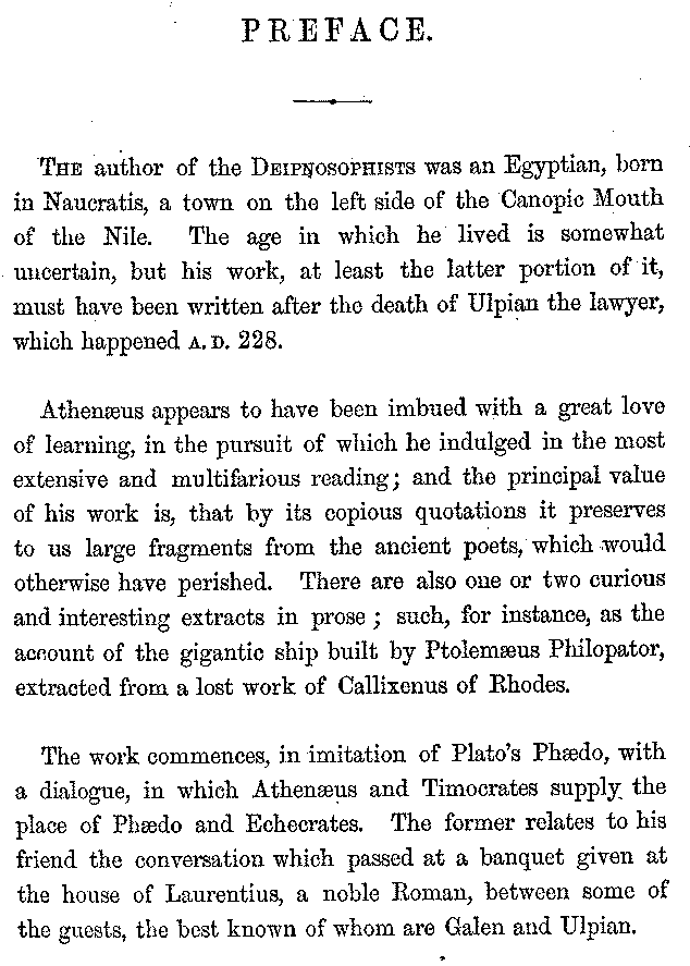 The author of the Deipnosophists was an Egyptian, born in Naucratis, a town on the left side of the Canopic Mouth of the Nile. The age in which he lived is somewhat uncertain, but his work, at least the latter portion of it, must have been written after the death of Ulpian the lawyer, which happened A. D. 228.