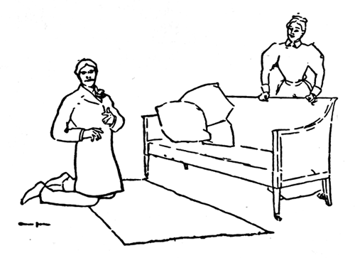 Yardsley. Ah! So far so good; but I wish it were over. I've had the nerve to get as far as the house and into it, but how much further my courage will carry me I can't say. Confound it! Why is it, I wonder, that men get so rattled when they're head over heels in love, and want to ask the fair object of their affections[4] to wed? I can't see. Now I'm brave enough among men. I'm not afraid of anything that walks, except Dorothy Andrews, and generally I'm not afraid of her. Stopping runaway teams and talking back to impudent policemen have been my delight. I've even been courageous enough to submit a poem in person to the editor of a comic weekly, and yet here this afternoon I'm all of a tremble. And for what reason? Just because I've co-come to ask Dorothy Andrews to change her name to Mrs. Bob Yardsley; as if that were such an unlikely thing for her to do. Gad! I'm almost inclined to despise myself. (Surveys himself in the mirror at one end of the room. Then walking up to it and peering intently at his reflection, he continues.) Bah! you coward! Afraid of a woman—a sweet little woman like[5] Dorothy. You ought to be ashamed of yourself, Bob Yardsley. She won't hurt you. Brace up and propose like a man—like a real lover who'd go through fire for her sake, and all that. Ha! That's easy enough to talk about, but how shall I put it? That's the question. Let me see. How do men do it? I ought to buy a few good novels and select the sort of proposal I like; but not having a novel at hand, I must invent my own. How will it be? Something like this, I fancy. (The portières are parted, and Jennie, the maid, enters. Yardsley does not observe her entrance.) I'll get down on my knees. A man on his knees is a pitiable object, and pity, they say, is akin to love. Maybe she'll pity me, and after that—well, perhaps pity's cousin will arrive. (The maid advances, but Yardsley is so intent upon[6] his proposal that he still fails to observe her. She stands back of the sofa, while he, gazing downward, kneels before it.) I'll say: "Divine creature! At last we are alone, and I—ah—I can speak freely the words that have been in my heart to say to you for so long—oh, so long a time." (Jennie appears surprised.)[7] "I have never even hinted at how I feel towards you. I have concealed my love, fearing lest by too sudden a betrayal of my feelings I should lose all." (Aside.) Now for a little allusion to the poets. Poetry, they say, is a great thing for proposals. "You know, dearest, you must know, how the poet has phrased it—'Fain would I fall but that I fear to climb.' But now—now I must speak. An opportunity like this may not occur again. Will you—will you be my wife?"