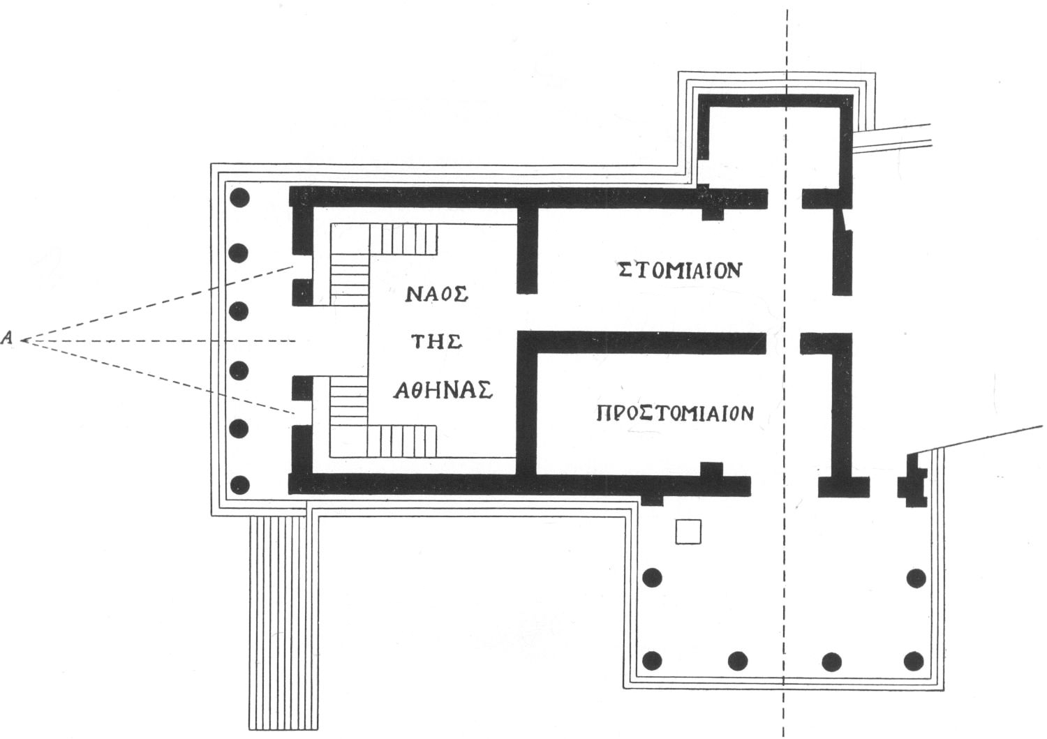 Plan of Erechtheum showing new interior arrangement. Dotted lines from A