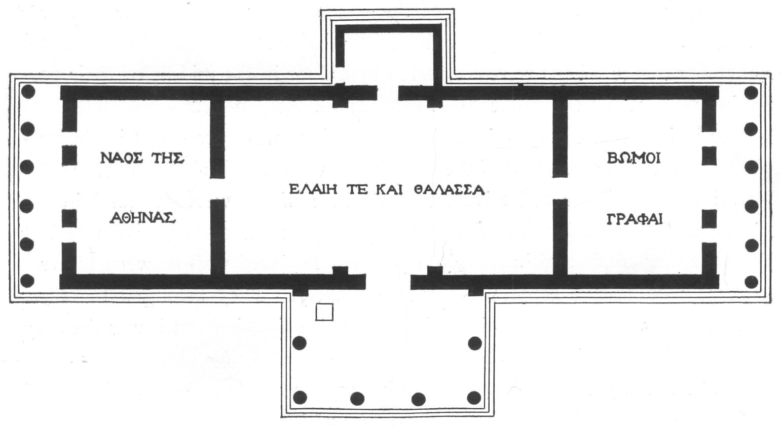 In the first room (ἐσελθοῦσι) Pausanias found the altars of Hephaestus, Poseidon-Erechtheus and Butes, and the paintings of the Butadae. The wall space lighted directly from the west windows was finely adapted for the paintings. There were only two doors and those at the west ends of the long walls. There could have been an uninterrupted series of paintings, whereas the προστομιαῖον of the other plan had five doors, and therefore offered less desirable space. With the words διπλοῦν γάρ ἐστιν τὸ οἴκημα, Pausanias passes to the next room (ἔνδον) where he found the well of sea-water. Now the name with which Pausanias introduces his description is significant: ἔστι δὲ καὶ οἴκημα Ἐρέχθειον καλούμενον. He named the temple from the part which he entered first and then he says a moment later that this οἴκημα is double, i.e. the part which he has just entered. Up to this point there is no suggestion of Athena. The διπλοῦν οἴκημα of Erechtheus consisted of two chambers one behind the other with reference to the porch.
