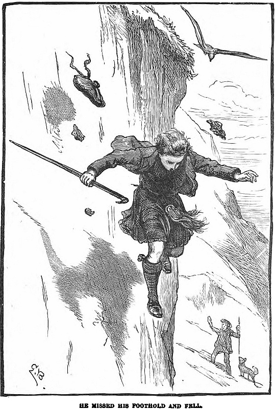 In a wild country like that in which our young hero dwelt and wandered, there are many dangers to life and limb, and Claude did not always escape quite scot-free. But when, on rushing down a lofty hillside once, he missed his foothold and fell over a crag full fifty feet high, he did not lose his presence of mind, but simply jumped up from the soft turf on which he had alighted, as if on a feather bed, and looked around for his bonnet, which he never saw again. The old shepherd who witnessed the involuntary exploit, told of it all over the parish, and the wise women alleged it was the bird that had saved him. When Claude’s gun burst in his hand and he escaped without a scratch, that too was in some way owing to the bird’s protecting care. When a branch on which he was leaning snapped beneath his weight and precipitated Claude into the roaring, foaming torrent beneath, where any one save a Webb would have been drowned, and when bleeding and cut he safely scrambled out, who but the bird, averred the wise old women, helped him out?