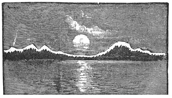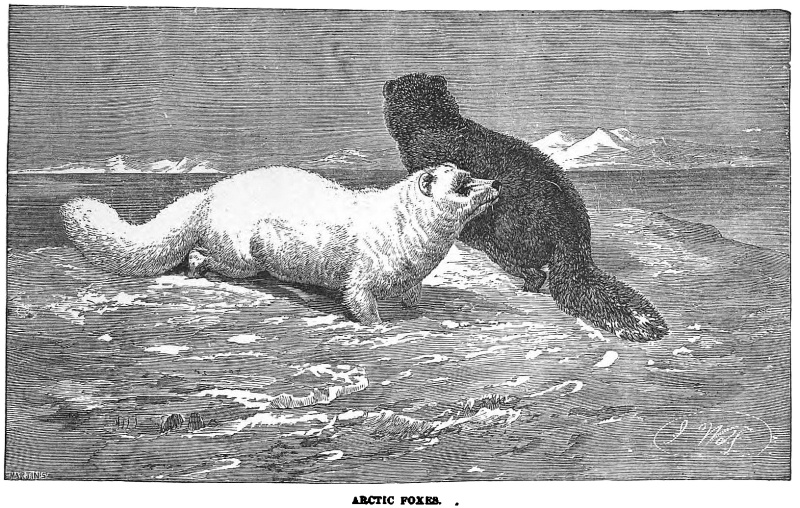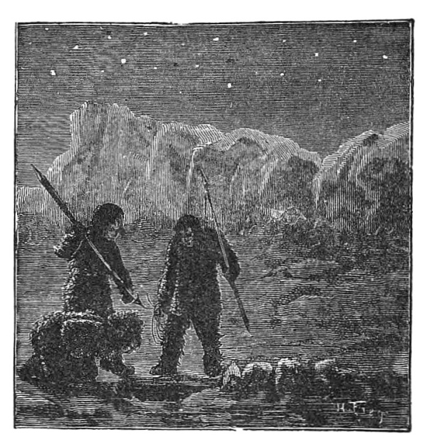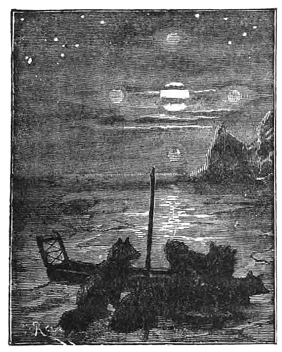 “Here it is again, mother, a vast and lonely trackless waste of snow; great glaciers, against whose sides mountain waves for ever dash and foam; icebergs whose pinnacled heads taper upwards into a sky of cloudless blue. Fields of ice on which white bears roam; dark, inky seas where the walrus plays and tumbles, and through which the solitude-loving narwhal pursues his finny prey; and crystalline caves where sea-bears roar. But the scene is changed: it is night—the long, long, Polar night. Oh, how bright and beautiful the Aurora, with its ever-changing tints of crimson, green, and blue; and the stars, how near they seem; and the silence, how deep, how awful! But see, a storm is coming across the pack, and clouds are banking up and hiding the glorious Aurora; now it is on us, and higher than the stars rise the clouds of whirling, drifting snow. Hark! how the wind howls! There is danger on its wings; there is—”