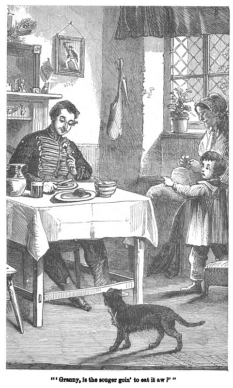 “Better ’list and be a soldier,” said he. “I don’t mind if I do,” said I. On arriving at the rendezvous he took me up a narrow staircase, on the landing of which was a standard, fixed to indicate the height of intending recruits. I was one inch below the standard height of the regiment, he said, but being young and evidently growing fast, that was immaterial. We descended to a sort of tap-room, where a huge fire was burning, and several soldiers with dirty-looking female companions were seated around, smoking and drinking. The men rose, and proposed my health. At a sign, however, from the sergeant they were seated, and were comparatively silent. The sergeant, assuming a pompous air, then put the following questions to me:—