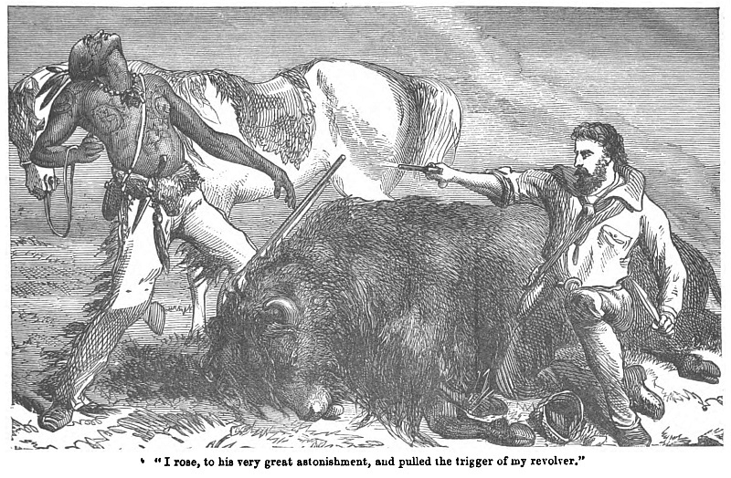 The bedsteads were of iron, and the beds stuffed with straw. To one of these I was shown as belonging to one of the men on guard and therefore vacant. There was an air of snug comfort in the room that contrasted favourably with the cold blustering wind outside. A good fire was burning in a large grate, the white belts, black sabretaches, and burnished scabbards hung around the room and glittered in the fire light. The carbines were neatly arranged in the “rack” with a bone “snapper” in each hammer—placed there in lieu of the flint—for the new percussion-caps were not in use at that period. The uniforms—scarlet coats with swallow-tails, and brass shoulder-scales—were neatly wrapped up and piled with the kit and spare clothing upon a shelf over each man’s bed. The men were apparently as happy as a family—some were smoking and chatting, one was reading a newspaper, another writing a letter, and one, a “mounted orderly” just come in from a long ride, was busy cooking two herrings for his supper.