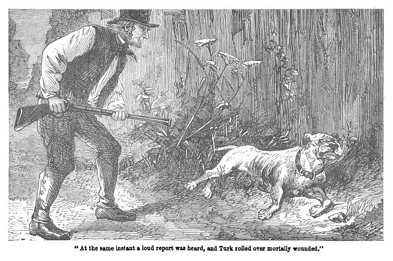 Seeing the apparition on the church at such a time, Durden took to his heels; his donkey, profiting by the absence of the carrier’s cudgel, stood still, pricked up his ears, and returned the salute after his own familiar fashion. The villagers again crowded to the spot; all was discovered; daylight revealed the rope that connected the yew-tree with the bell-pull. The “ghost” had got his other ear at liberty, and his tail was wriggling, two hundred movements to the minute, with evident pleasure at beholding one of his race in the roadway below. With considerable labour he was lowered from his elevated position.