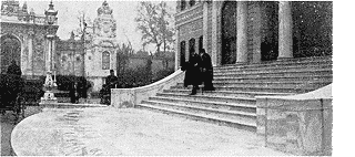 Nous revenons à 2 heures. Même silence aux abords du palais. Les seuls curieux sont toujours quelques journalistes français, Paul Erio, du Journal, Cuinet, du Matin, Mothu, de l'Havas, Genève, du Stamboul, et des journalistes locaux. Cette fois on nous laisse, sur notre demande, pénétrer dans les jardins, puis, dans le grand salon du rez-de-chaussée qui précède l'escalier d'honneur, lequel donne accès au salon des ambassadeurs, ainsi nommé parce que le sultan Aziz y accordait ses audiences aux ambassadeurs étrangers, et dans lequel se tient aujourd'hui le «Grand Divan».
