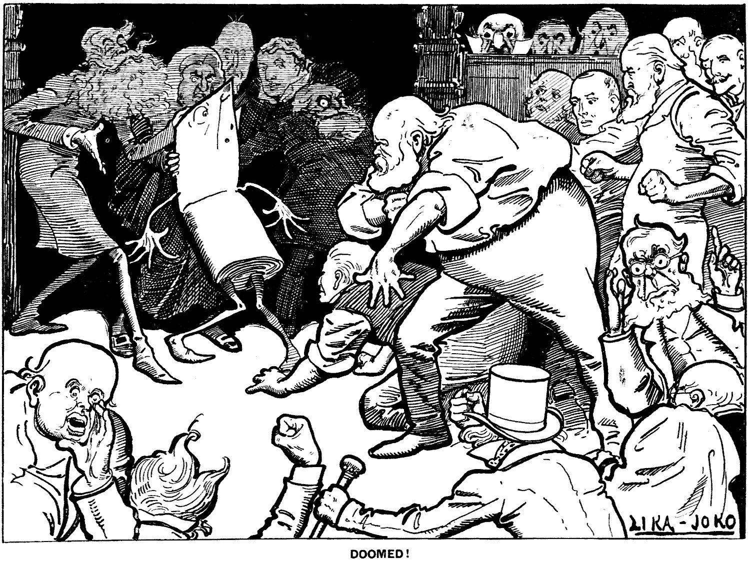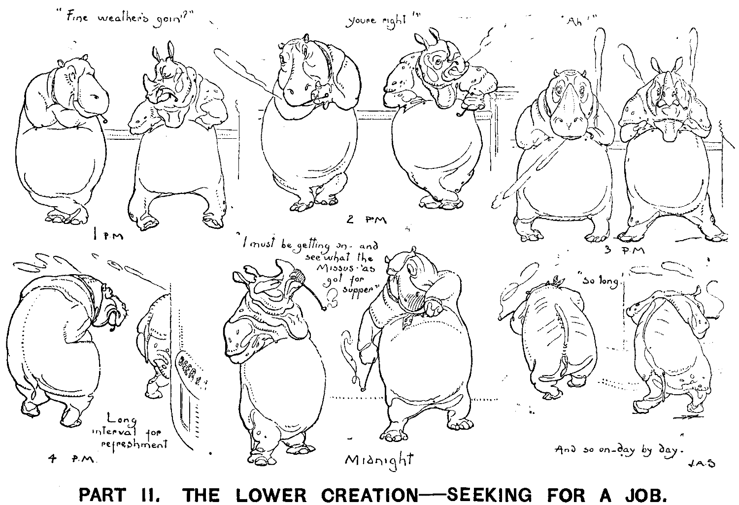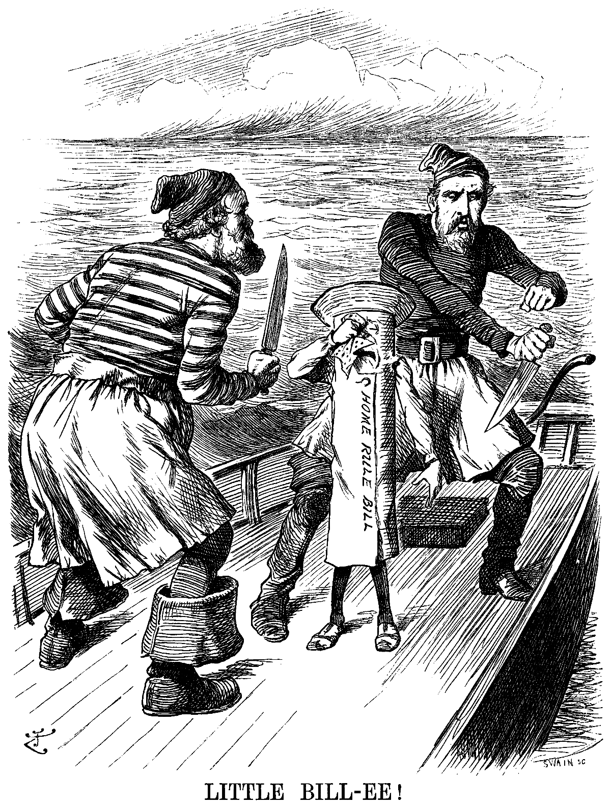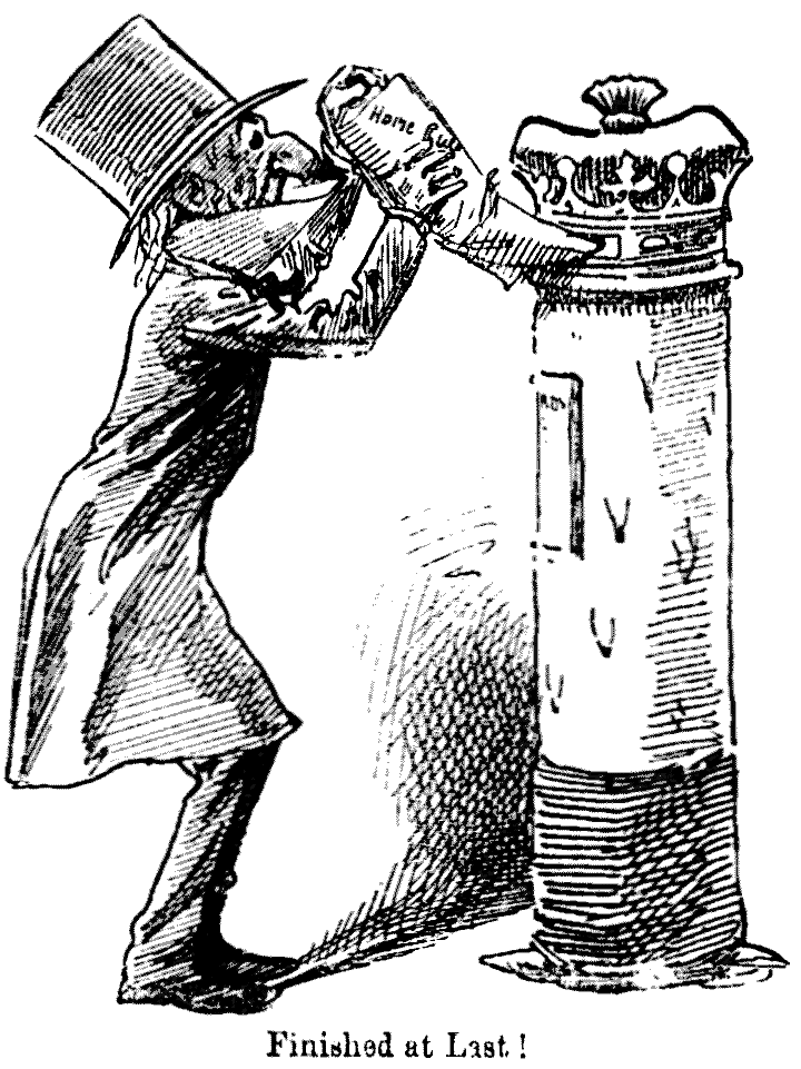 ["The alleged unemployed who assemble on Tower Hill are becoming worse even than mountebanks. One of the speakers declared yesterday that 'The secret societies of London are going to-night to wait on Mr. Gladstone, to ask what he is going to do. If the Prime Minister does not give a definite reply, they will take him on their backs and throw him into the Thames.'"—The Daily Telegraph, Sept. 1.]