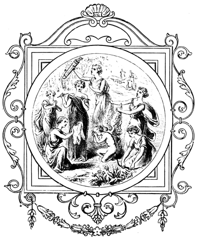 This book consisted of nearly a hundred Latin Epigrams, some original, some translated or paraphrased from the Greek, and each accompanied by a[x] rude woodcut illustration. Alciati was the first author who gave the name of Emblem to this form of expressing his ideas: and the notion for so doing was suggested by the original meaning of the word Emblem, which signifies anything inserted. The Greeks and Romans used to insert small pictures or bas-reliefs in the sides of vases, drinking-cups, and various other utensils: these little works of art were called Emblems: they were sometimes accompanied by mottoes or verses, and often made removable at pleasure, so that they formed no necessary part of the article which they adorned.