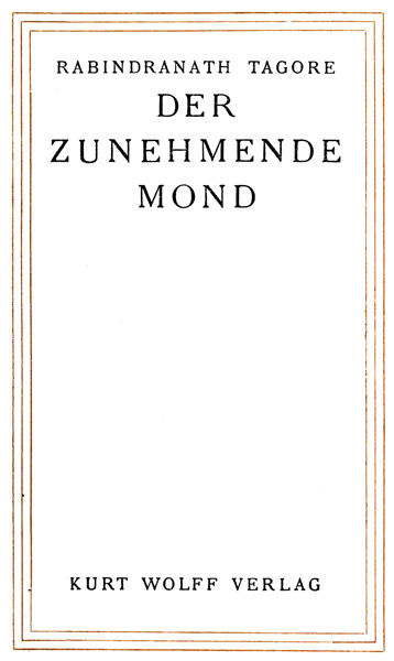 The Project Gutenberg EBook of Der zunehmende Mond, by Rabindranath Tagore This eBook is for the use of anyone anywhere at no cost and with almost no restrictions whatsoever. You may copy it, give it away or re-use it under the terms of the Project Gutenberg License included with this eBook or online at www.gutenberg.org Title: Der zunehmende Mond Author: Rabindranath Tagore Translator: Hans Effenberger Release Date: November 24, 2011 [EBook #38125] Language: German Character set encoding: UTF-8 *** START OF THIS PROJECT GUTENBERG EBOOK DER ZUNEHMENDE MOND *** Produced by Jana Srna and the Online Distributed Proofreading Team at https://www.pgdp.net (This file was produced from images generously made available by The Internet Archive/Canadian Libraries)