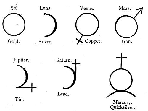 Thus the sun (Sol) was represented by a circle, which likewise became the symbol for gold, as being the most perfect metal. The moon (Luna) was ever changing; she was represented by a half-circle, which also symbolized the pale metal silver.